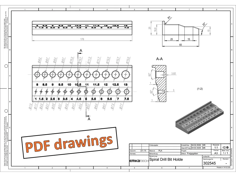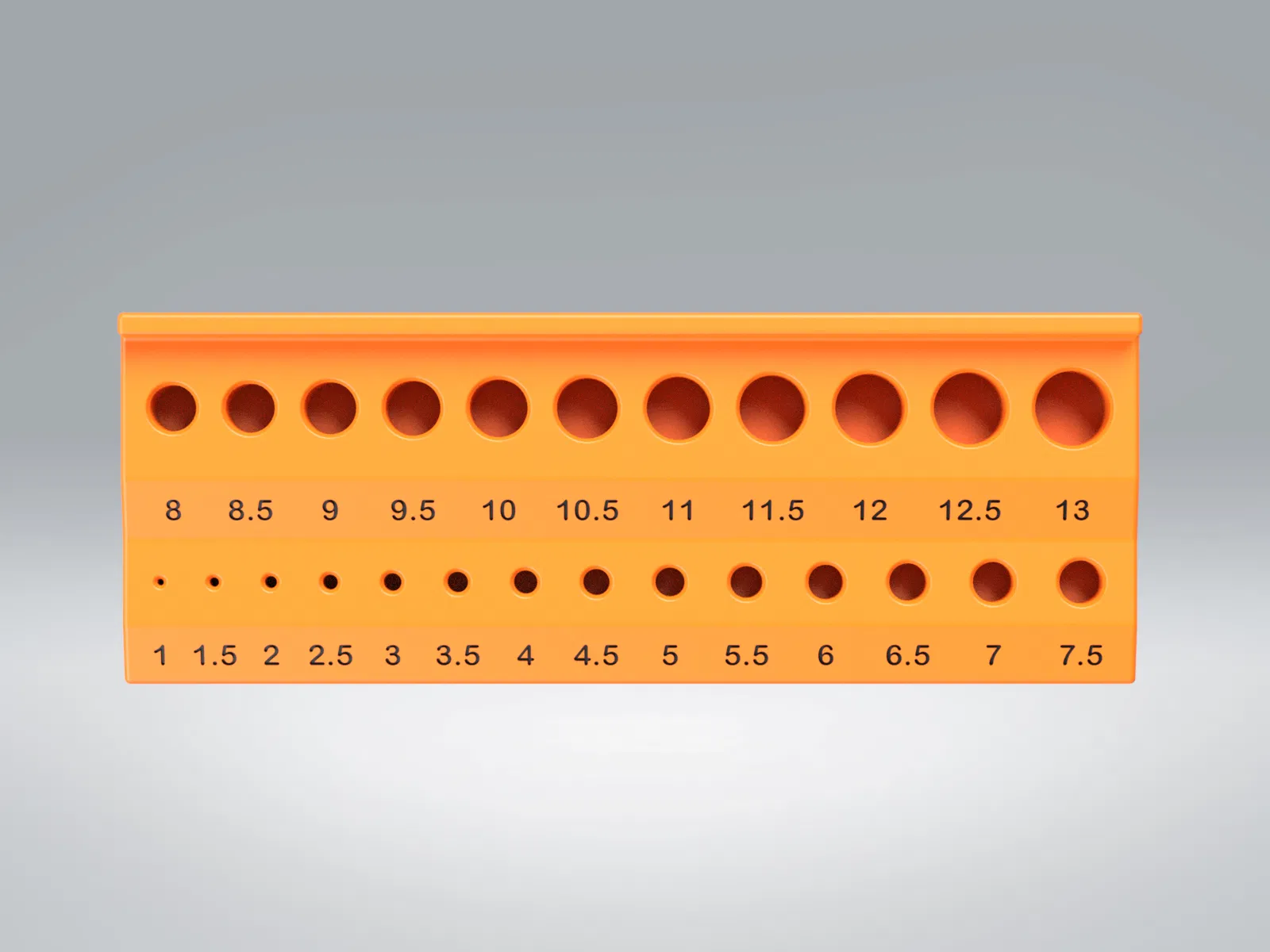 Khay/giá giữ mũi khoan này được thiết kế cho mũi khoan xoắn DIN 338, bao phủ đầy đủ các đường kính từ 1.0 mm đến 13.0 mm với bước tăng chính xác 0.5 mm. Tất cả kích thước đều được ghi nhãn rõ ràng, giúp mũi khoan của bạn gọn gàng, dễ nhìn và lấy ra nhanh. Rất hợp cho xưởng, maker, thợ chuyên nghiệp và bất kỳ ai muốn bố trí dụng cụ sạch sẽ, ngăn nắp.
