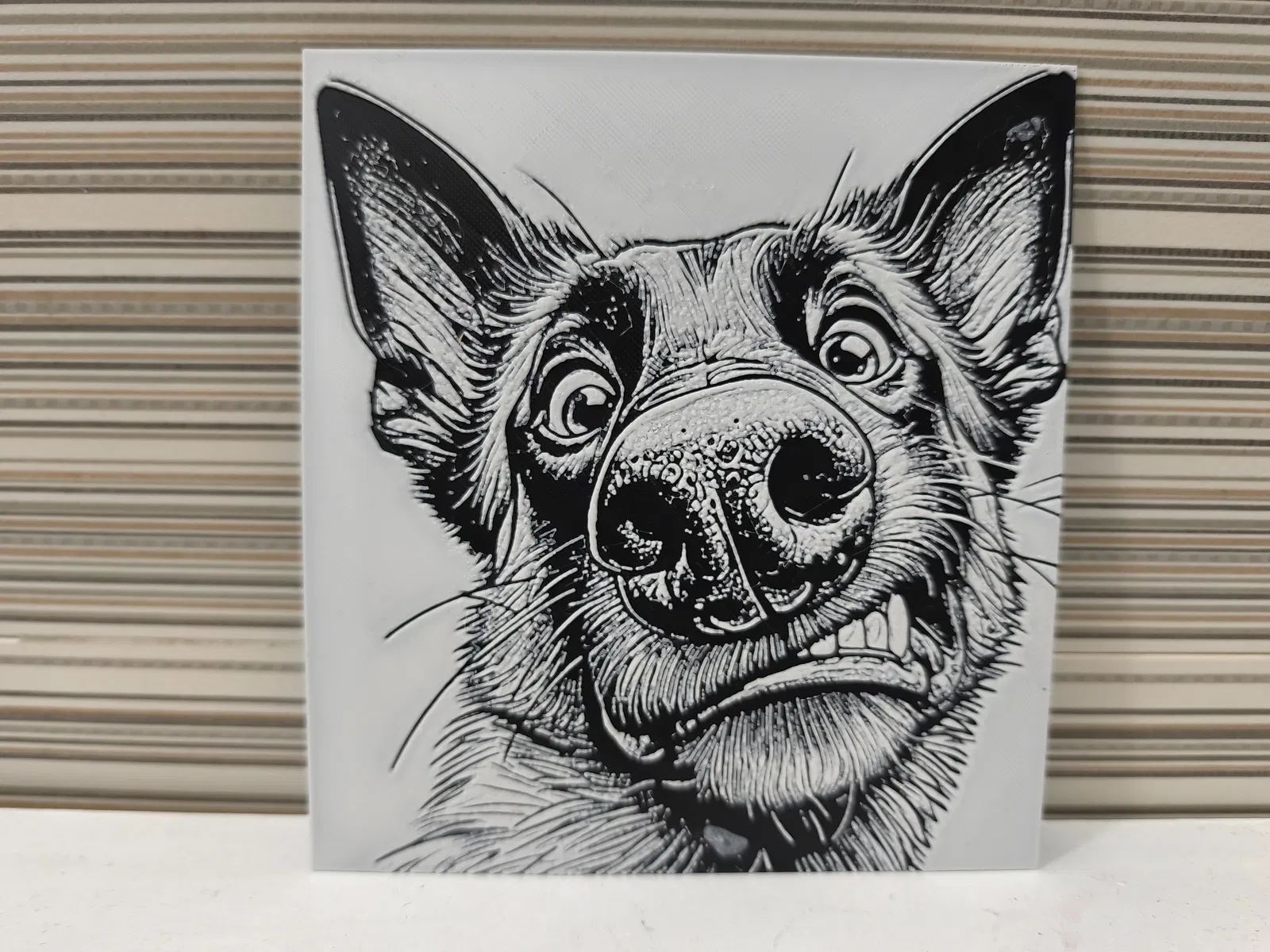 Mẫu Hueforge perro gracioso kiểu decor. In 100% infill, layer height 0.08mm, base layer 0.1mm. Bắt đầu Black, tới layer #7 (0.58mm) đổi sang Jade White cho phần còn lại.