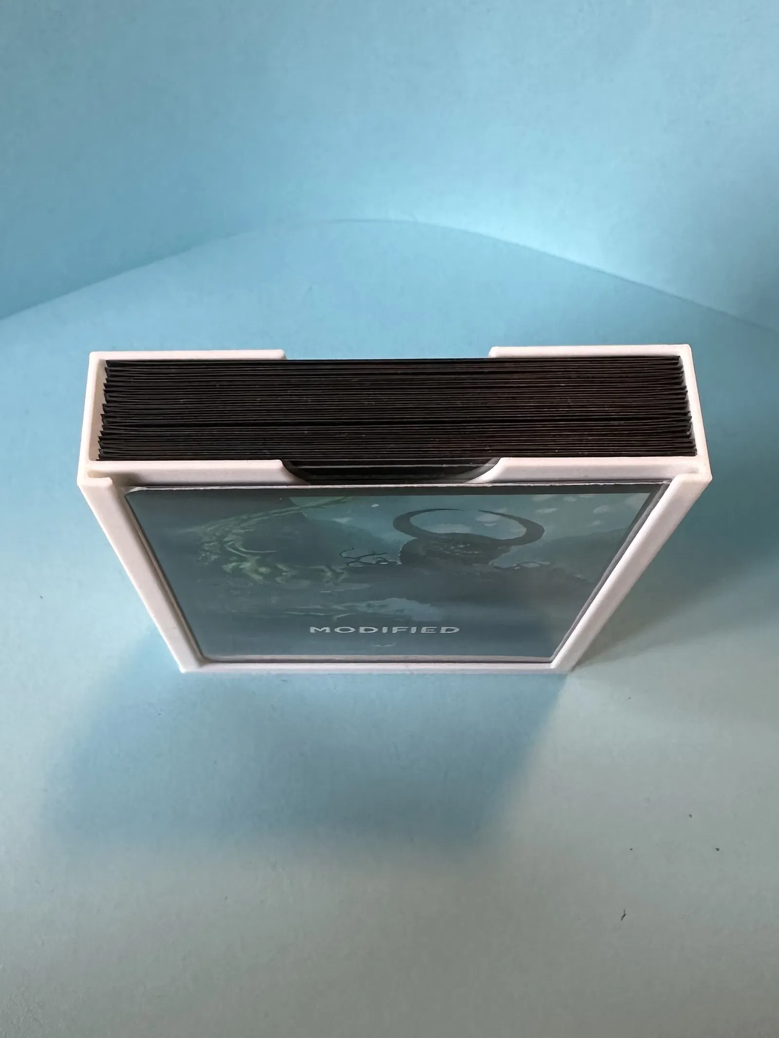 Mẫu hộp lưu trữ Magic: The Gathering Jumpstart được chỉnh lại phần cửa sổ trưng bày để dùng vừa các lá bài chỉ bọc inner sleeve, thay vì cần sleeve dày hơn như bản gốc.