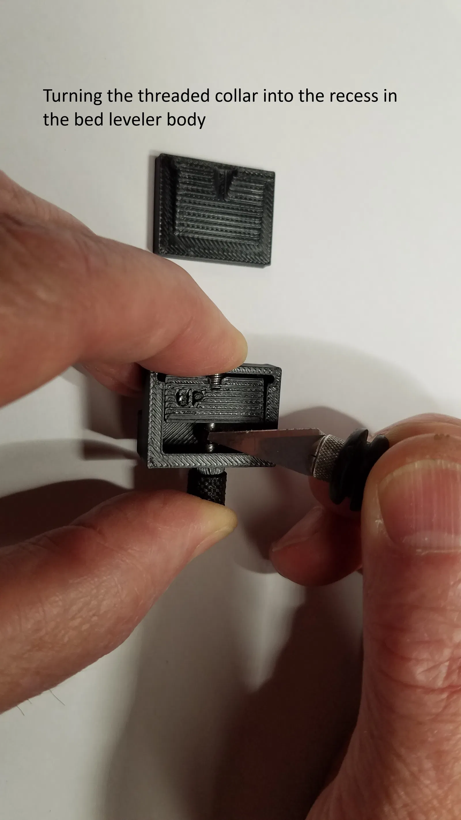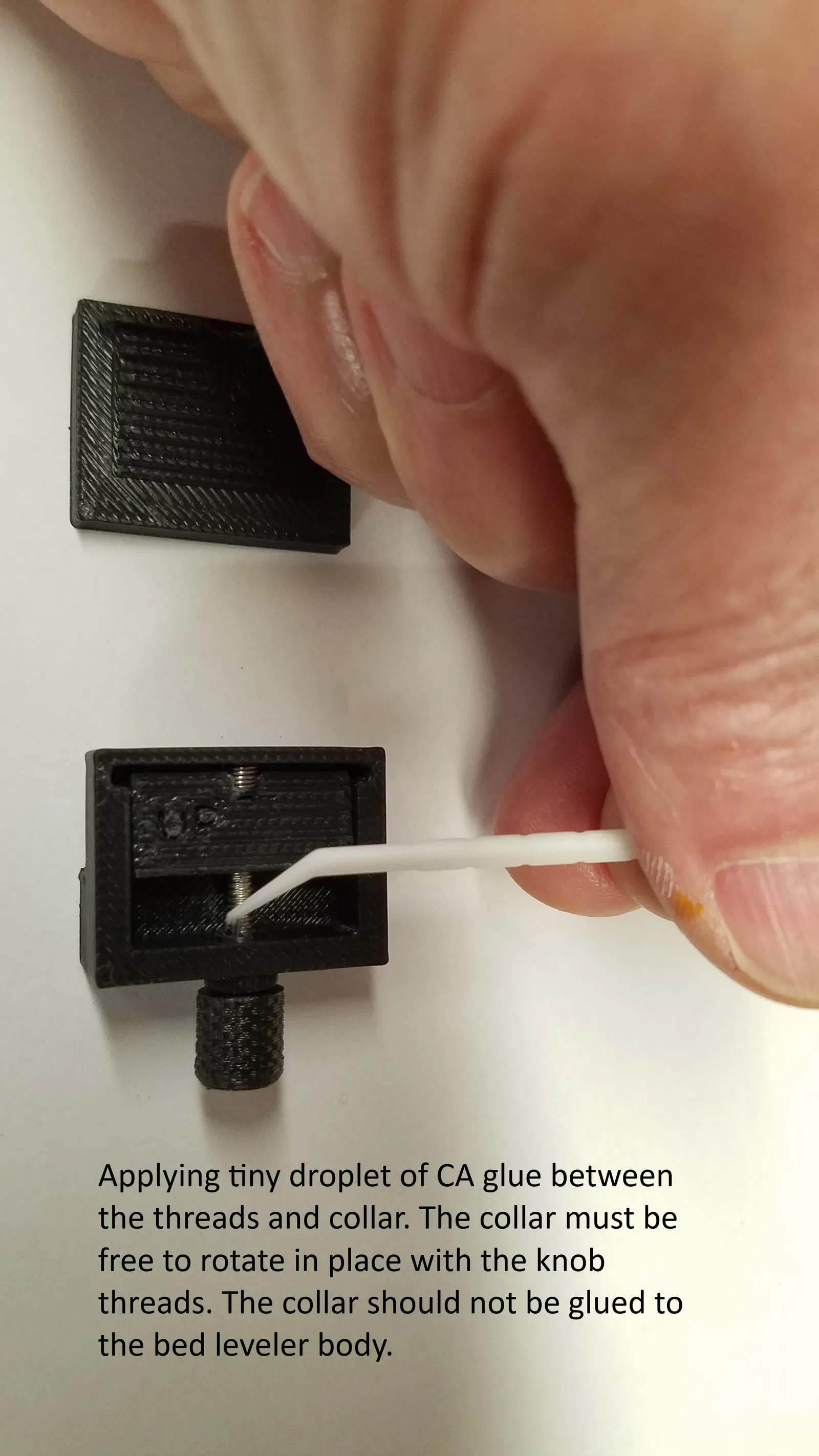 Một bước lắp ráp hơi khó là vặn cái vòng cổ ren (threaded collar) nhỏ vào phần hõm (recess) trong thân bed leveler. Hình minh họa cho thấy thao tác này được làm bằng mũi dao Exacto. Bước khó khác là nhỏ một giọt keo CA vào giữa ren của con ốc và cái collar. Cái collar phải xoay tại chỗ theo ren của núm vặn (knob) và không được dính keo vào thân bed leveler. Chức năng của collar là giữ cho núm chỉnh không bị trượt ra/vô theo phương dọc trong thân bed leveler.