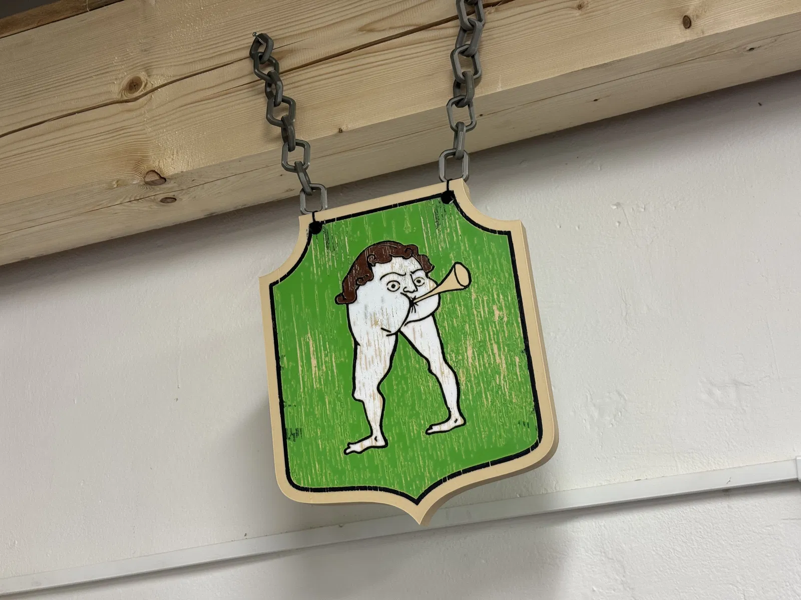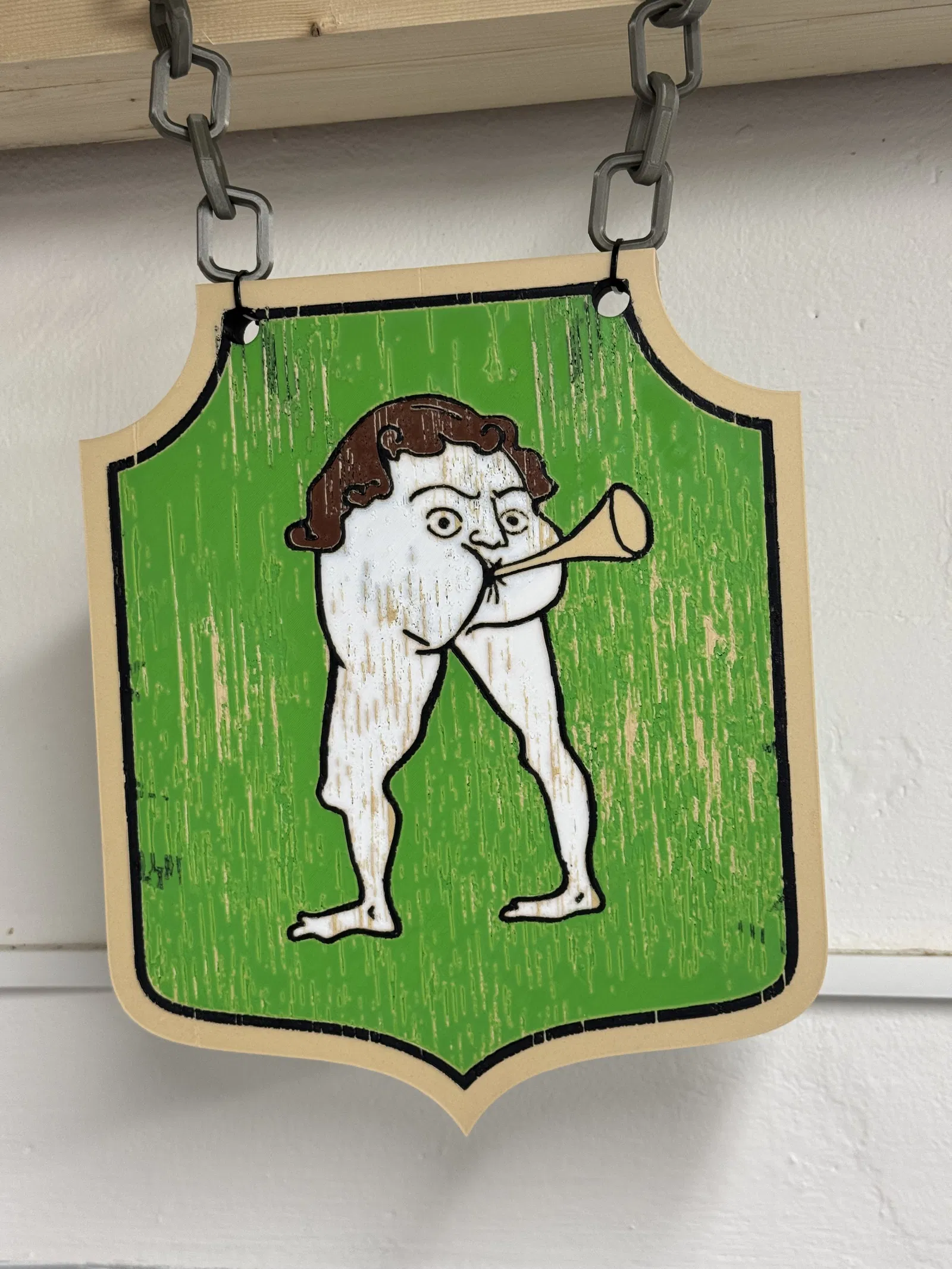 Mẫu bảng hiệu quán rượu trong Kingdom Come: Deliverance II với motif “the Butt Trumpet”. Nội dung gợi lại marginalia thời trung cổ: nhân vật thổi kèn bằng mông, vừa châm biếm vừa mang tính hài hước grotesque.