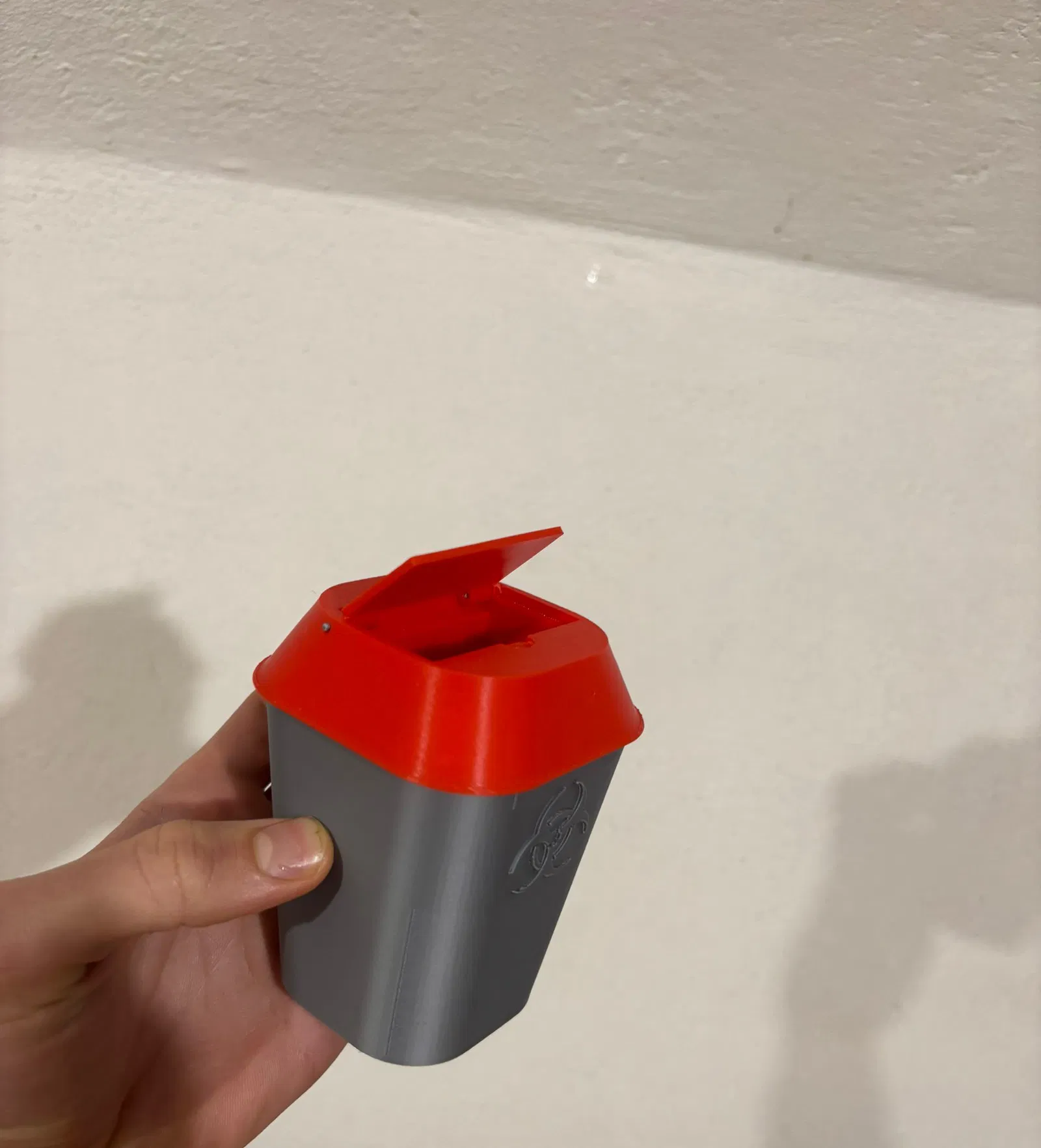 Hộp Biohazard nhỏ gọn để thu gom và cất lưỡi dao cạo, kim tiêm hoặc các vật sắc nhọn/y tế. Dùng một đoạn filament 1.75mm làm chốt bản lề nối nắp với thân. Thiết lập gợi ý: layer 0.2, infill Gyroid 5%.