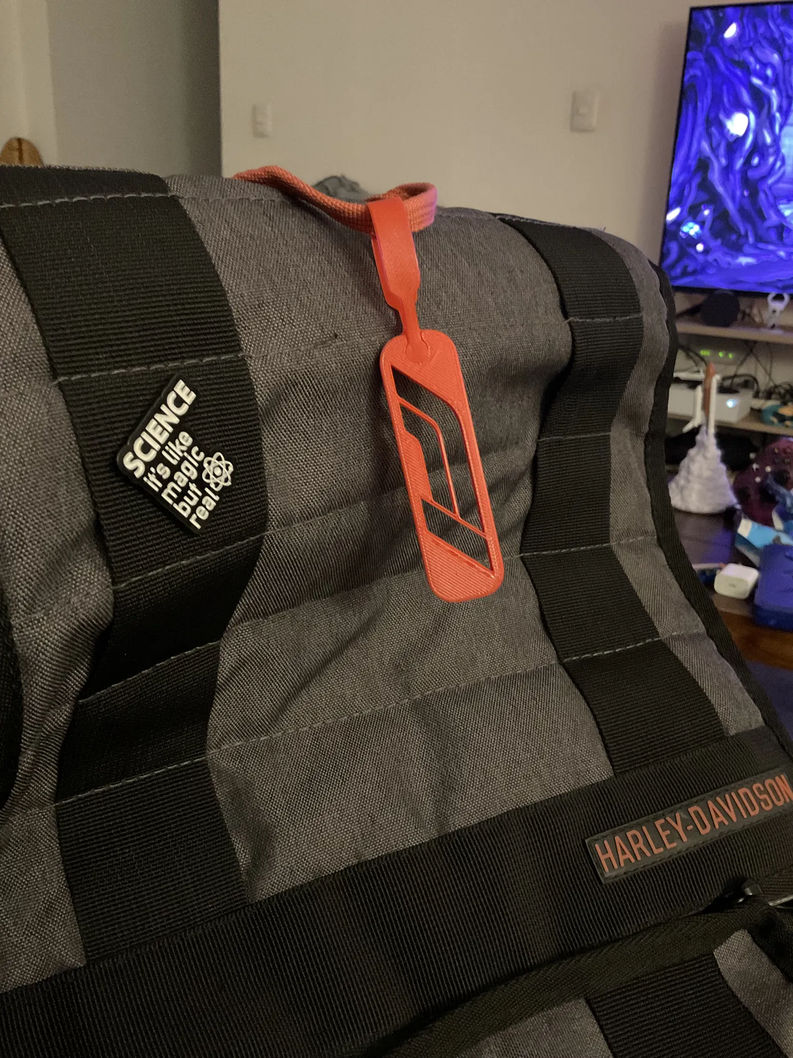Thẻ hành lý in 3D phong cách F1, gọn bền và dễ cá nhân hóa bằng file STEP. Tối ưu in PLA/PETG, không cần supports. Có thể chỉnh chữ, thông tin liên hệ và kích thước trước khi in.