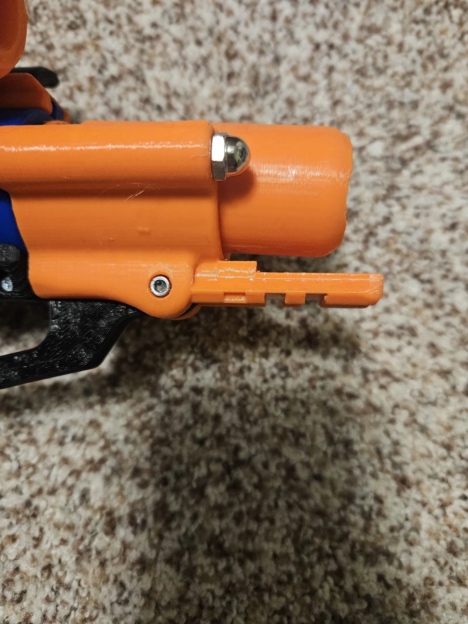Ejector kiểu Widlstyle có tích hợp ray picatinny. Khuyến nghị in với 3+ walls và infill từ 20% trở lên. Tương thích cơ chế back lever và button ejector, phù hợp cho các bản độ Nerf.