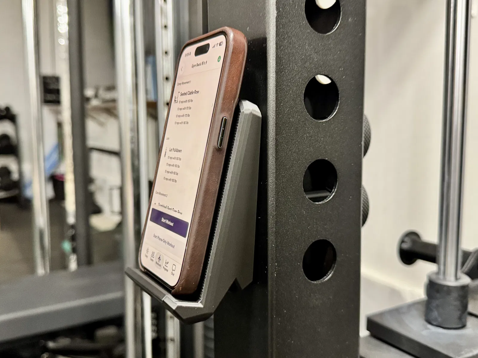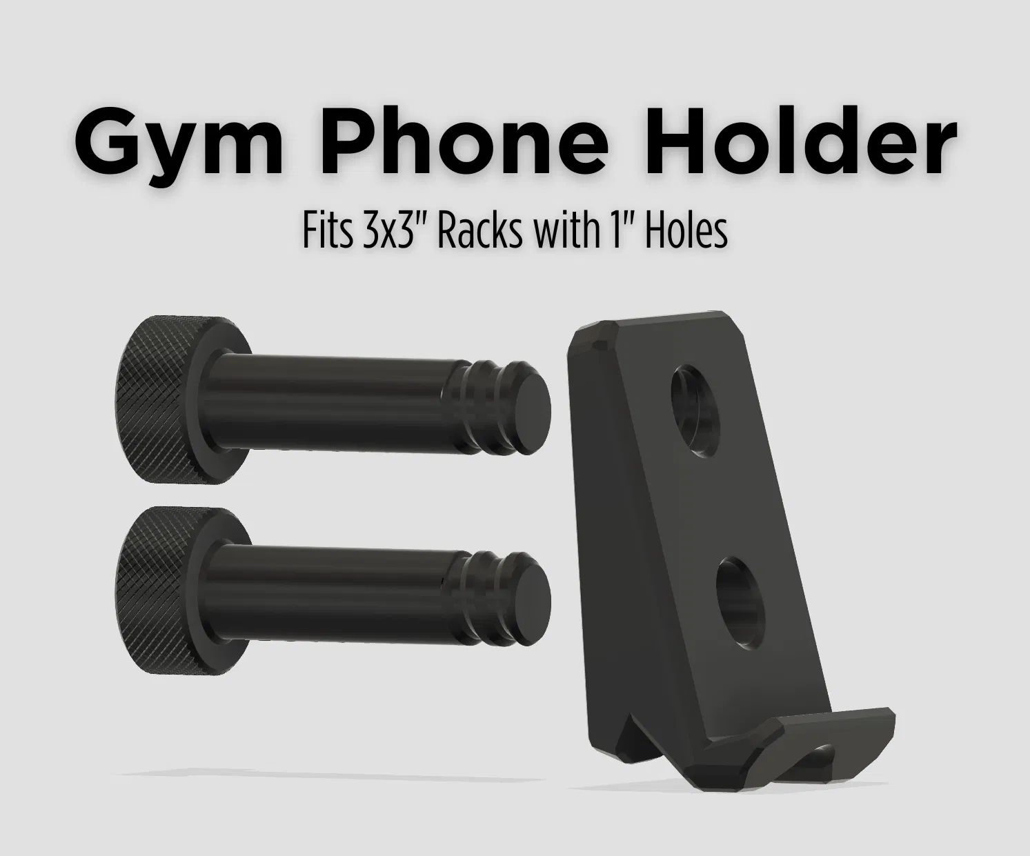 Giá đỡ điện thoại in 3D gắn lên squat rack/power rack 3x3 có lỗ 1" (spacing 2"). Dùng 2 printed bolts (1 con cũng đủ chắc), in đúng hướng, không cần supports. Có áp dụng Cruller Threads.