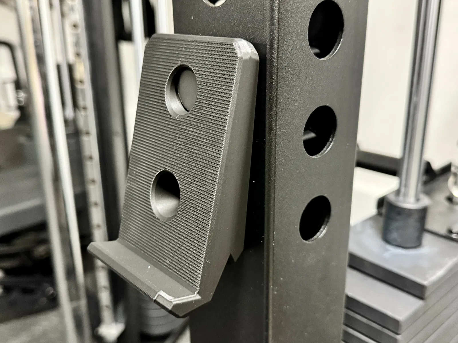 Giá đỡ điện thoại in hoàn toàn và siêu bền, gắn lên squat rack 3x3 với lỗ 1" và khoảng cách lỗ 2".