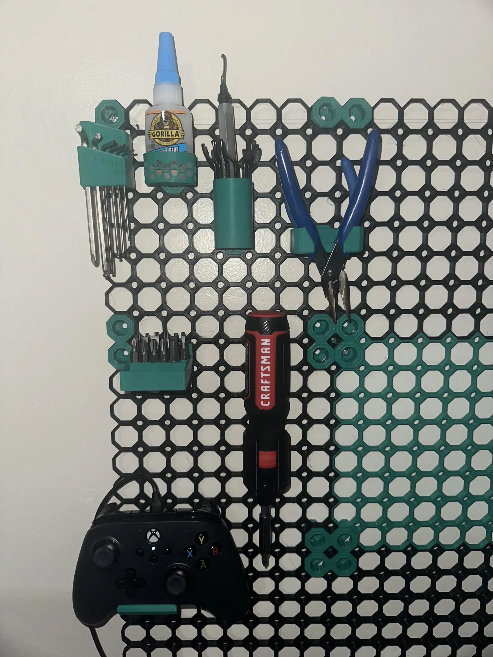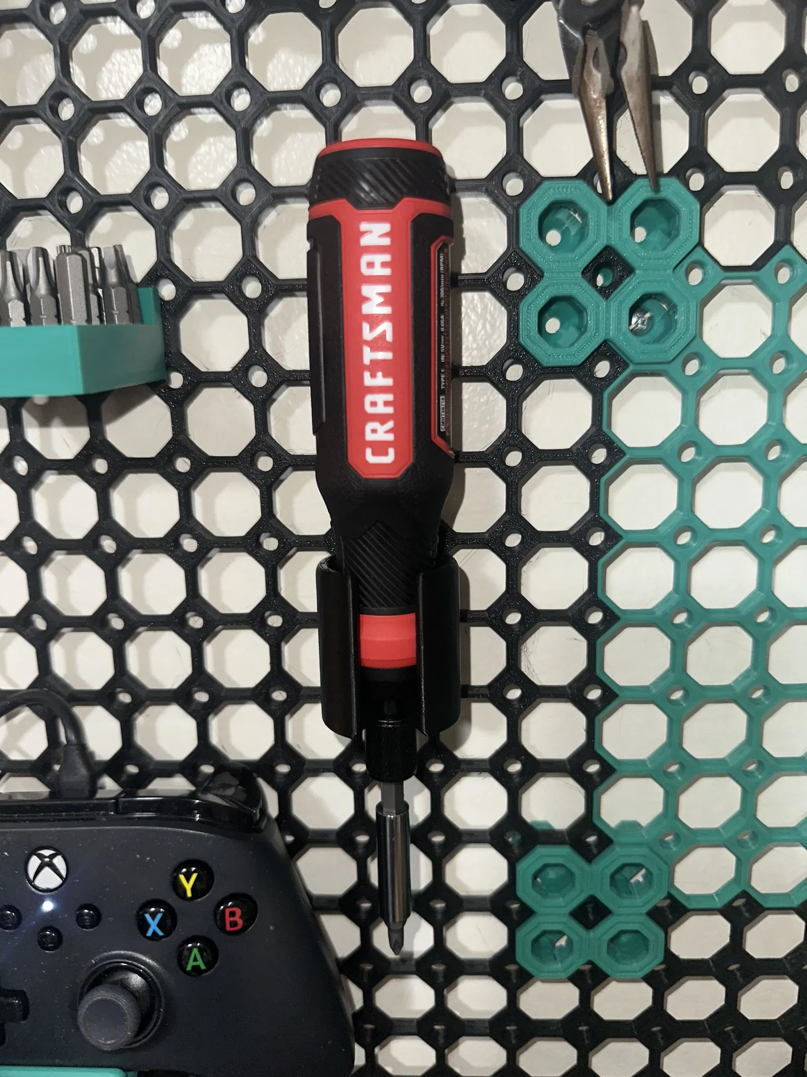 Mình remix cái push fit peg và làm thêm thiết kế riêng để treo/giữ máy vặn vít điện Craftsman 4V của mình. Dùng được cả khi có hoặc không gắn sẵn cái bit extender đi kèm trên máy. Dung sai của pushfit peg mình làm khá sát nên sẽ hơi khít.