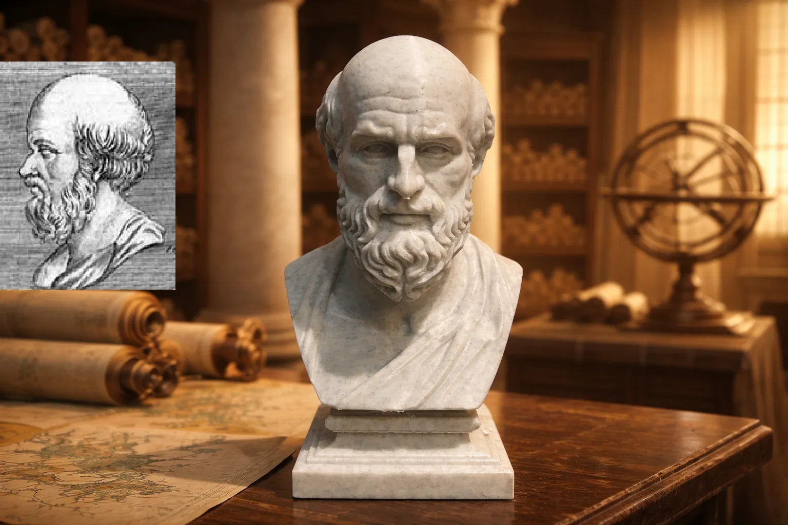 Bức tượng bán thân này khắc họa Eratosthenes xứ Cyrene, một học giả Hy Lạp cổ đại và là một trong những trí thức có ảnh hưởng nhất của thế giới Hy Lạp hóa. Đây là một diễn giải điêu khắc trung thành, lấy cảm hứng từ chân dung được biết đến rộng rãi và được tái bản phổ biến nhất của nhân vật lịch sử, như được truyền lại qua các bản khắc cổ điển và những cách thể hiện truyền thống.