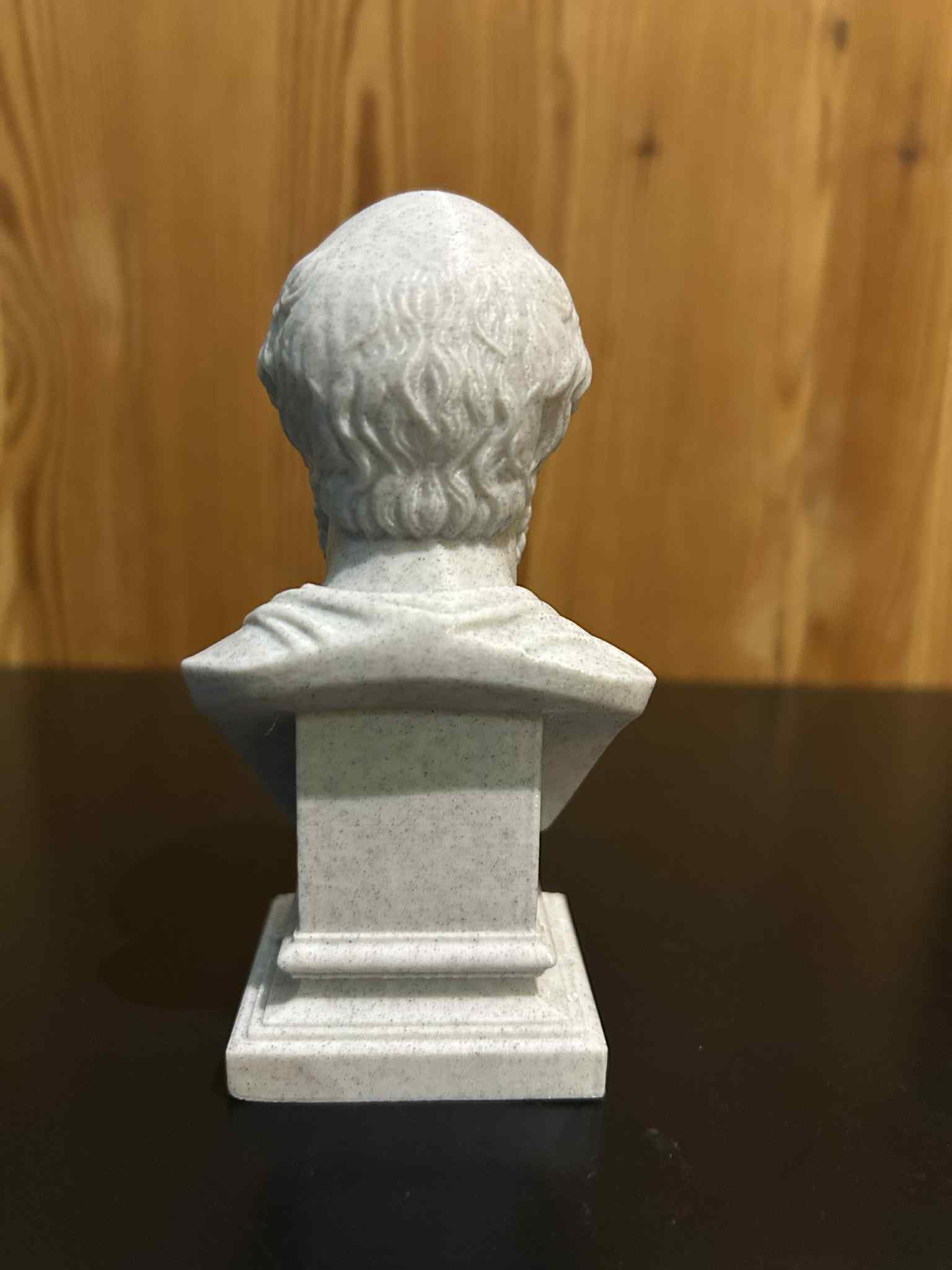 Khuôn mặt được xử lý theo đúng tinh thần tượng bán thân cổ điển: tỷ lệ chuẩn, biểu cảm trung tính và trầm tư, đặc biệt chú trọng khối hộp sọ, các đường nét gương mặt rõ, cùng cấu trúc râu và tóc. Tổng thể ưu tiên cảm giác rõ ràng, vượt thời gian, không tô vẽ quá đà, đúng với tinh thần các pho tượng cổ dành cho học giả và triết gia.