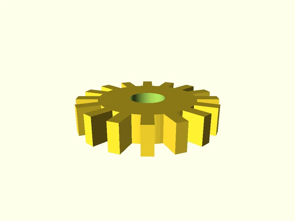 Mình lười vẽ gears nên dùng file của Catarina Mota (gear_spur.scad). Mình in bằng ABS, infill tuỳ khẩu vị.