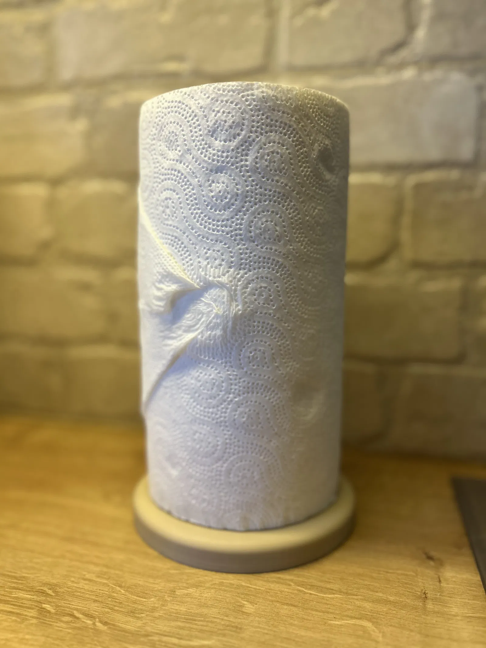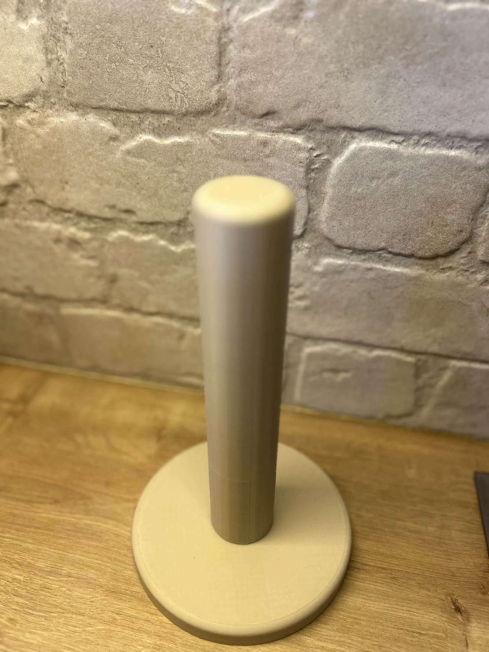 Kệ để giấy lau tay tối giản gồm đế tròn và ống trụ có chốt định vị. Dán bằng keo cyanoacrylate để lắp chắc, cân bằng tốt. Thiết kế tối ưu cho in 3D, không cần supports, hợp dùng trong bếp.