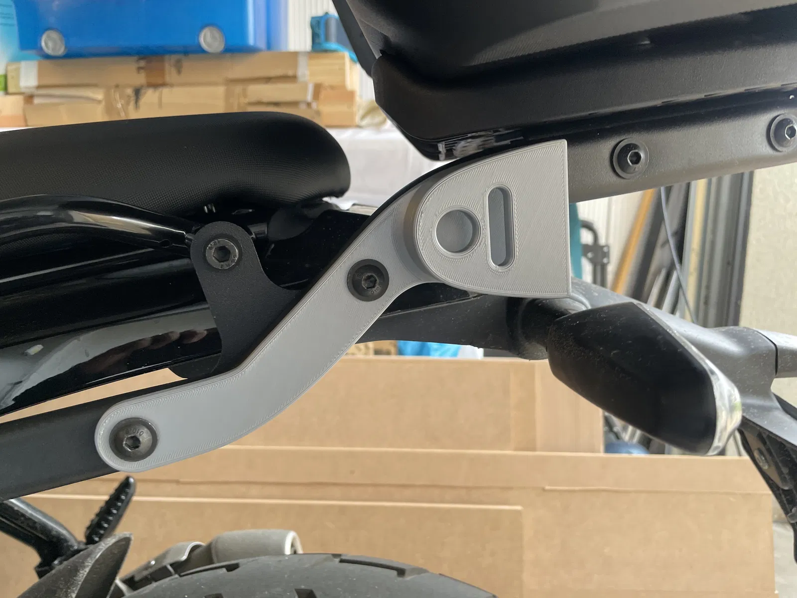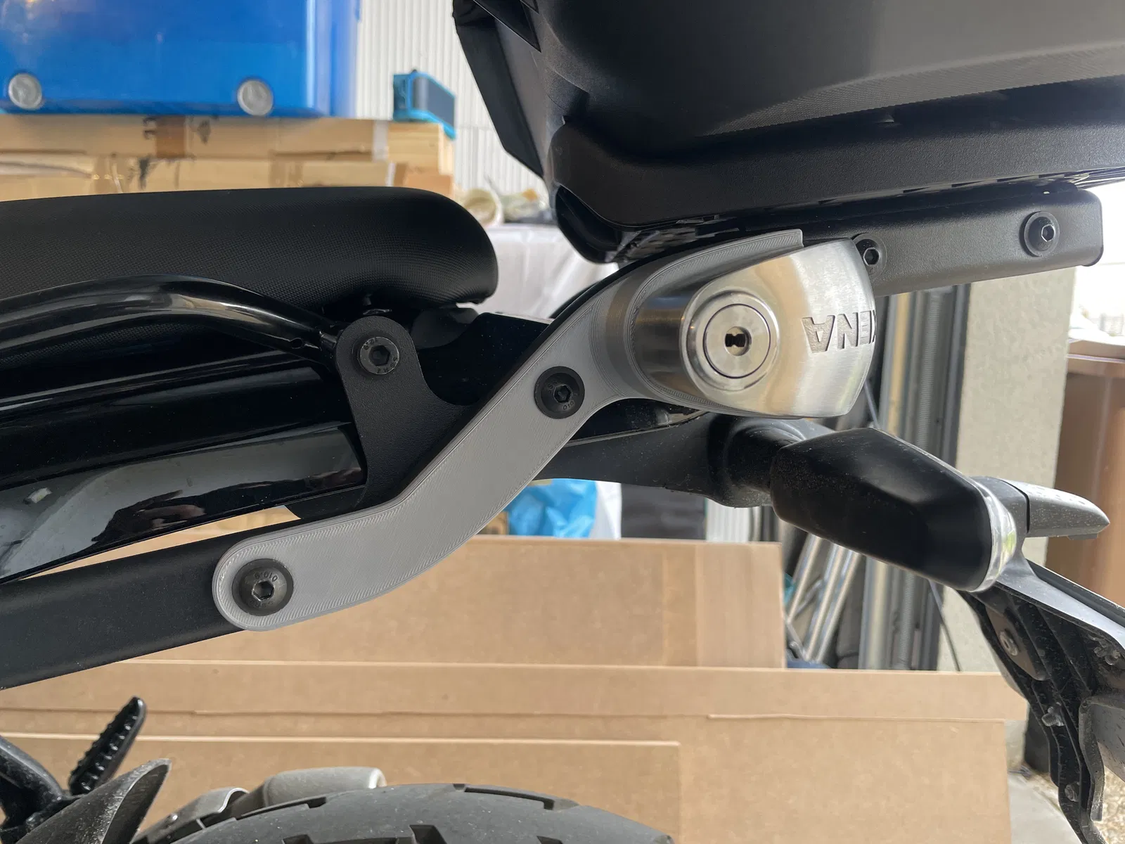 Giá đỡ đơn giản mà hữu dụng để mang theo khóa đĩa Xena XX14. Lắp trên Royal Enfield Guerrilla có baga Givi top case, giúp cất giữ chắc chắn và thao tác lấy/đặt khóa nhanh, tiện hơn balo hay top case.