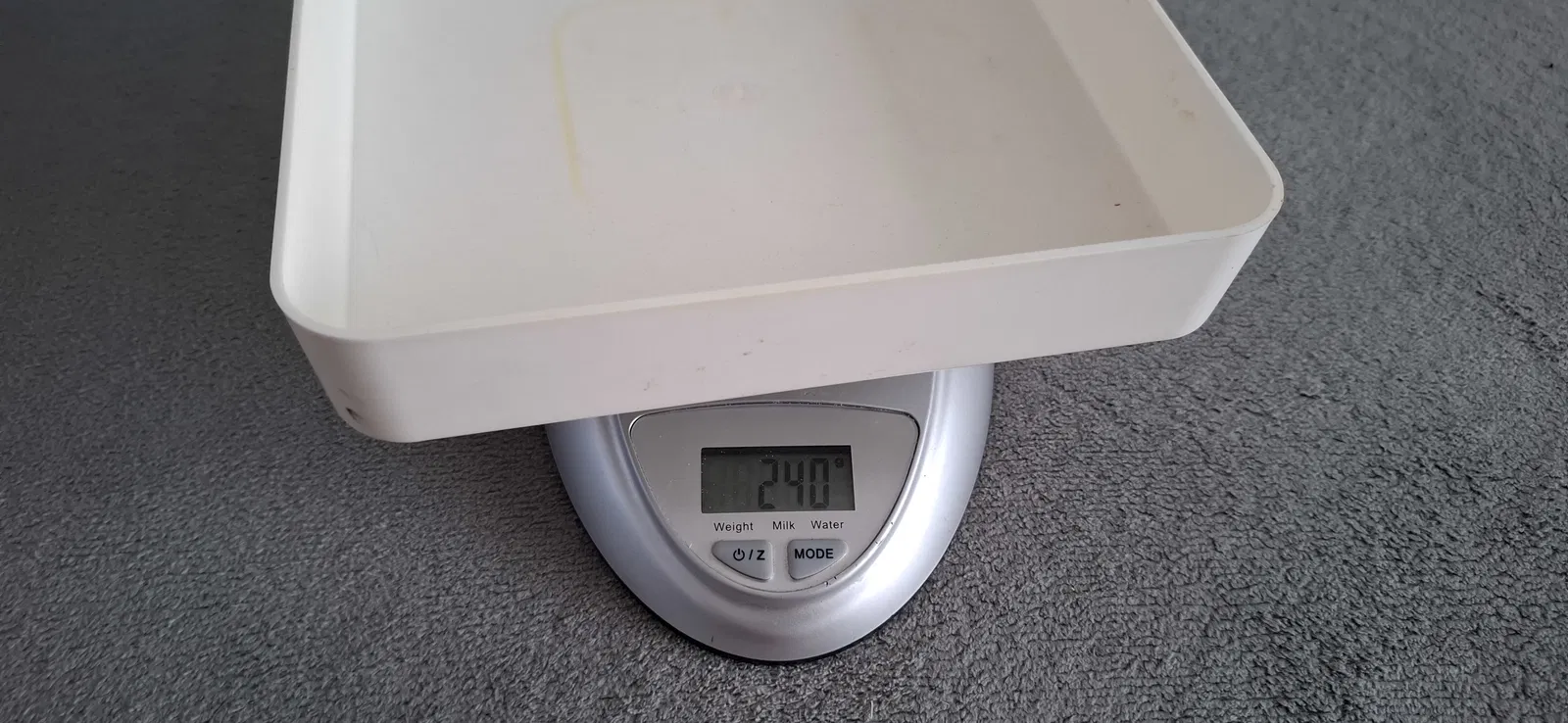Miska cho cân treo Kovozávody Semily. In trên Ender 3 v3 SE, cần mở rộng vùng in trong slicer lên 230x230. In file 1-2 infill 100%, rồi in 2-2 sao cho tổng khối lượng gần 240g; dán bằng keo 502.