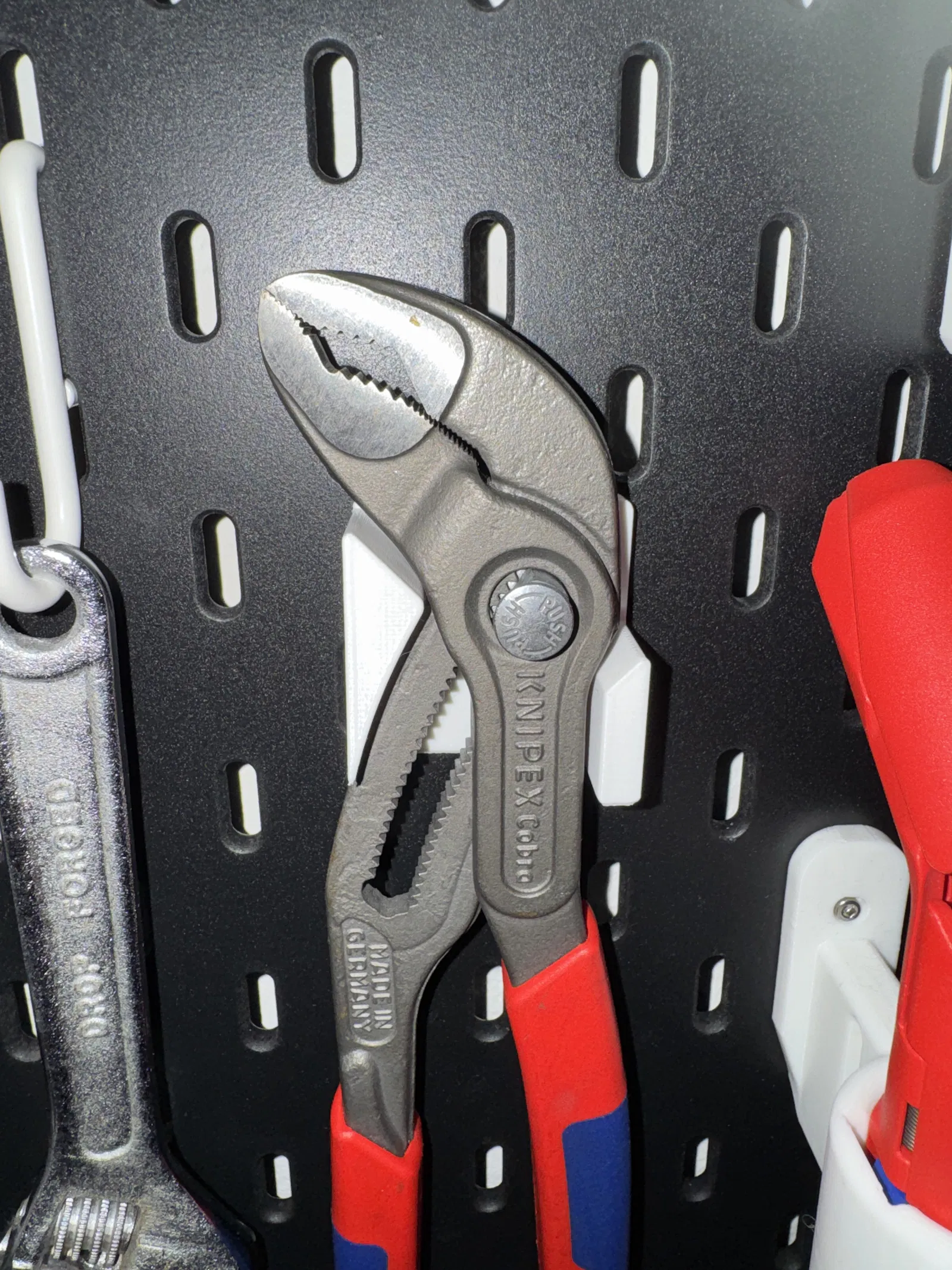 Holder gắn lên pegboard Ikea Skadis để treo kìm Knipex Cobra 250mm (87 02 250). Chỉ vừa đúng bản 250mm, không dùng được cho bản nhỏ hơn hay lớn hơn. Khi in nên thêm supports; lắp cần 1 M2.5 Skadis T-Nut và 1 vít M2.5.