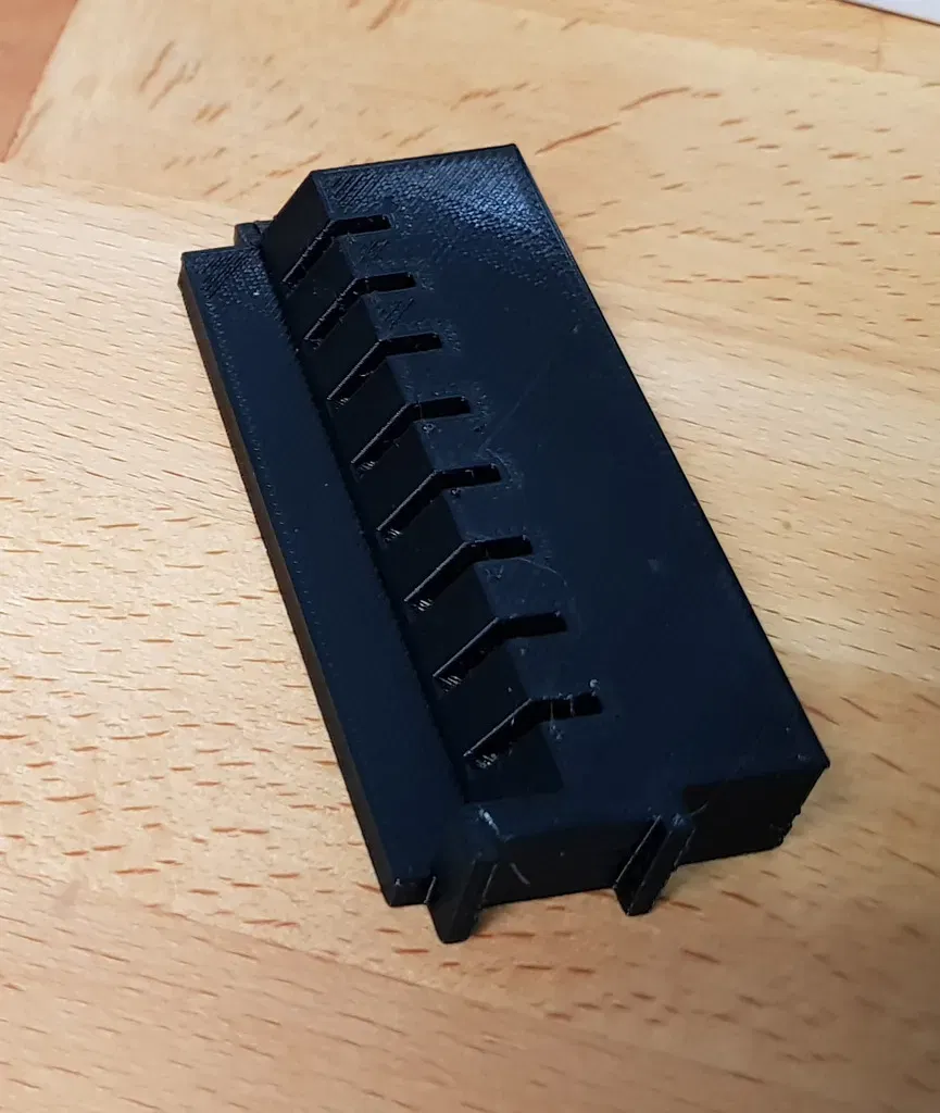 Tôi đã giảm mật độ đóng gói của các lưỡi để dễ dàng lấy từng lưỡi ra. Kẹp trên có thể lưu trữ các lưỡi chỉ hướng ngược lại để bù đắp cho điều đó. Độ lệch của kẹp trên là vì tôi có một lưỡi dài 117mm. Độ lệch tạo không gian cho điều đó.