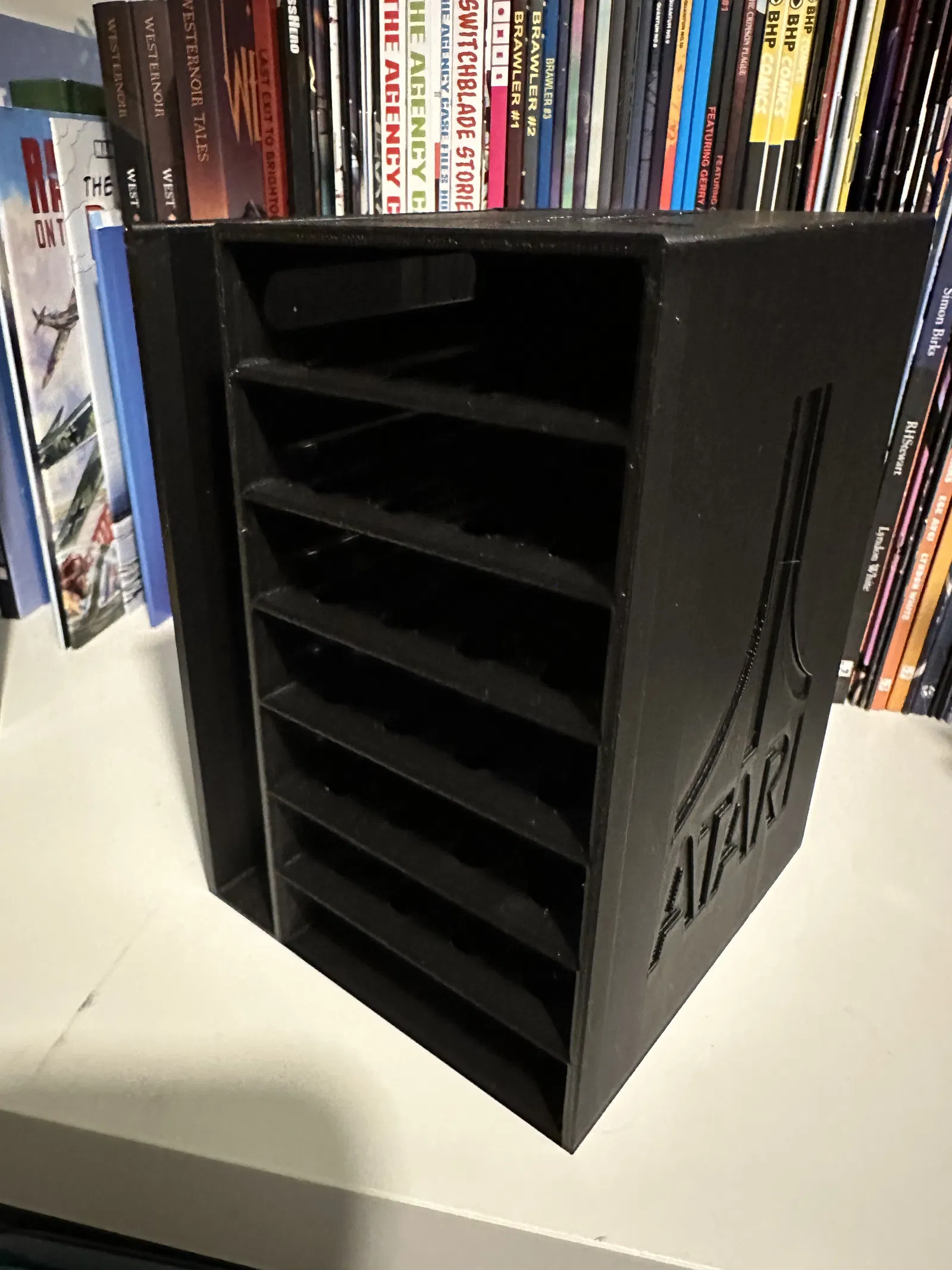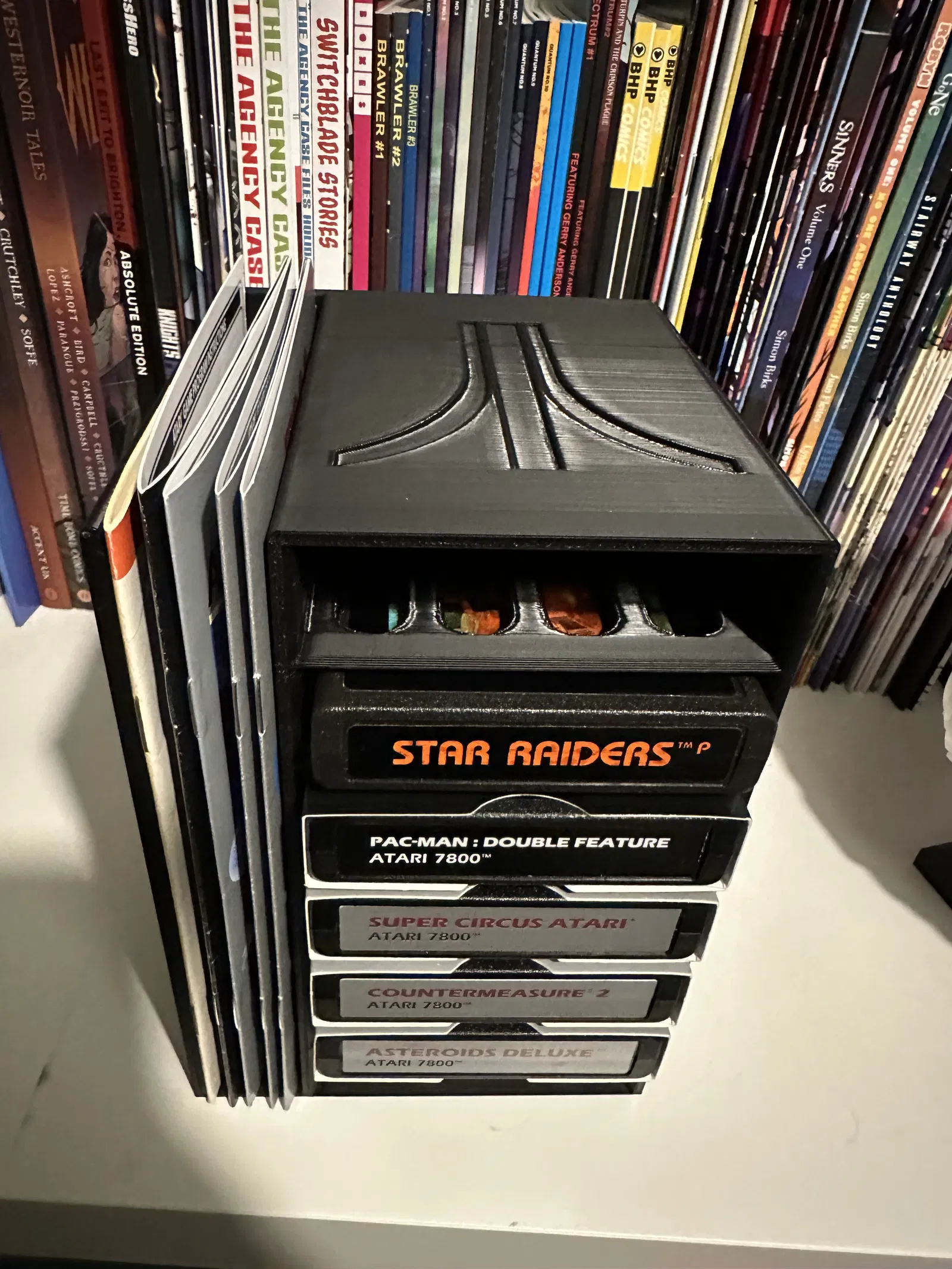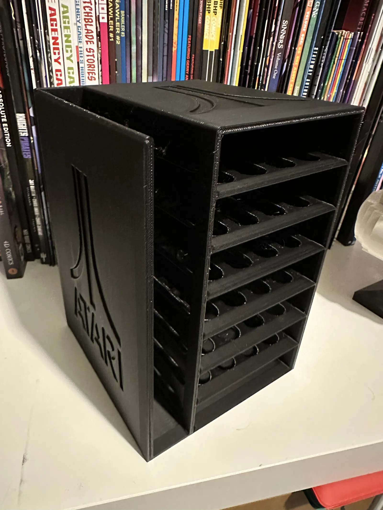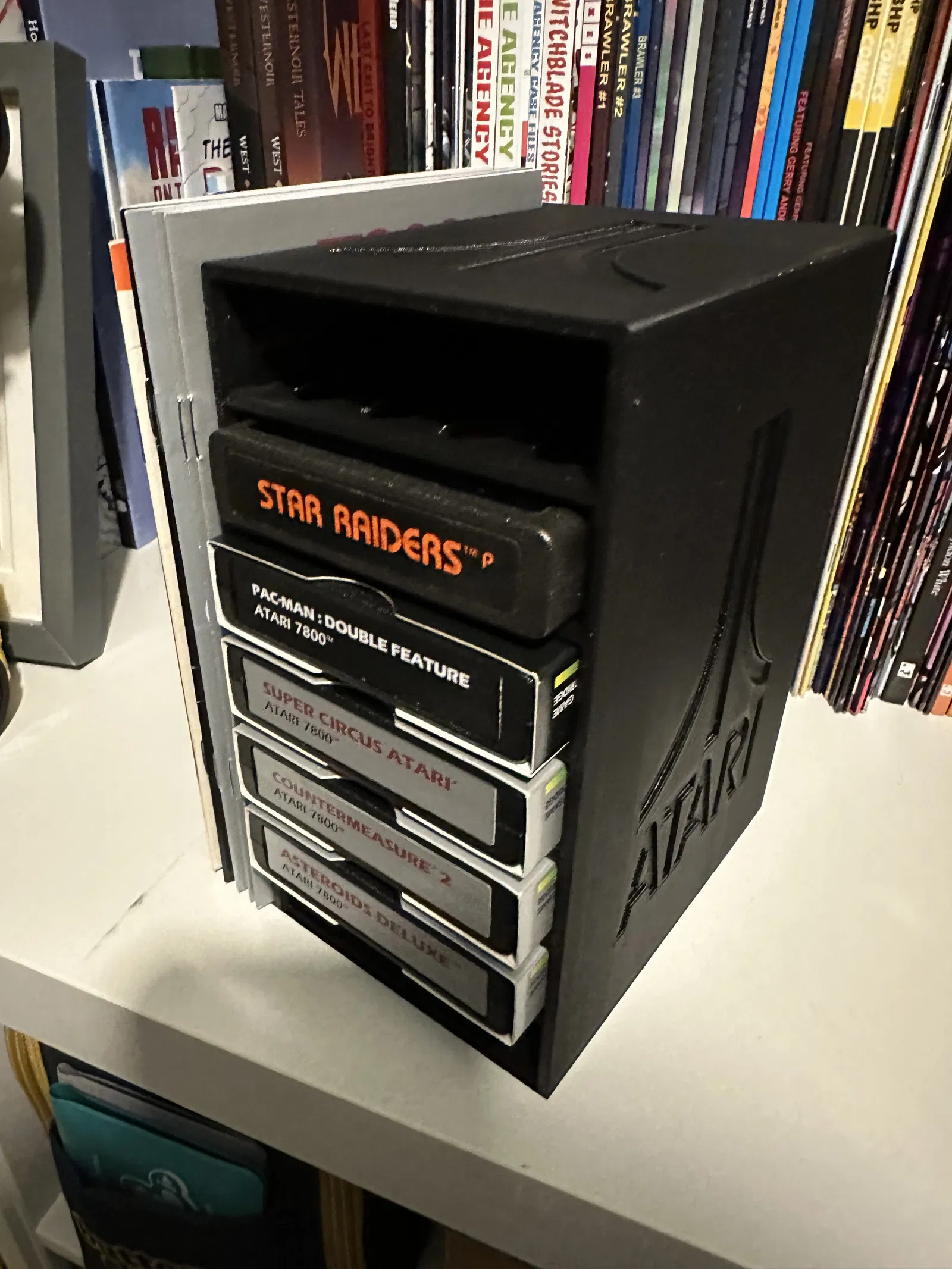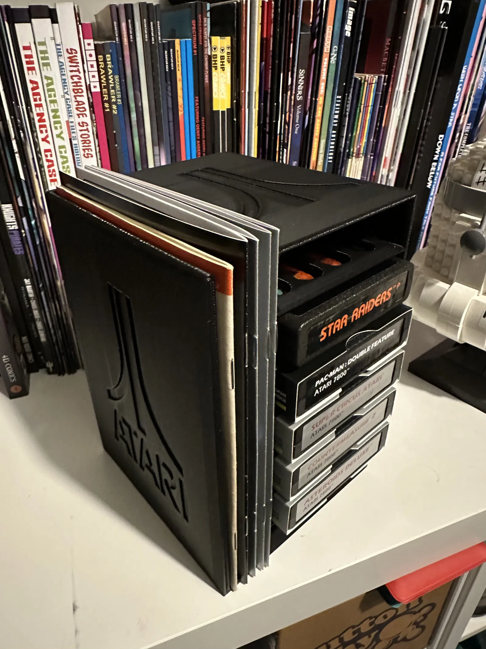 Mình mới mua một máy Atari 2600+ Pac-Man Edition cùng vài game mới, nên muốn có một cái giá đỡ không chỉ để cất cartridge mà còn để luôn sách hướng dẫn.