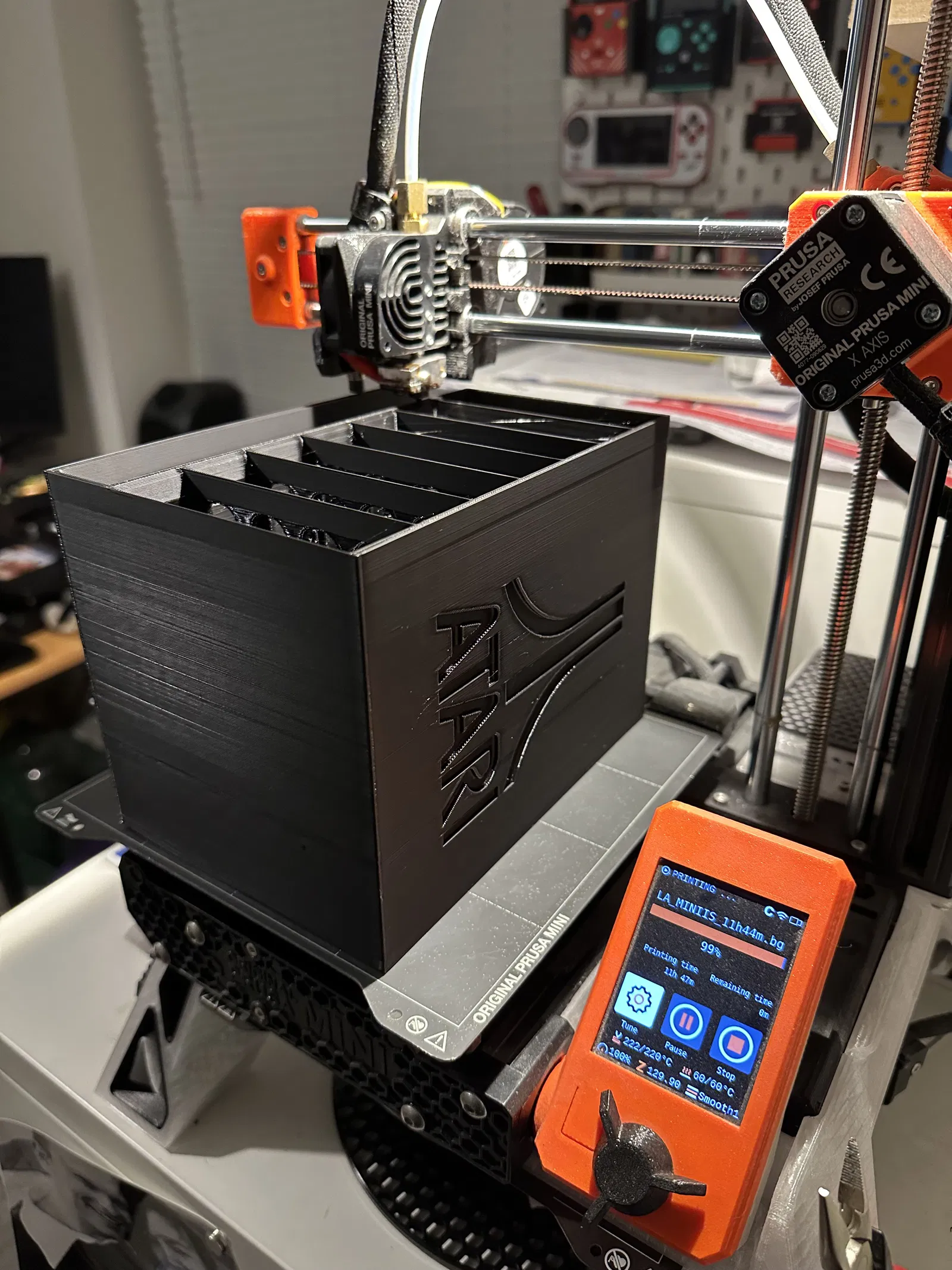 Giá đỡ dùng để lưu trữ 7 cartridge Atari 2600/7800 kèm sách hướng dẫn. Thiết kế tối ưu để in trên Prusa Mini+ không cần supports, bản in dài (~394g filament), dựng bằng Siemens NX.