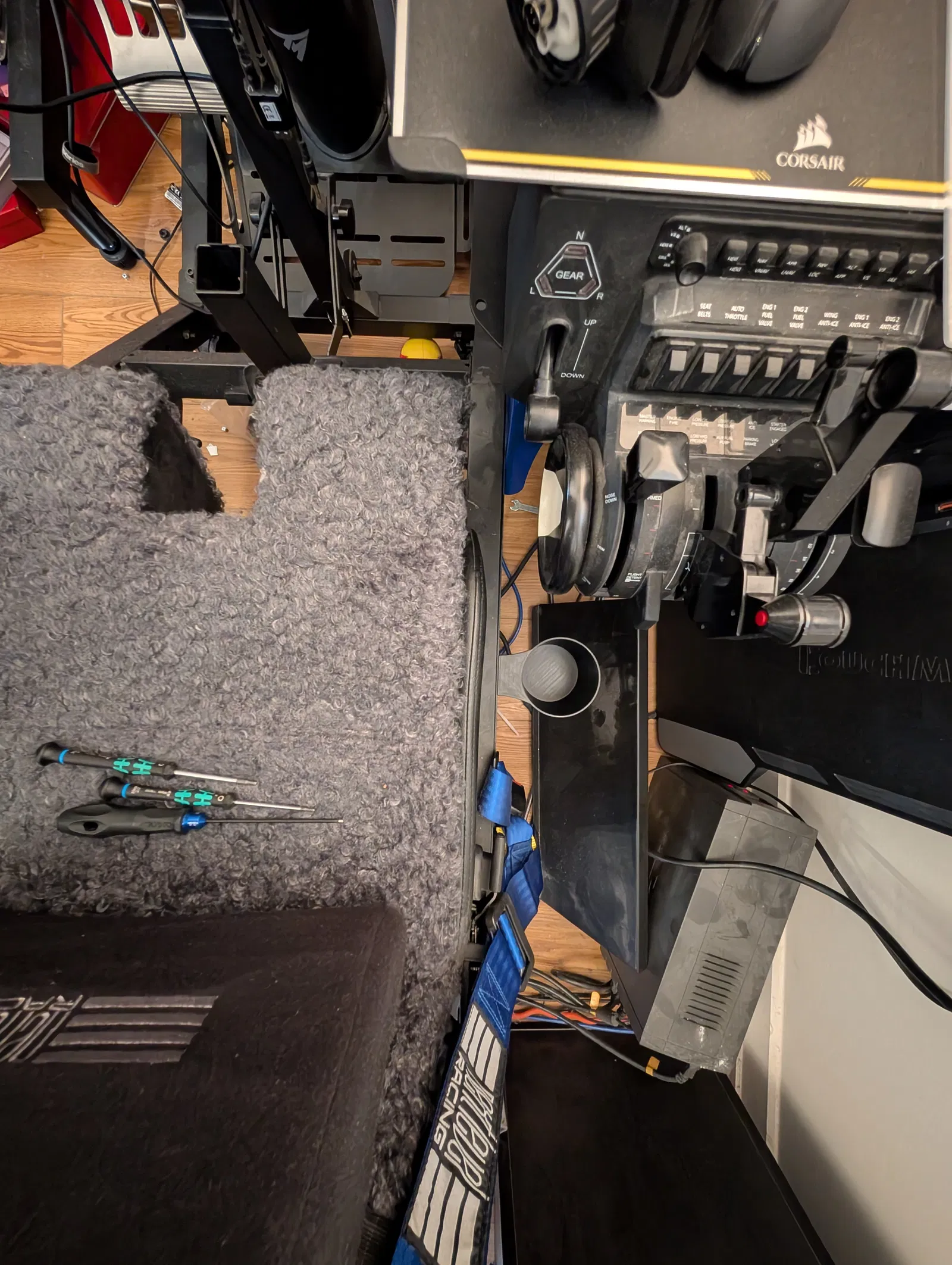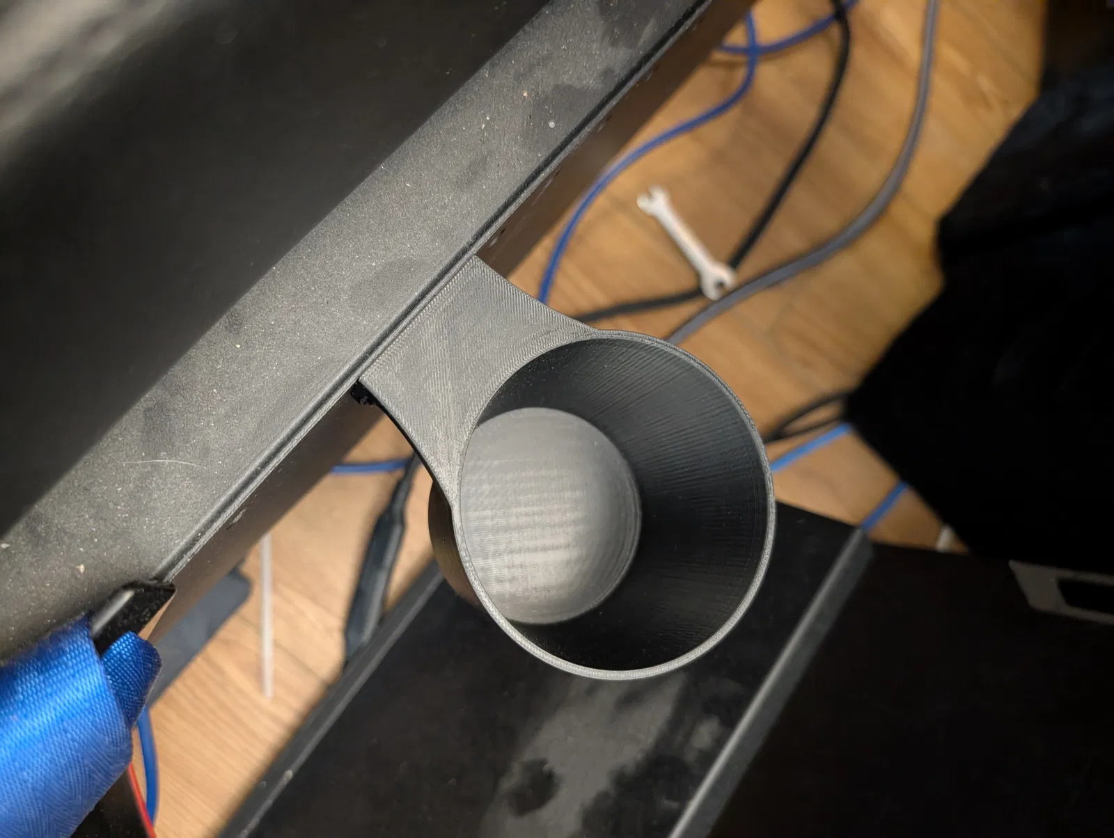 Mình muốn có một chỗ để ly/nước cho bộ setup flight simulator, nên mình dựng nhanh mẫu này rồi in luôn. Mình dùng tree supports để đỡ phần mounting tab, và dùng đúng các con bolts đi kèm bộ flight sim để bắt nó vào cạnh bên ghế.