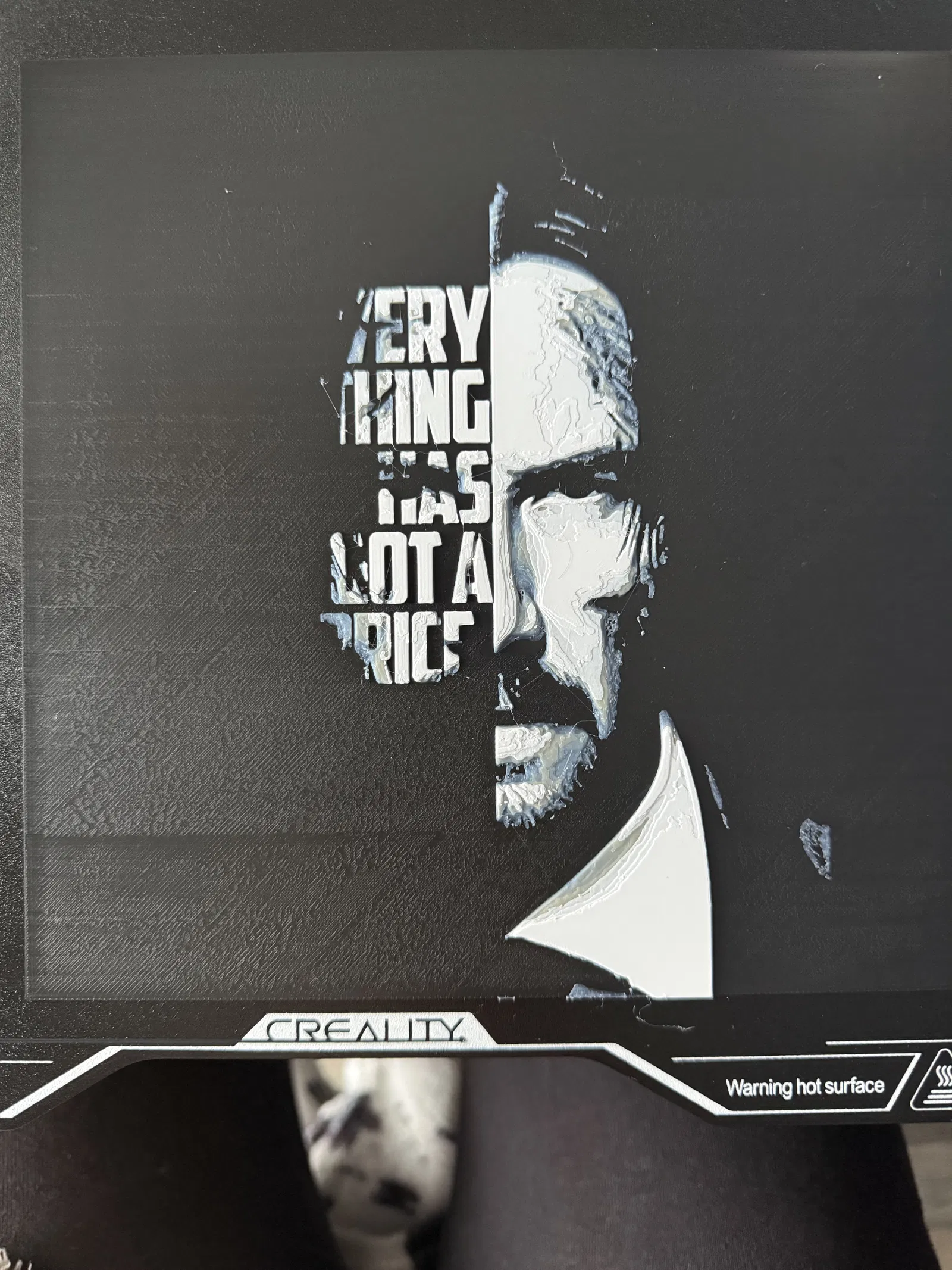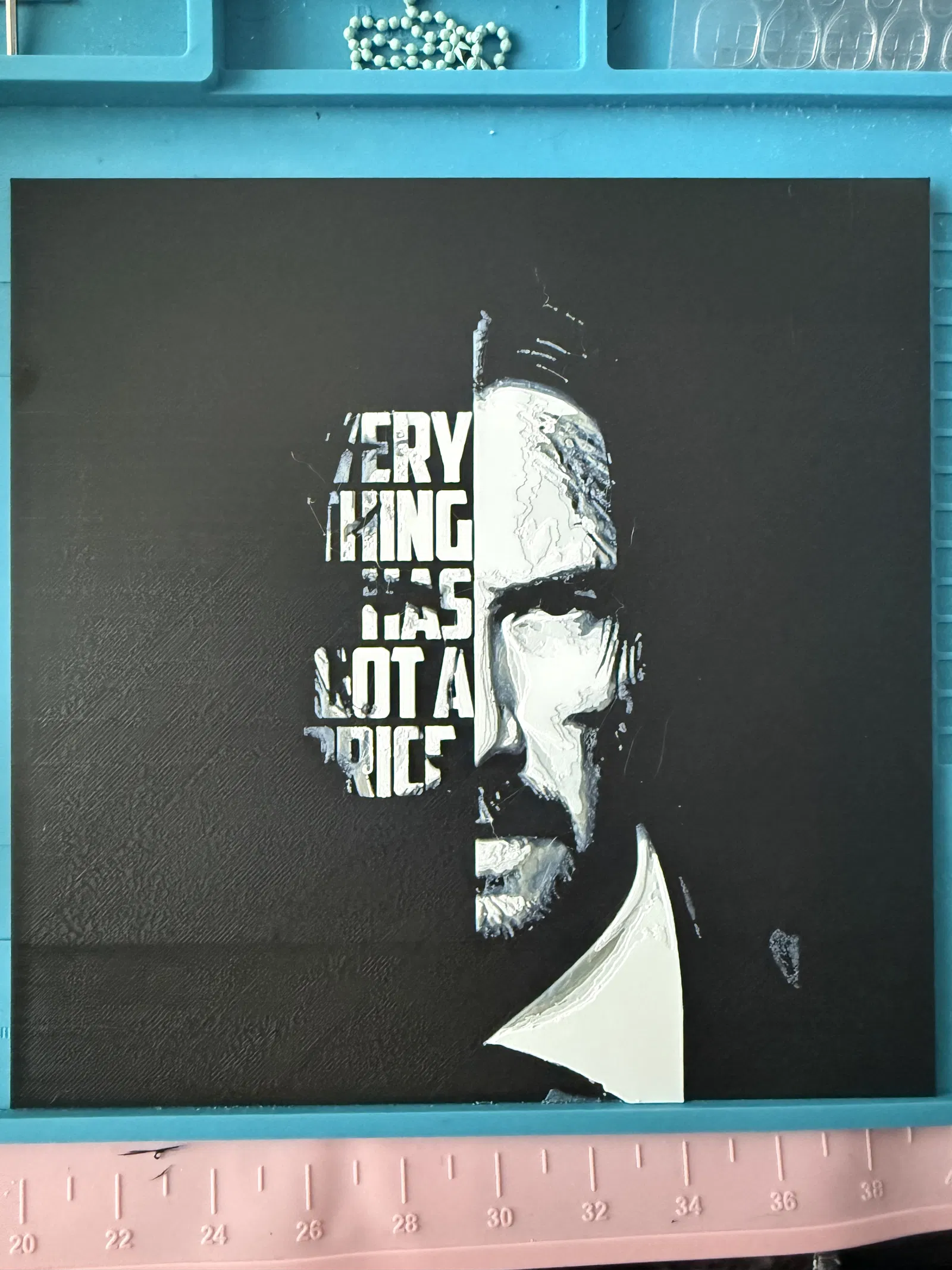 Hướng dẫn in Hueforge John Wick (4 màu): 2 parois, lớp đầu 0.2 rồi 0.16, infill 100%. Bắt đầu với filament đen và đổi màu theo các mốc chiều cao đã ghi.