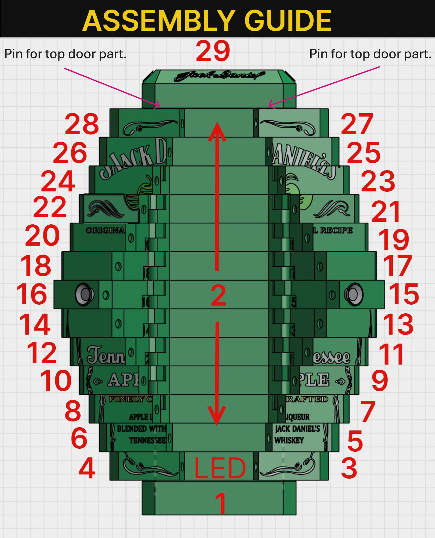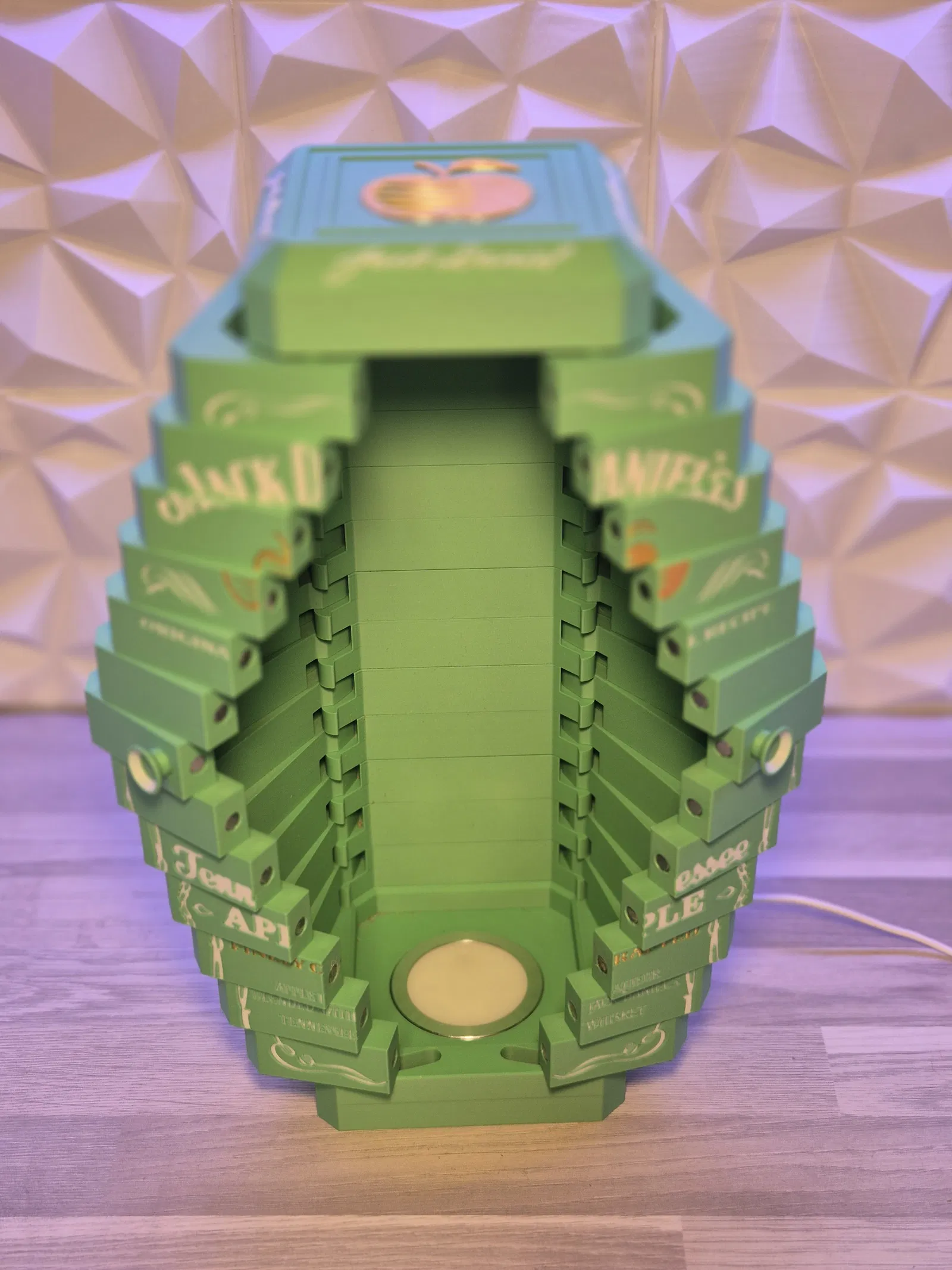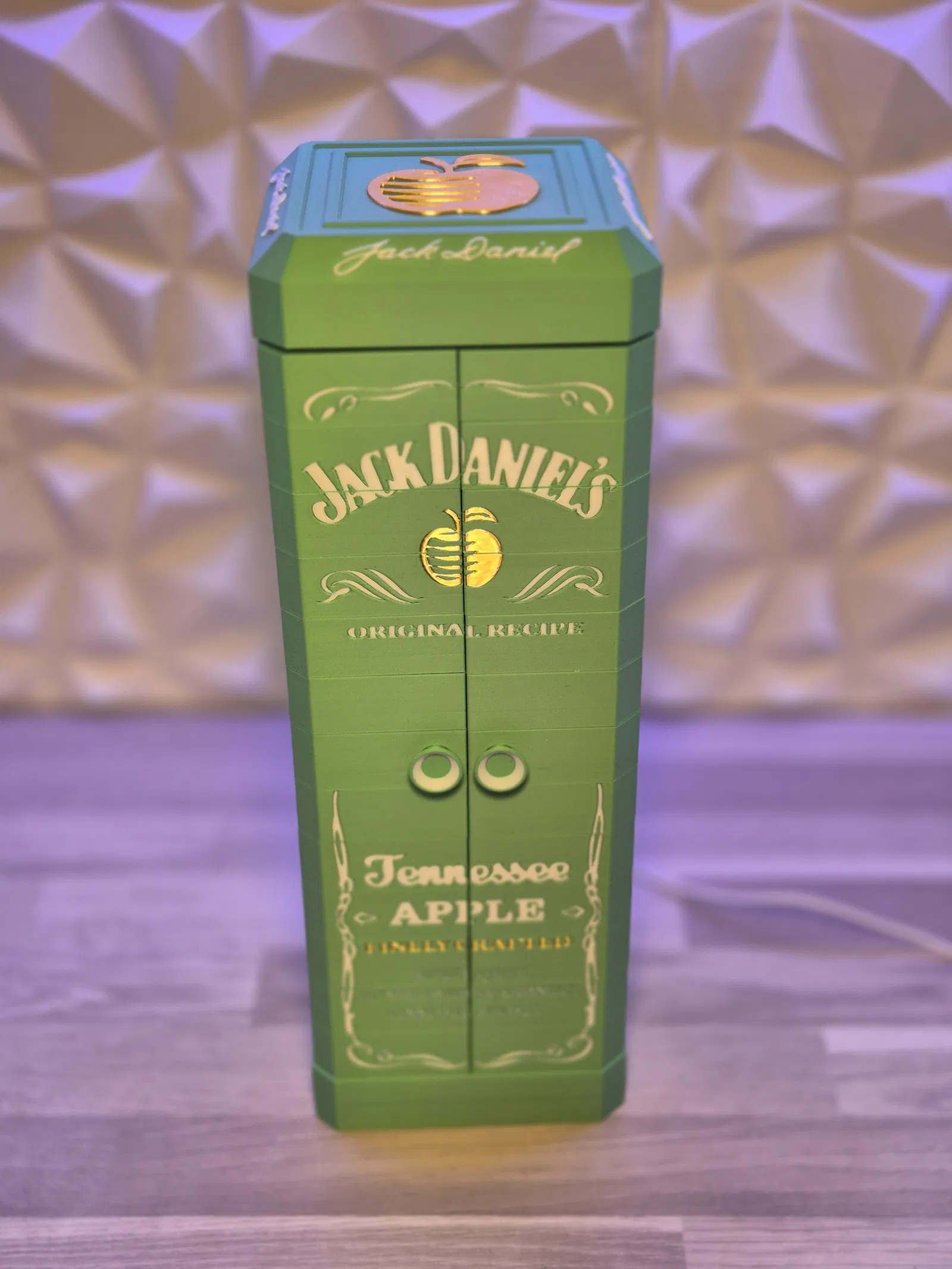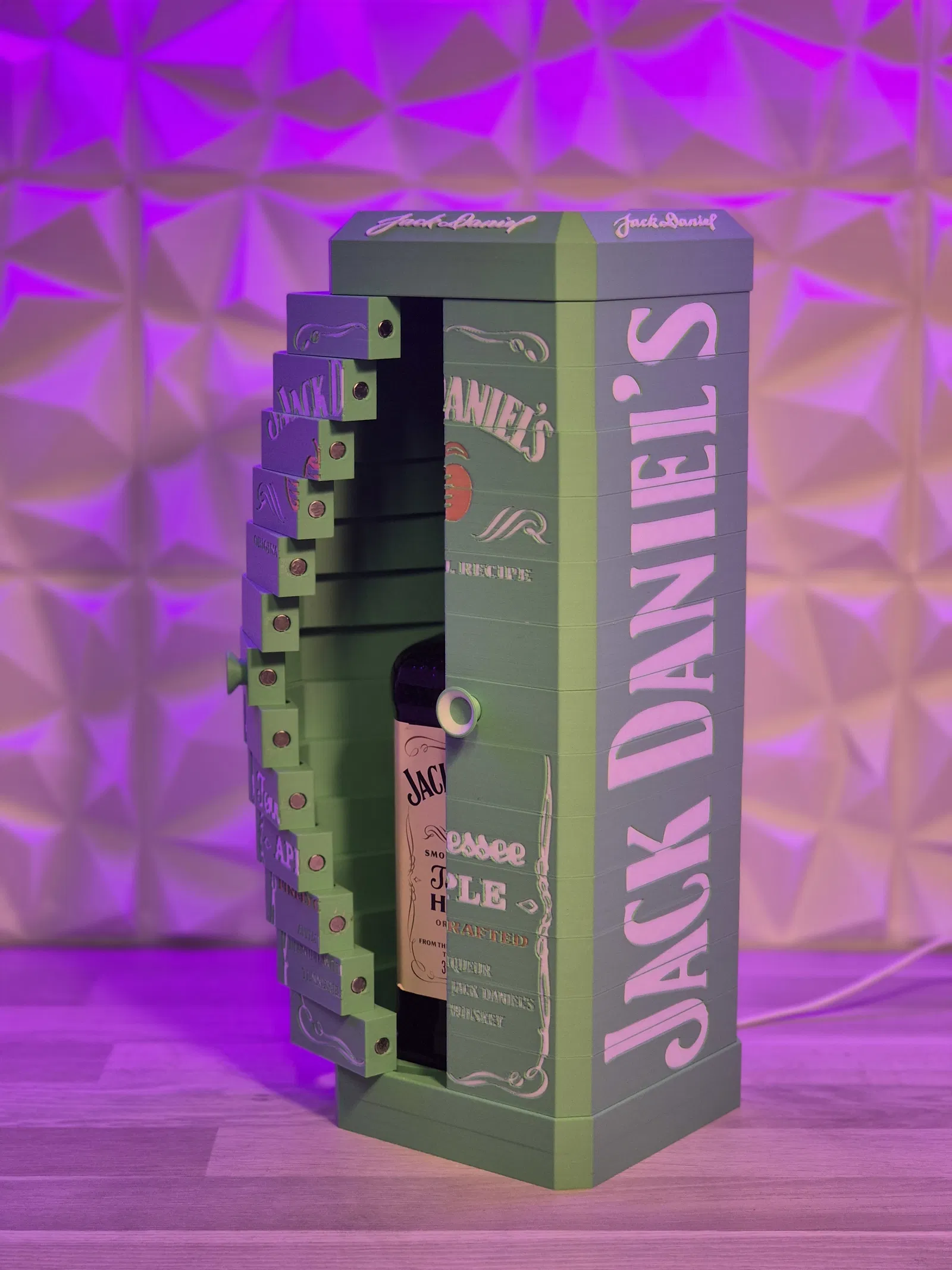 Mẫu hộp trưng bày cửa gấp phiên bản Jack Daniels Apple, thiết kế vừa khít chai Jack Daniel’s Apple (tối đa 1 lít). Dễ in 3D, có hướng dẫn lắp ráp, hỗ trợ tùy chọn Led Lamp Kit 001 để lên đèn nổi bật.