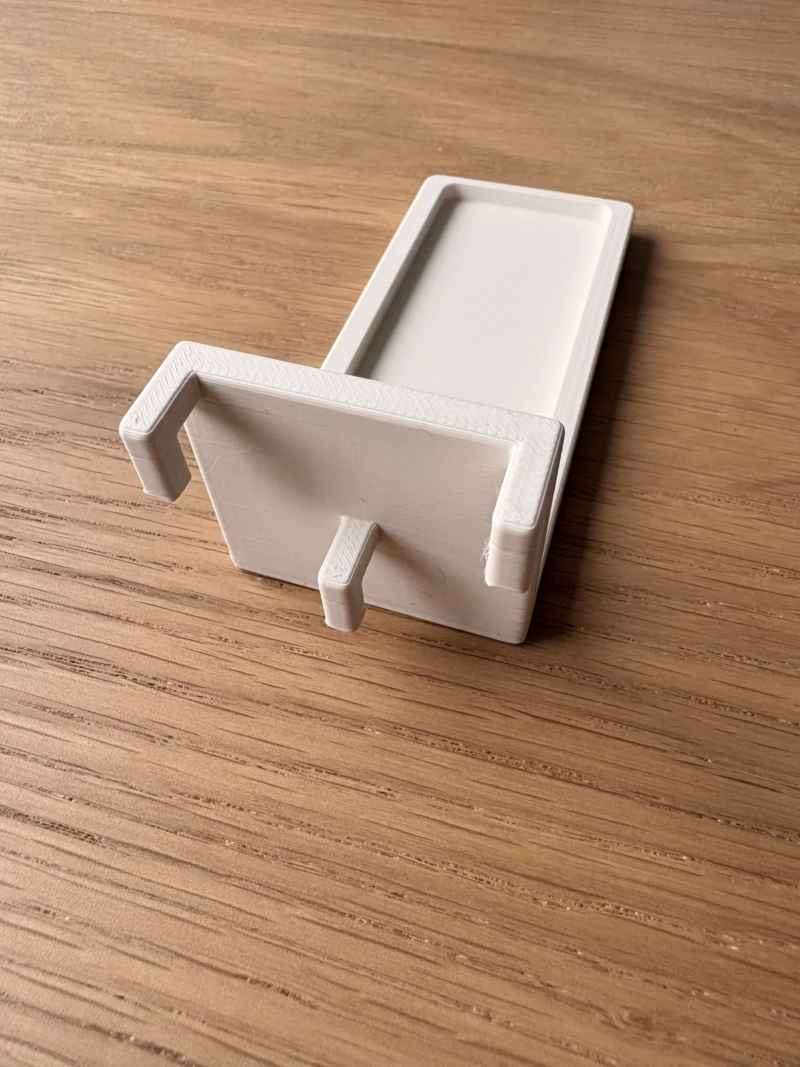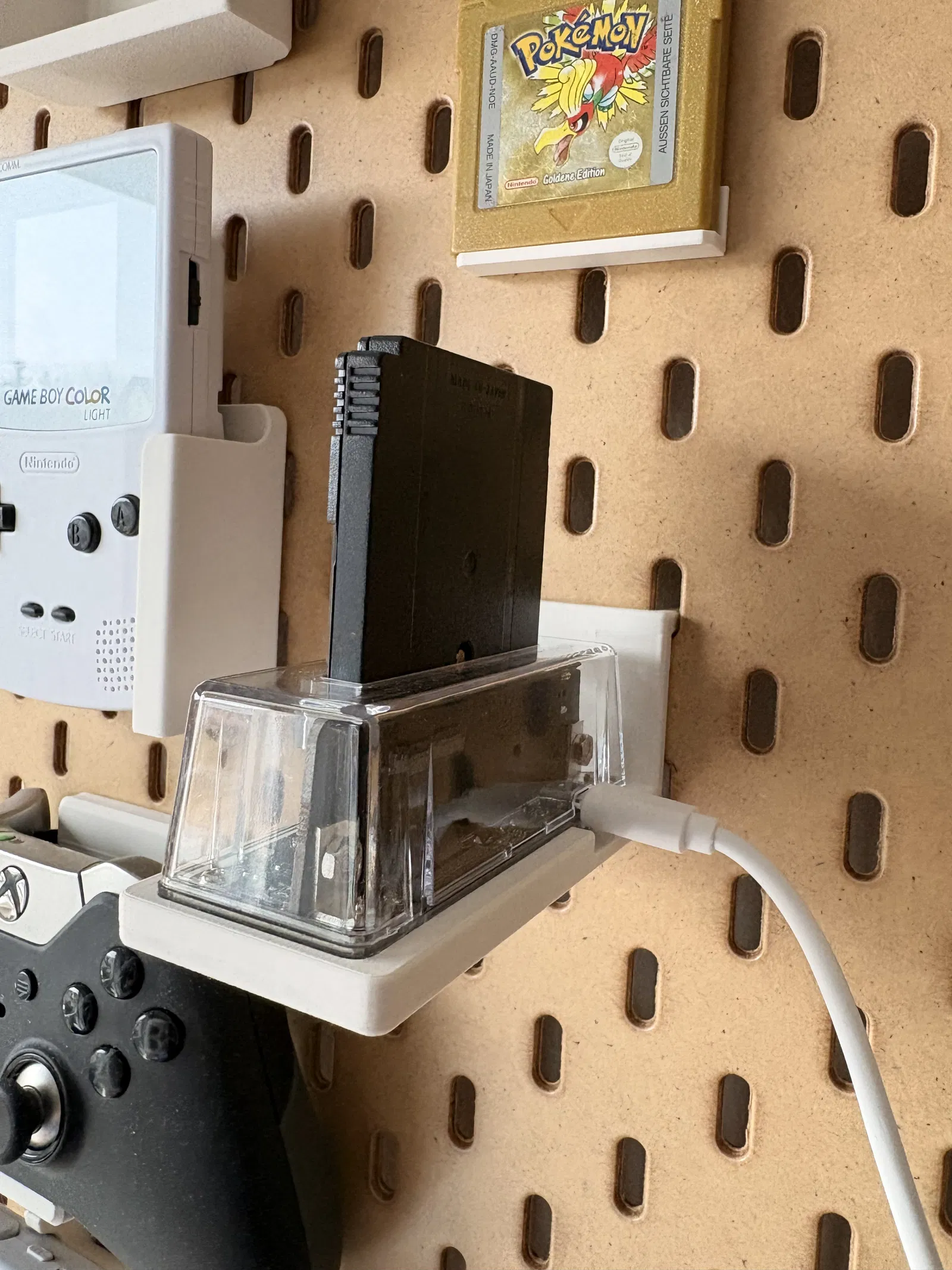 Ngàm treo Epilogue GB Operator lên bảng IKEA Skadis (bản xoay 90°), dùng được nhiều thiết bị đặt cạnh nhau dù vẫn cắm cáp USB. In PLA với setting tiêu chuẩn và bật supports.