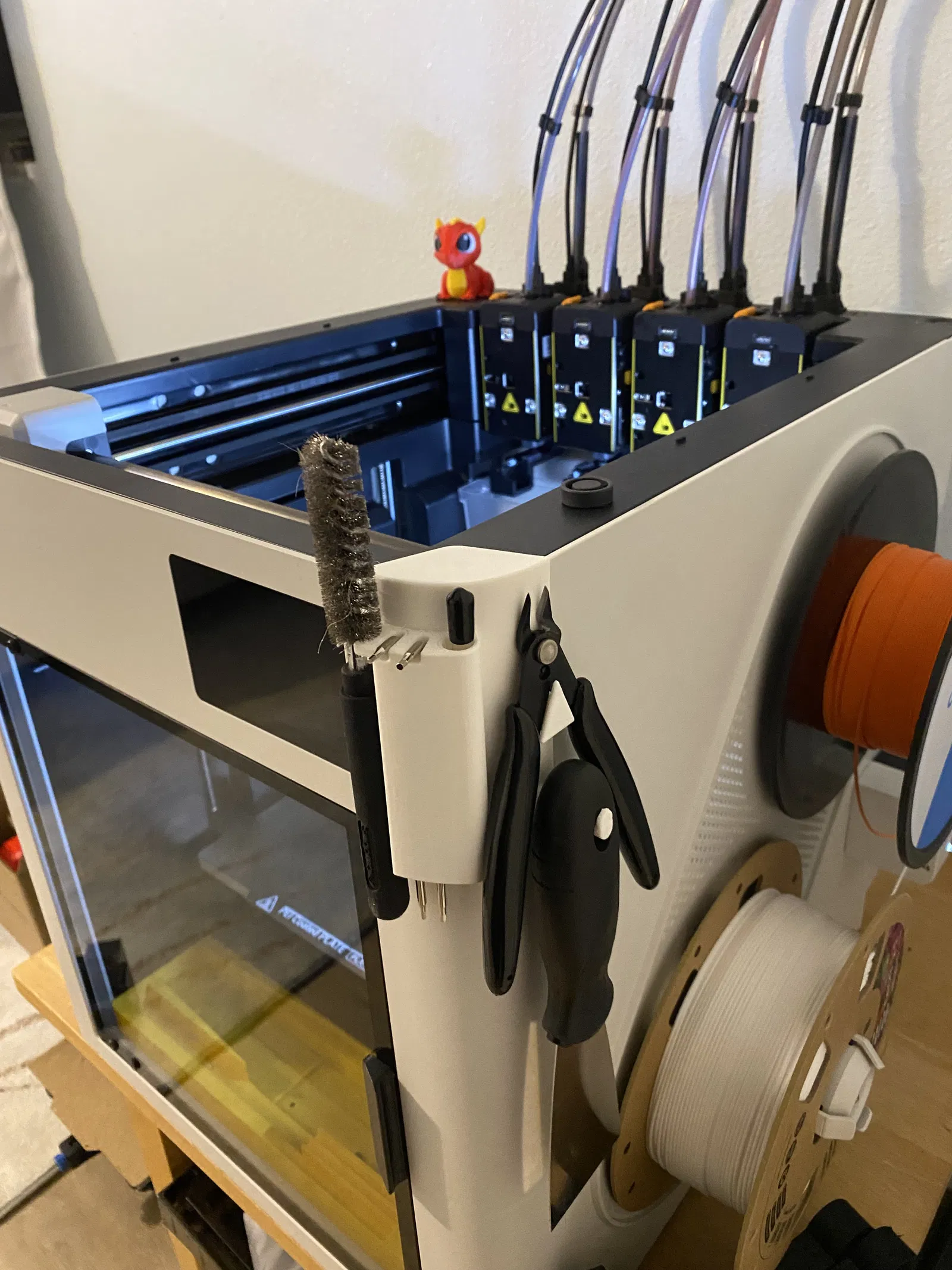 Tool holder cho Snapmaker U1 gắn hông bằng lỗ trên nắp (tháo rubber grommet), không cần hardware. Có bản trái/phải, đảo chiều được. In 0.2 mm, 2 walls và bắt buộc supports (tree support).
