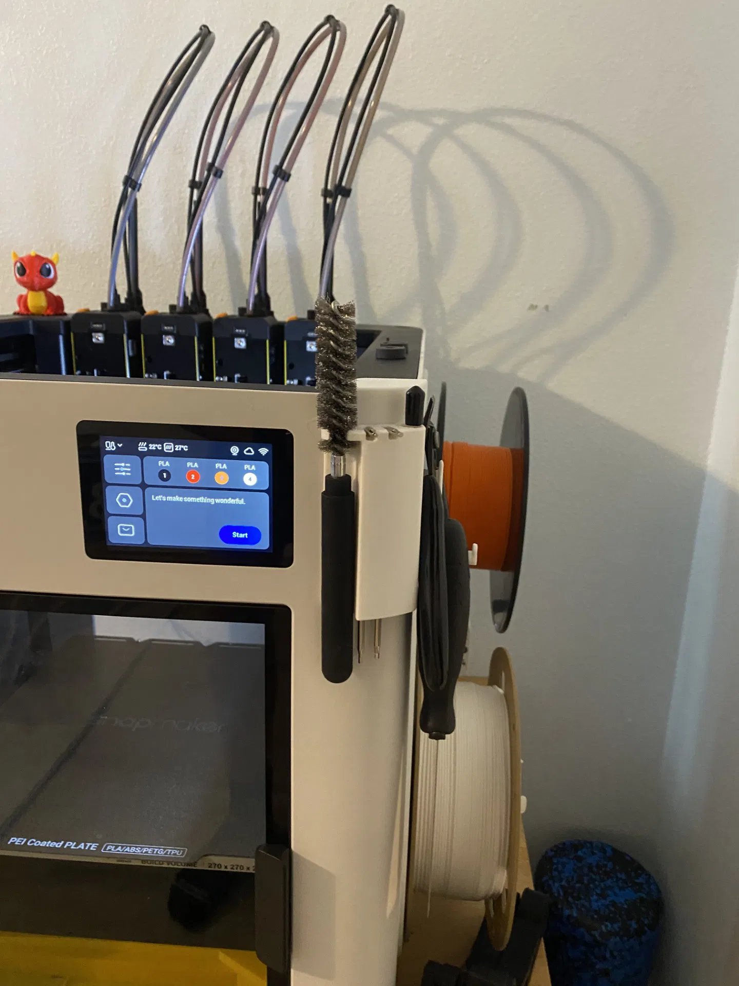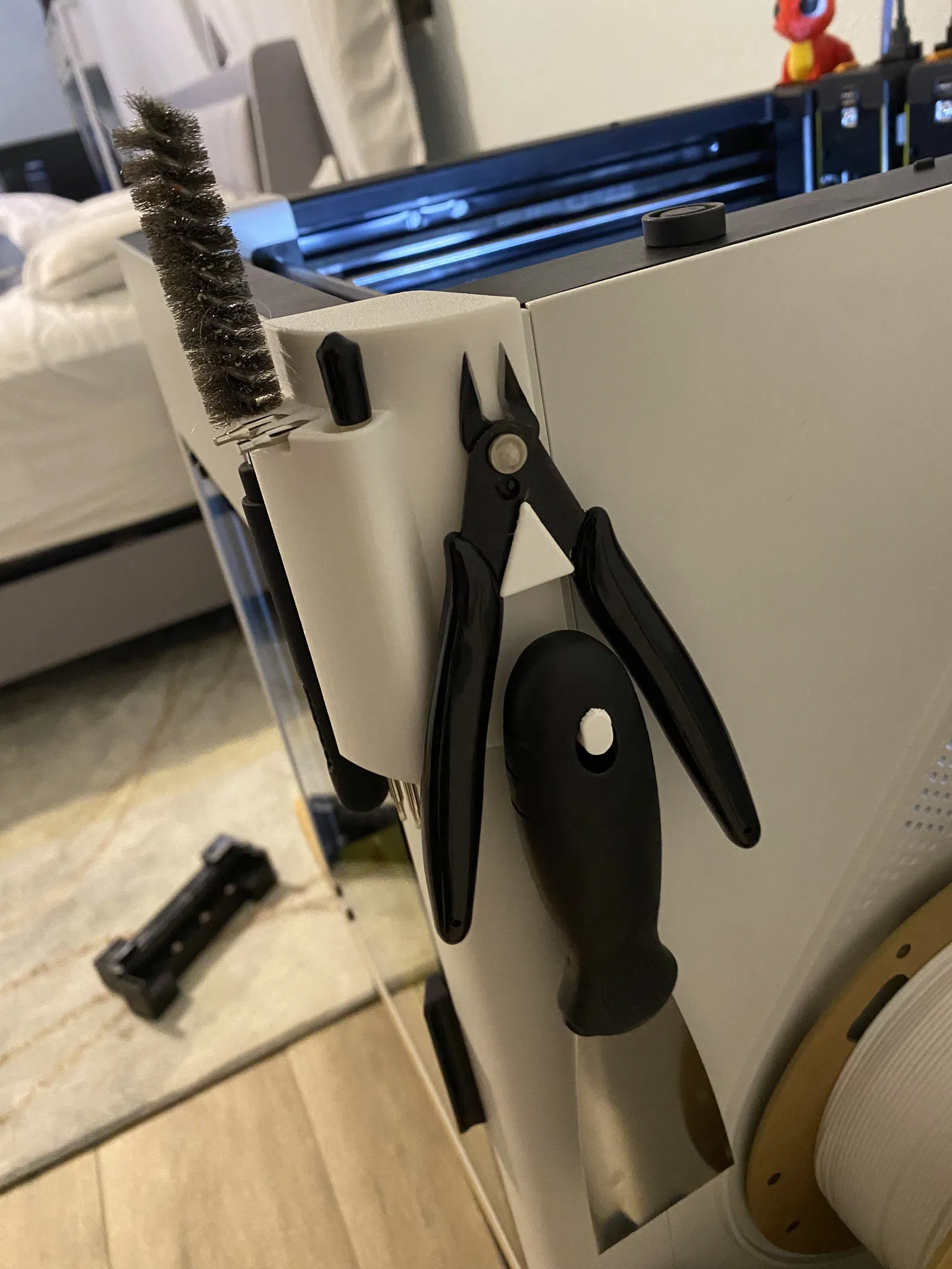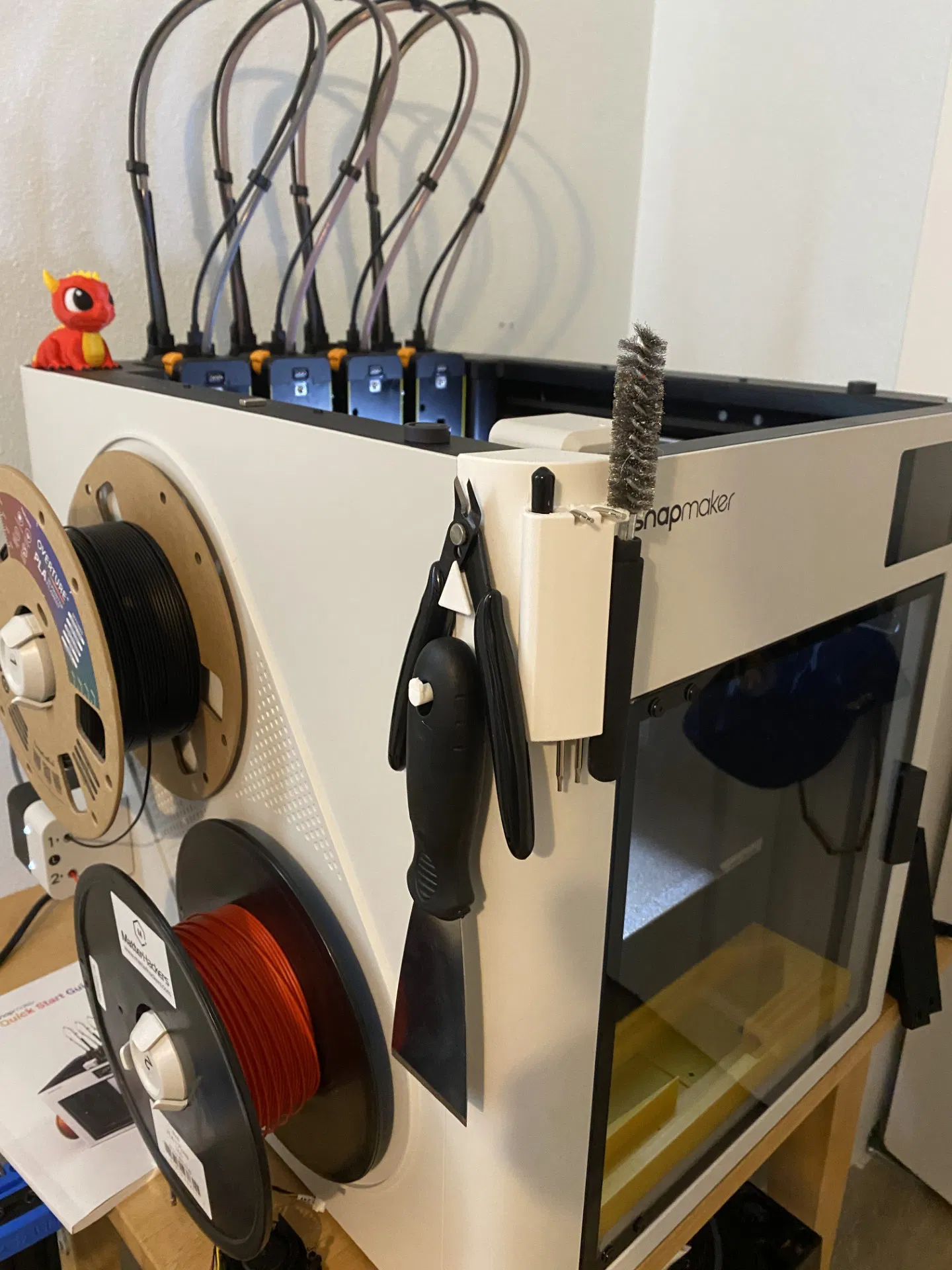 Mình mới tậu một con Snapmaker U1 và thấy mấy mẫu tool holder đang có ngoài kia chưa ưng cái nào. Mình có thử loại gắn bên trong nhưng thấy khá phiền vì mỗi lần cần đồ là phải mở cửa máy. Vậy nên mình quyết định tận dụng một cái lỗ ở phía trên máy (bình thường bị che bởi một nút cao su/rubber grommet) để gắn tool holder.