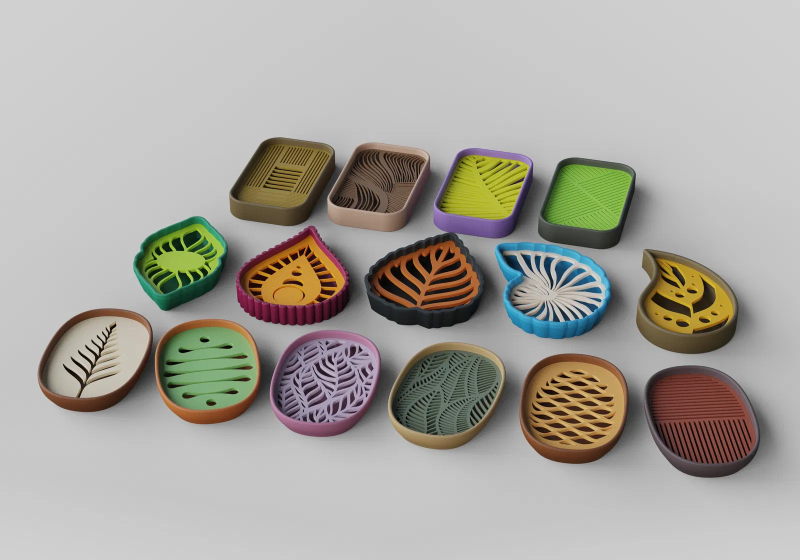 Bộ sưu tập khay đựng xà bông và giá để bông rửa chén in 3D với thiết kế 2 phần (base/body + insert/drainer tháo rời) giúp thoát nước nhanh, dễ vệ sinh, hợp phòng tắm lẫn nhà bếp. In tốt với PLA, PETG.