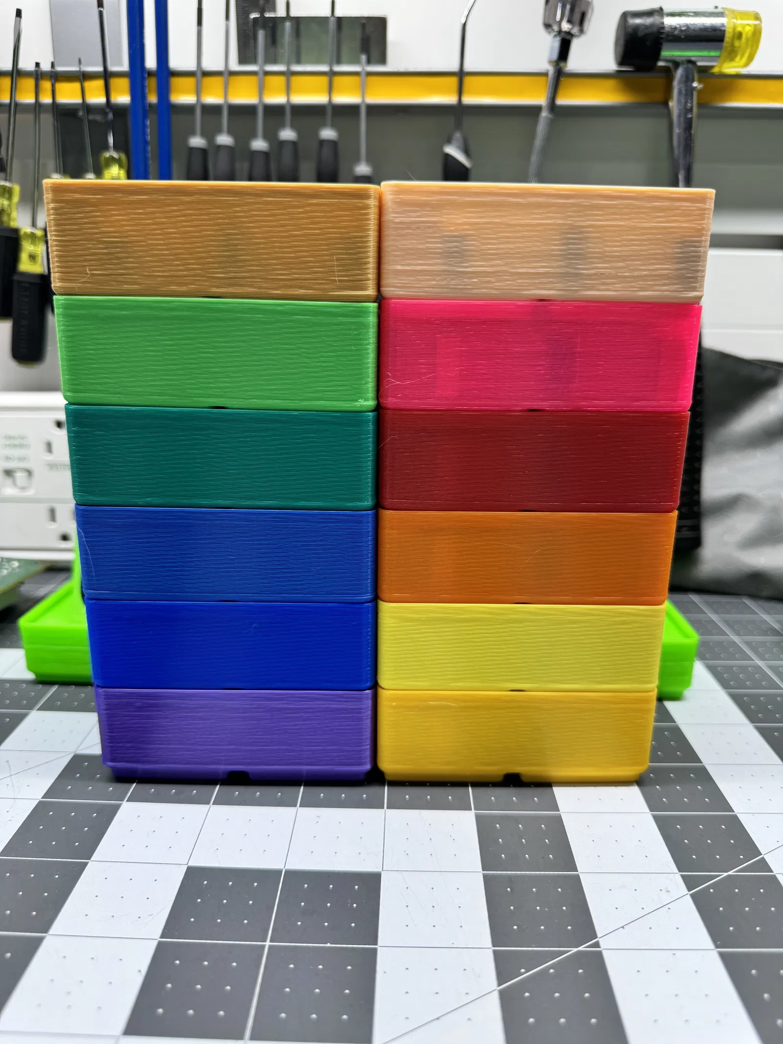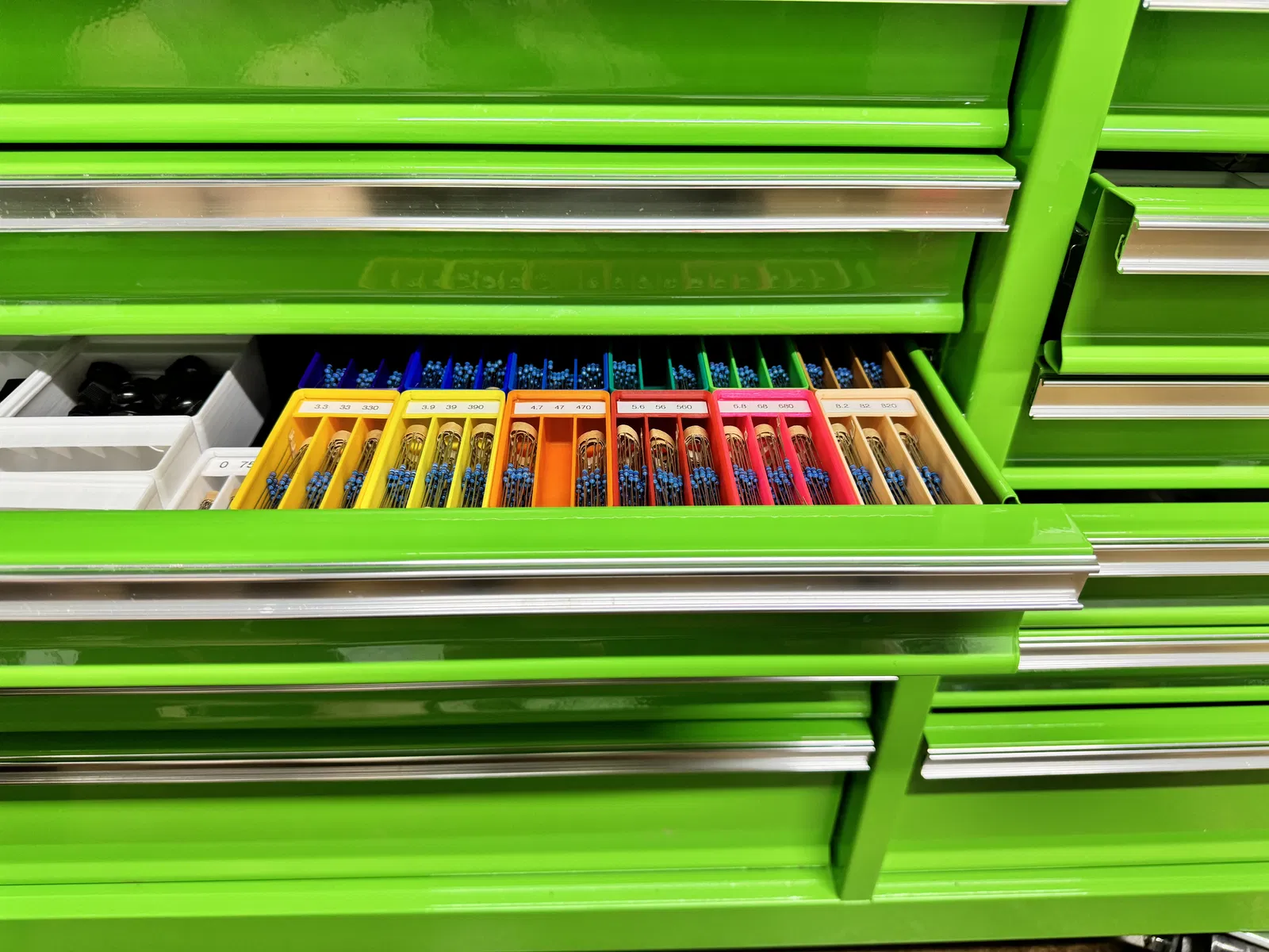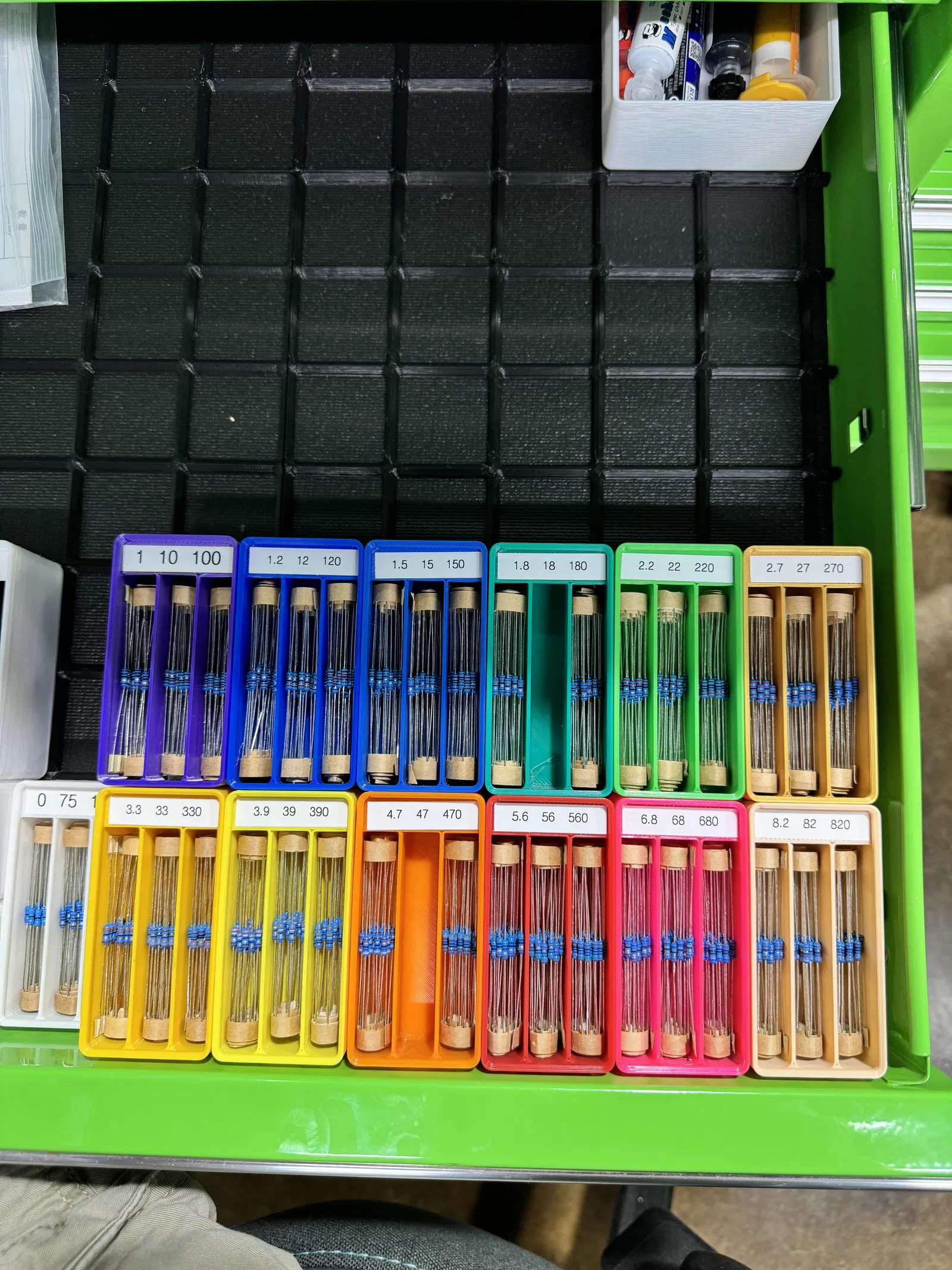 Mấy khay điện trở xếp chồng này được thiết kế để vừa khít với hệ Gridfinity, cho bạn một cách gọn gàng và hiệu quả để cất điện trở dạng tape hoặc rời. Mỗi khay chứa được 30–40 con điện trở trên tape (hoặc gấp đôi nếu để rời) và có chừa chỗ dán nhãn 9mm hoặc .35" để dễ nhận diện. Thiết kế đáy phẳng nên không có lỗ gắn nam châm hay ốc vít, in cho dễ. Phần nhãn được thiết kế để bridge, không cần support. Nếu bạn xài tủ đồ nghề Horrible Freight U.S. General Tool Chest thì có thể chồng 2 khay mà vẫn đóng hộc kéo lại được.