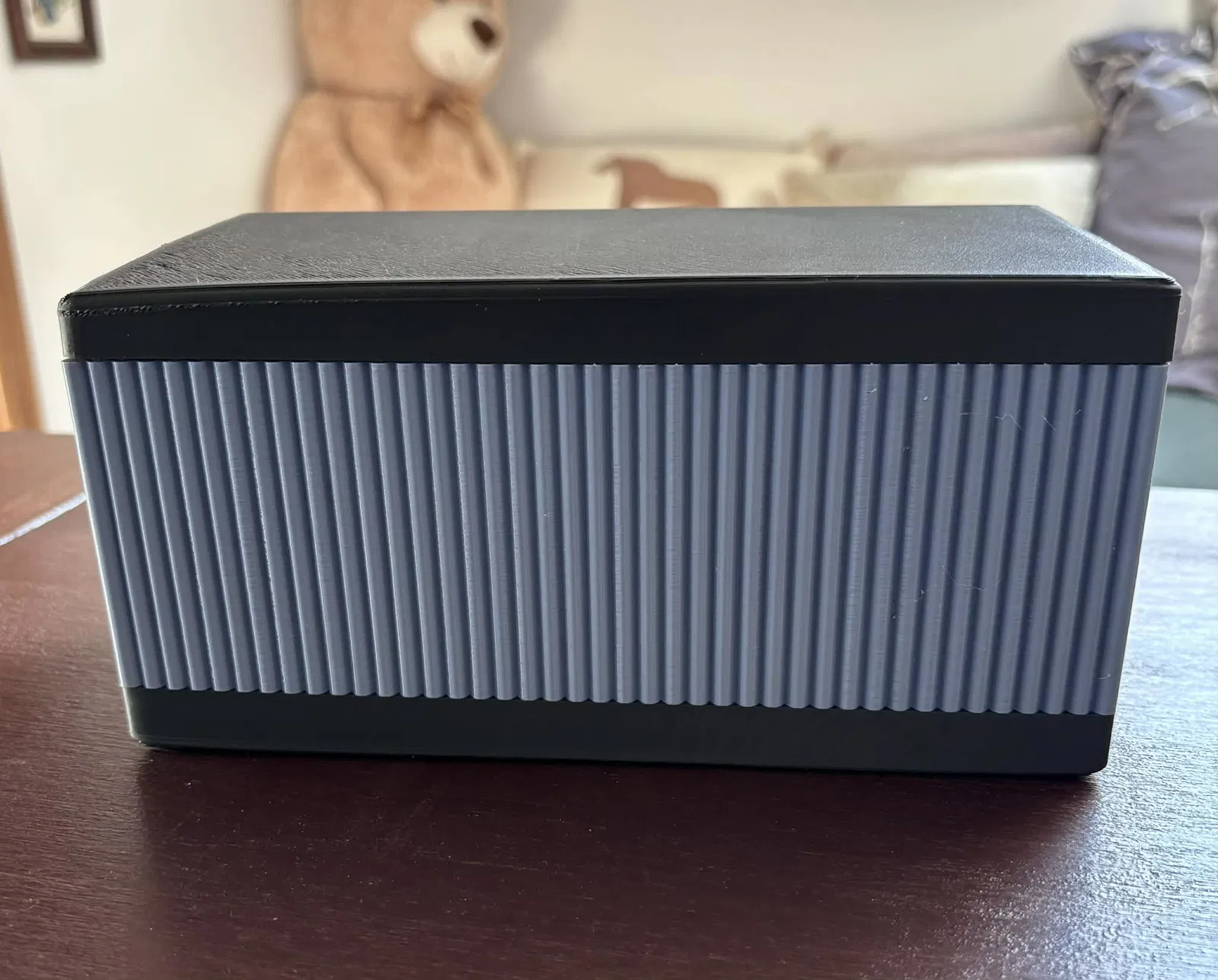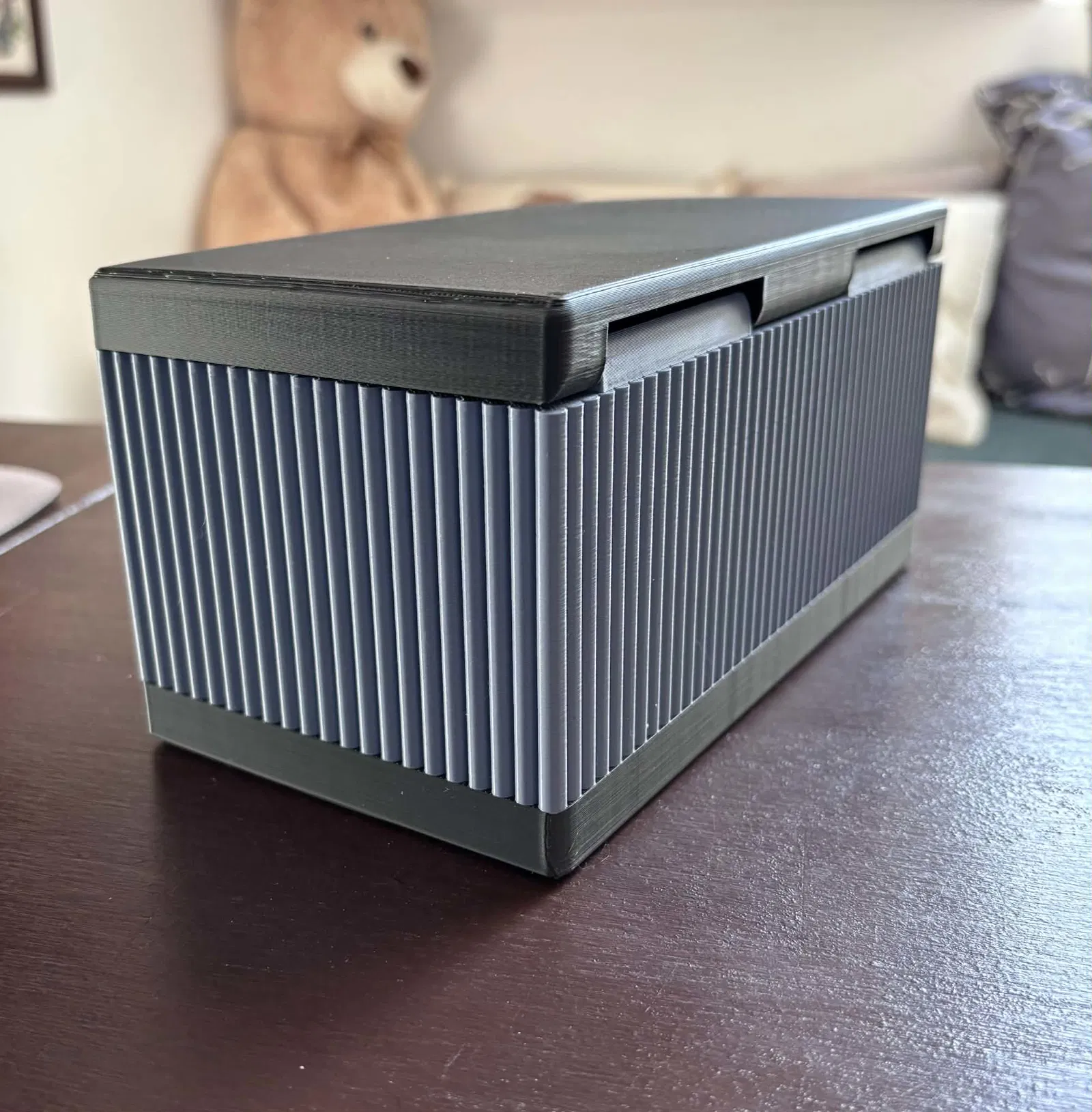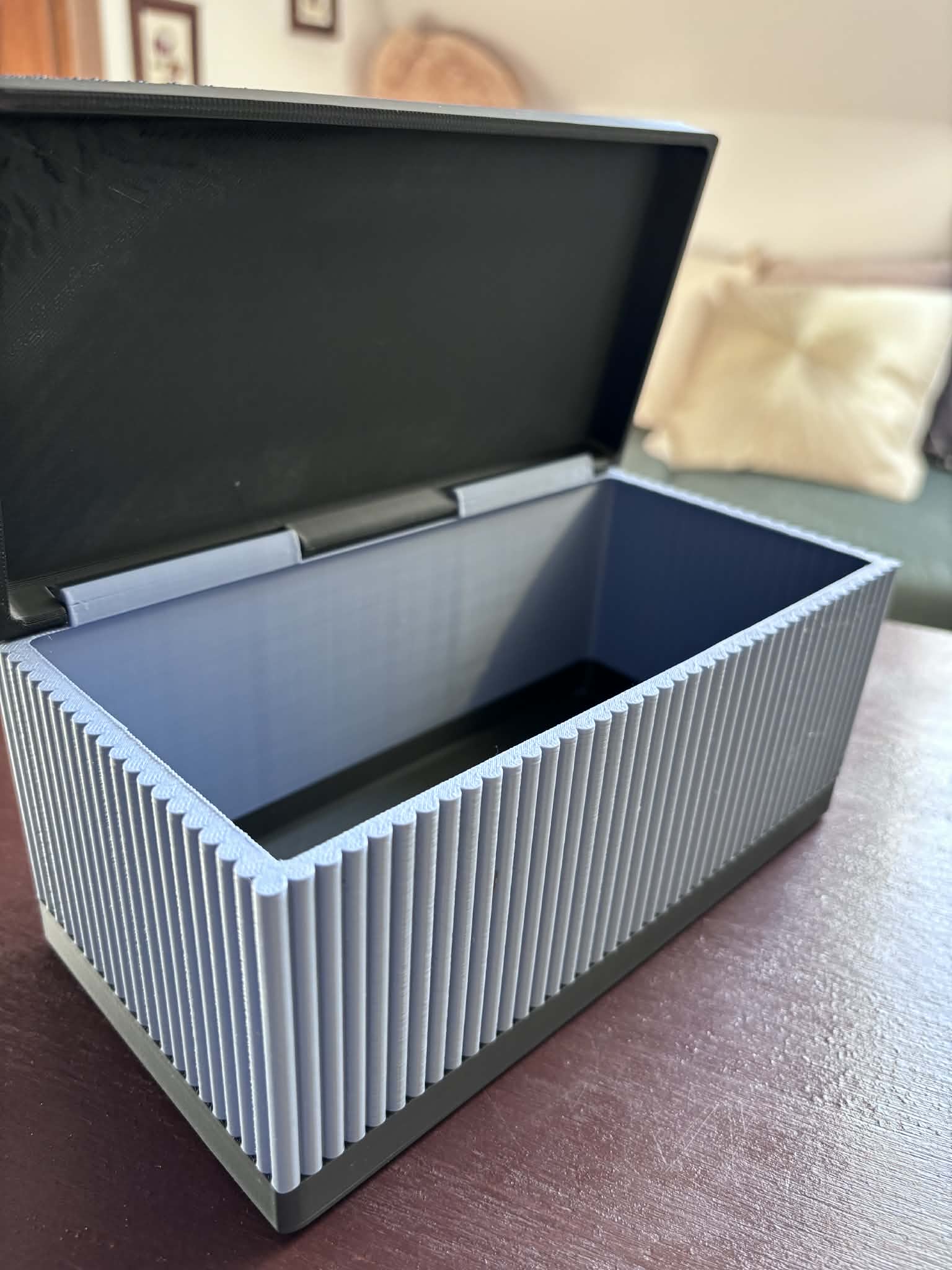 Hộp trang trí kích thước 205 x 105 x 100 mm (w x d x h) với nắp bản lề. In 2 phần (hộp và nắp) rồi lắp ráp bằng cách bấm khớp. Vừa khít để cất sanitary pads kín đáo trong phòng tắm.