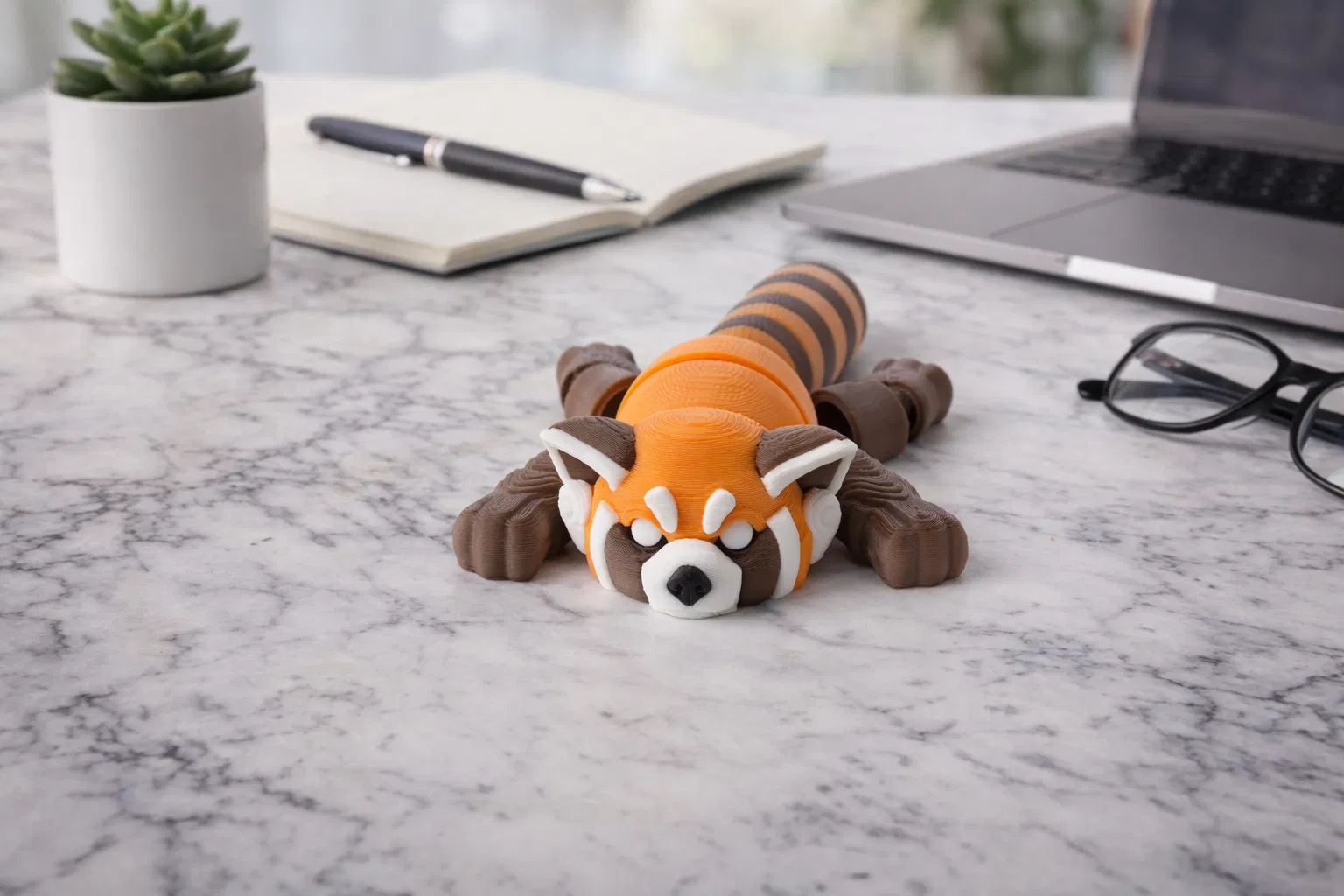 Gấu trúc đỏ flexi khớp nối siêu dễ thương, thân chia đốt lắc lư, chân mũm mĩm và đuôi sọc đặc trưng. In 3D bằng nhựa một màu, hợp làm desk buddy hay đồ fidget, phối màu cam–nâu–kem rất xinh.