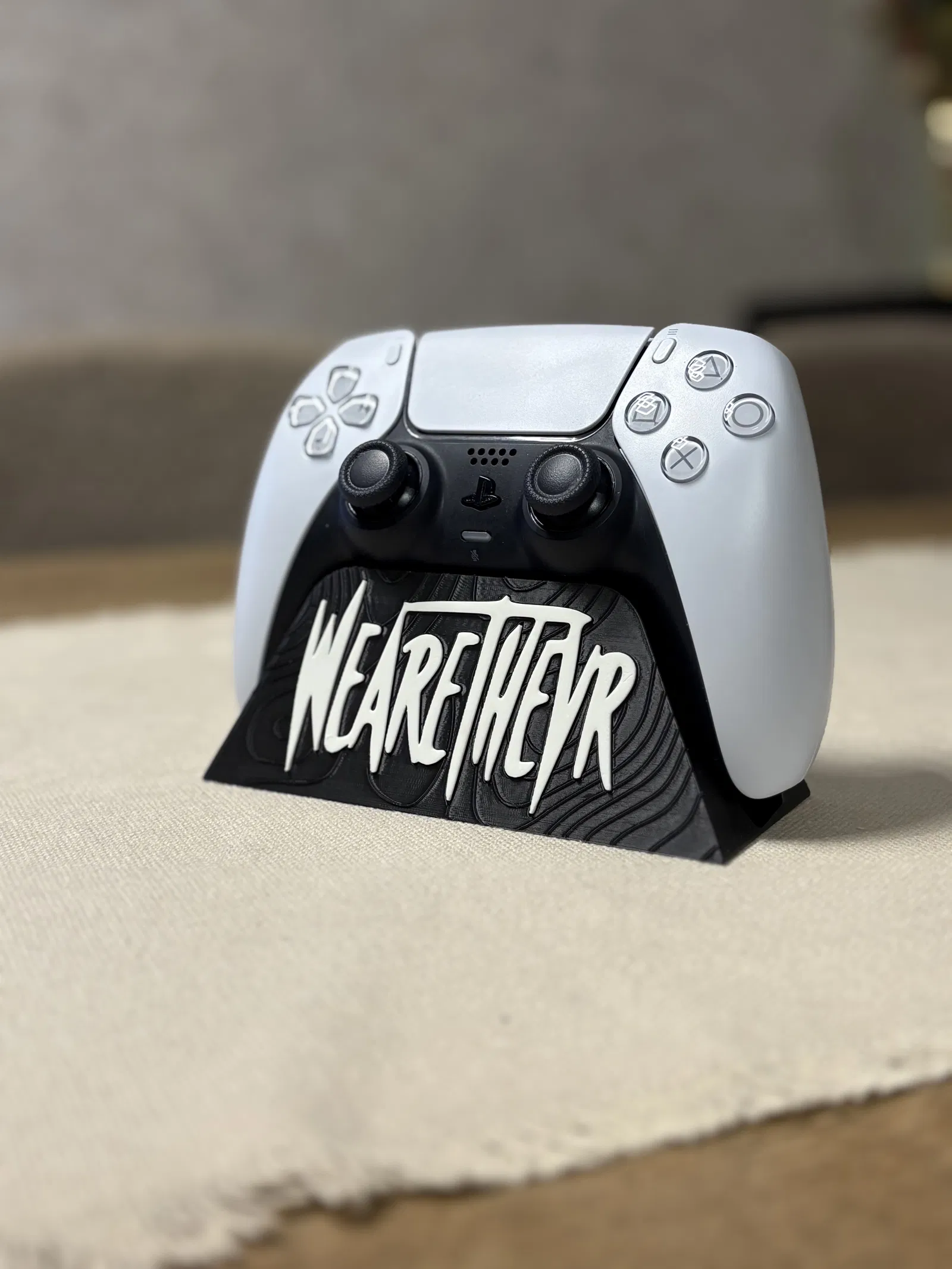 Kệ đỡ PS5 DualSense lấy cảm hứng từ WeAreTheVR, đế vân “lines” và chữ nổi in riêng để lên màu tương phản đẹp, bề mặt sắc nét. In PLA ngon, layer 0.2 mm, không cần supports; dán chữ bằng super glue.