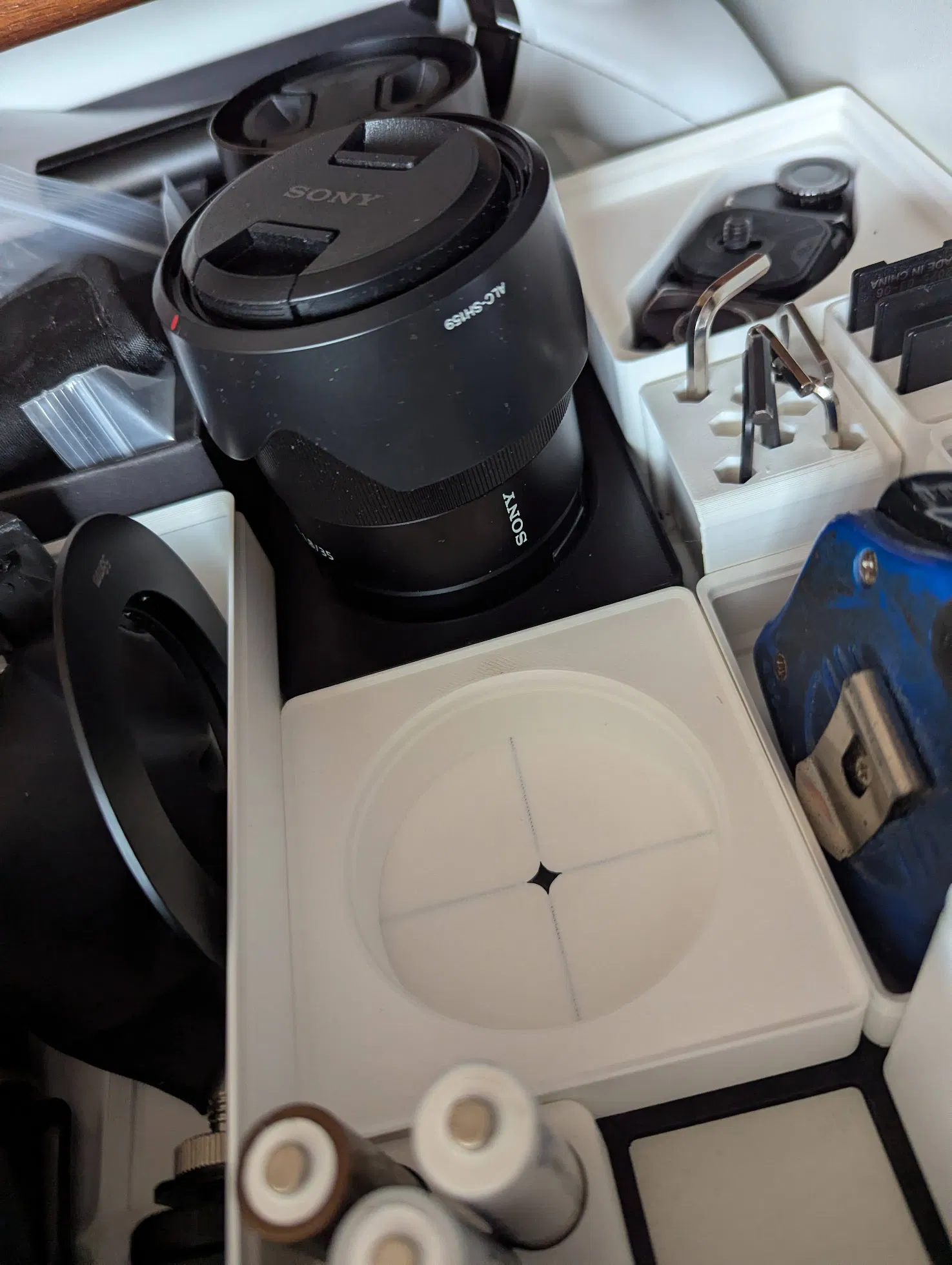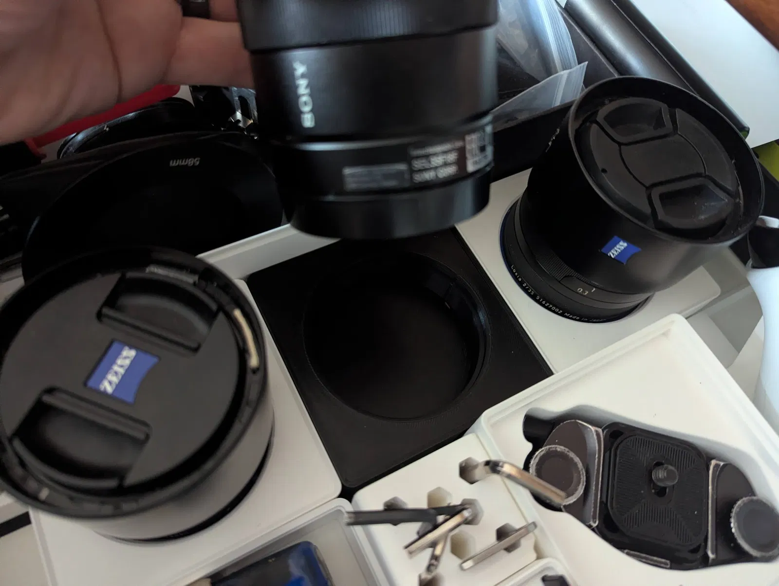 Bản ngàm Sony E-Mount siêu mỏng cho Gridfinity Holder, với lỗ rộng hơn để vừa cả lens Loxia. Thiết kế mỏng giúp chứa được các lens dài hơn trong không gian sẵn có.