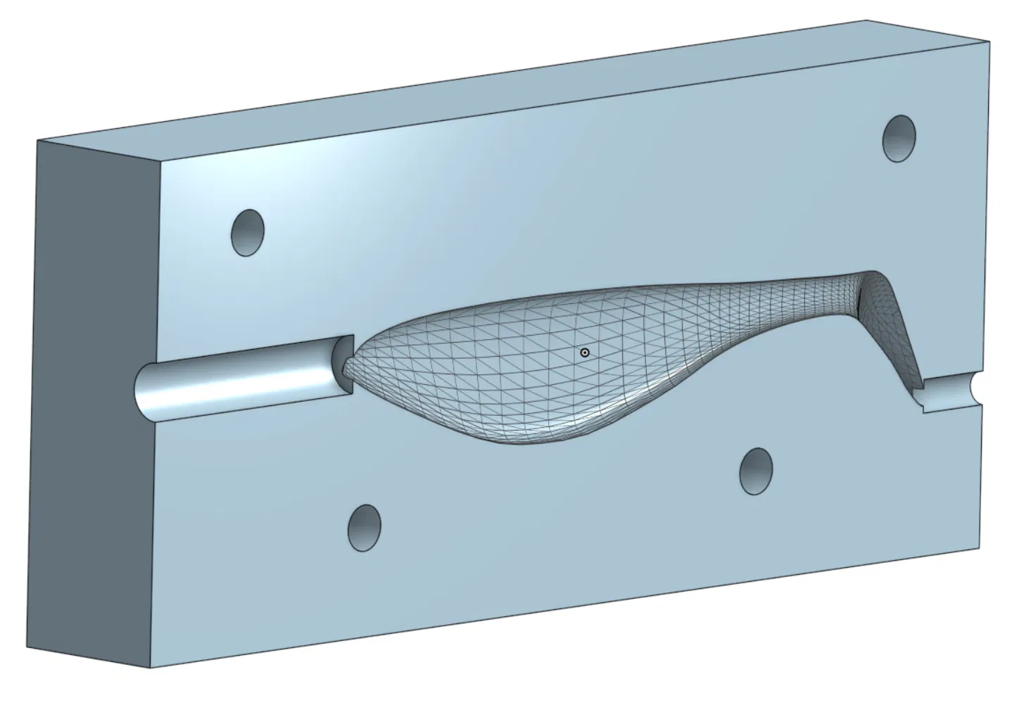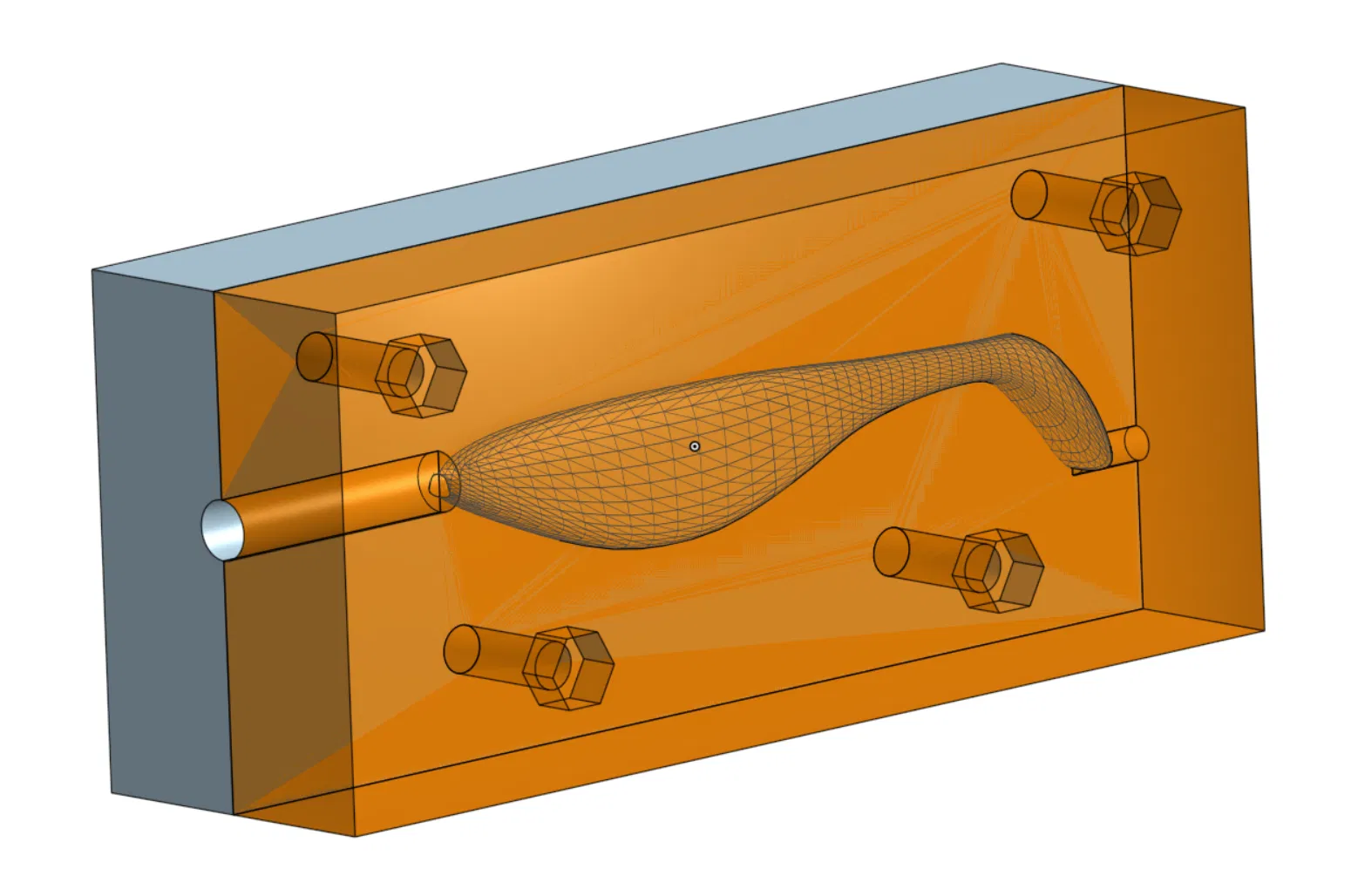 Khuôn in 3D để đổ silicone làm softbait shad 9cm (clone Westin). Không cần support, khuyến nghị in ABS/ASA. Có lỗ thoát khí chống bọt. Dùng 4x đai ốc M5 và 4x bu-lông M5 (≥35mm).