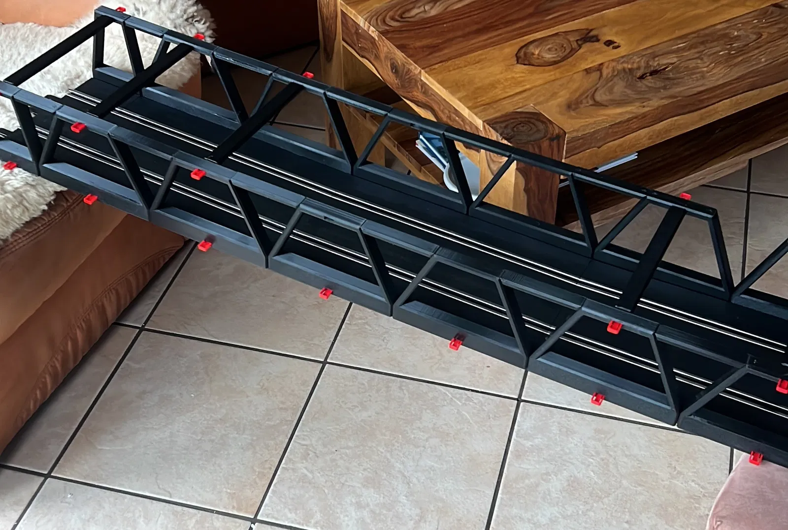 Phần hông của ray normal sẽ được ráp như bình thường bằng các khớp nối Carrera màu đỏ. Với ray 1/3 và 1/4 thì bạn cần dùng khớp nối do mình thiết kế riêng, vì theo kiểu cấu tạo này thì không còn chỗ để dùng khớp nối tiêu chuẩn.