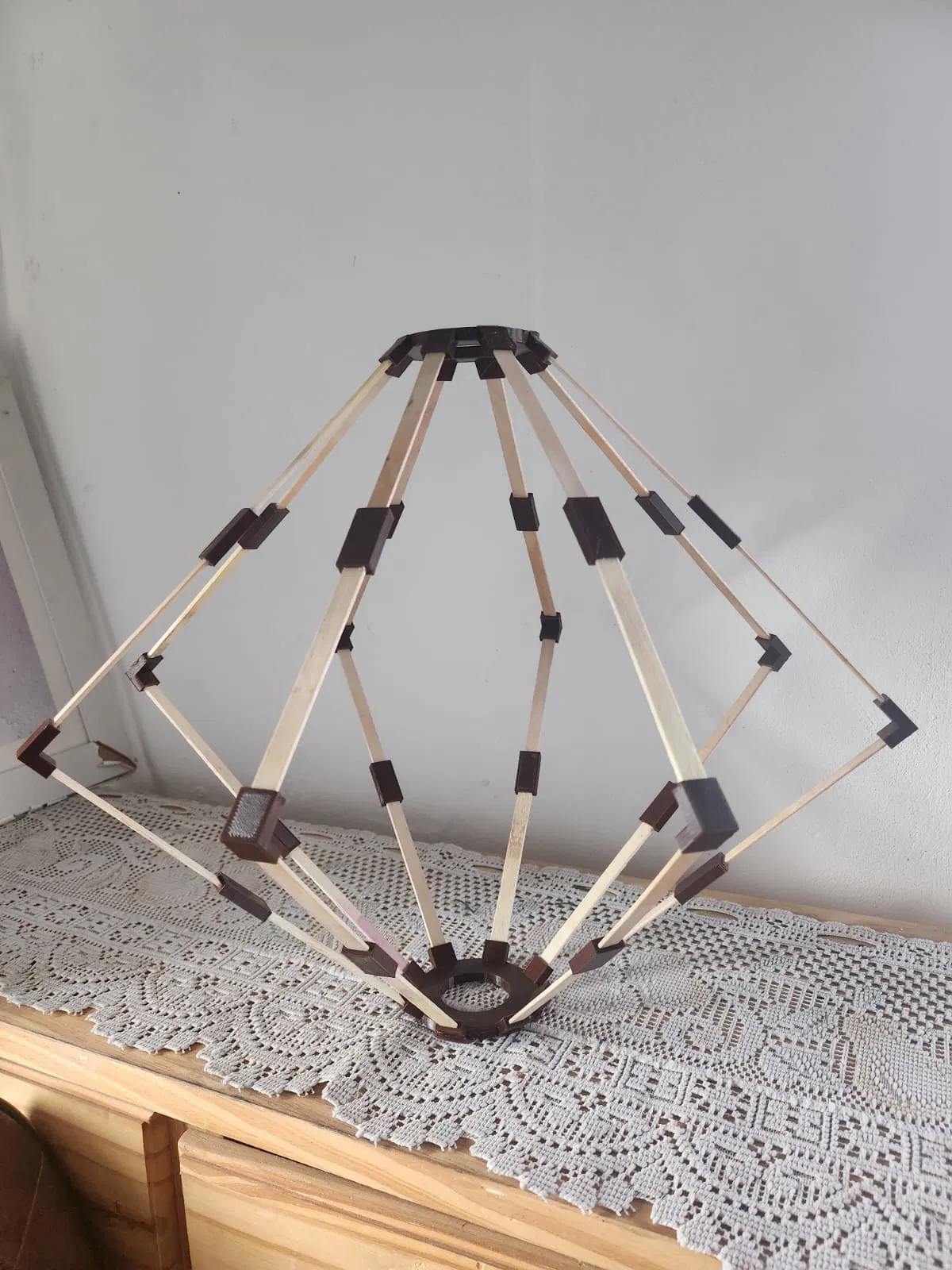 Mẫu đèn chùm làm từ que kem gỗ, in nhanh và thân thiện cho bé cùng làm thủ công. Lắp ráp dạng modular, dễ biến tấu nhiều kiểu. Rất hợp làm điểm nhấn trang trí nhà, hiên/patio hay gazebo.