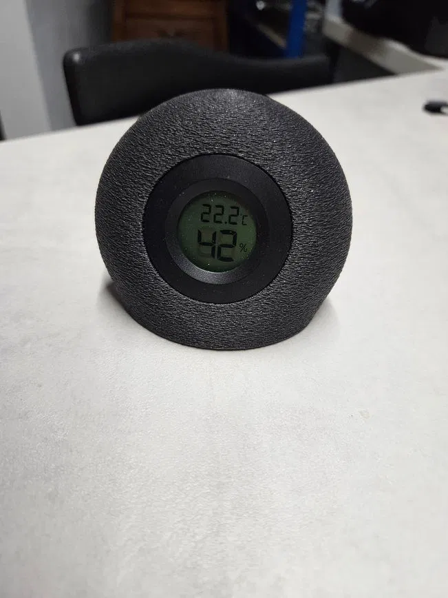 Giá đỡ gọn đẹp cho nhiệt ẩm kế tròn, thiết kế nghiêng 70° và dùng pin AAA. Gợi ý thông số in PLA (layer 0.1, nozzle 0.4), có support reinforcement/modifier và Fuzzy Skin; hợp cho 2 mẫu máy tròn.