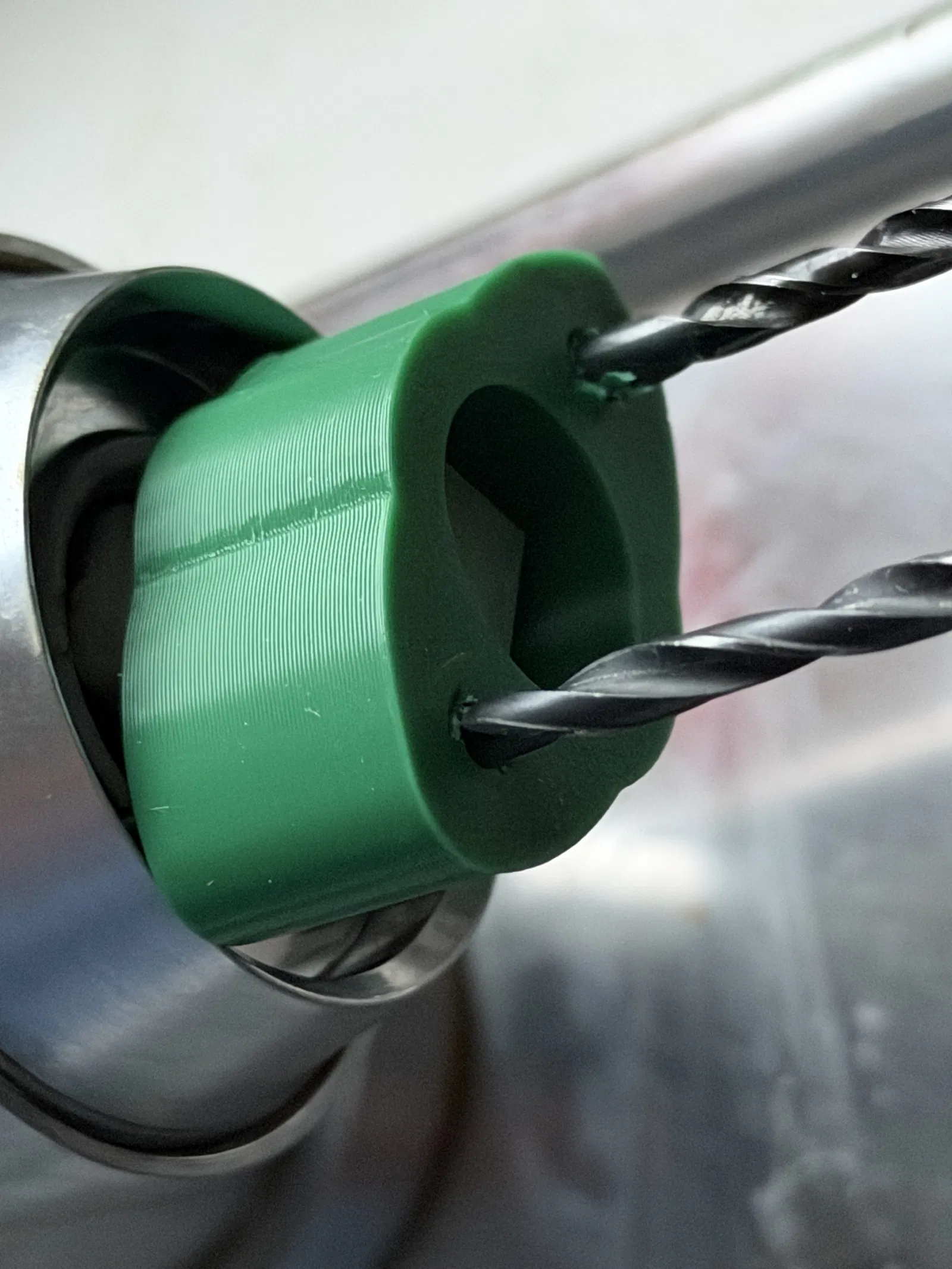 Trong dụng cụ này có ép sẵn hai mũi khoan 3,5mm. Chúng được luồn xuyên qua 14mm. Bản in (PLA) mình làm với 5 wall lines.