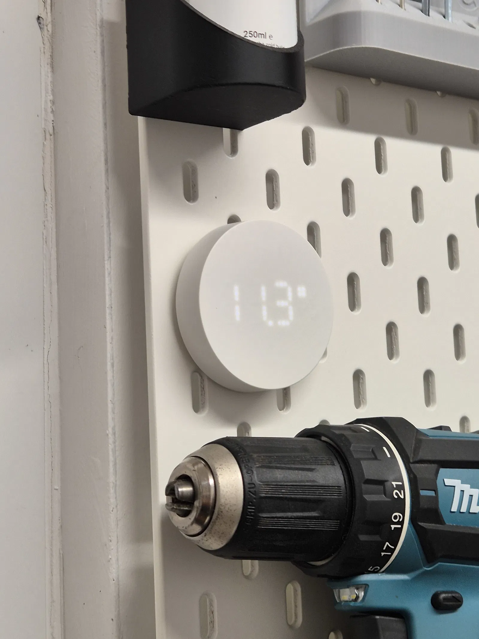 Mẫu móc tối giản để treo cảm biến nhiệt độ & độ ẩm IKEA TIMMERFLOTTE lên bảng pegboard SKÅDIS. Thiết kế tiết kiệm vật liệu, dễ in với PLA/PLA+ và phù hợp cho setup smarthome.