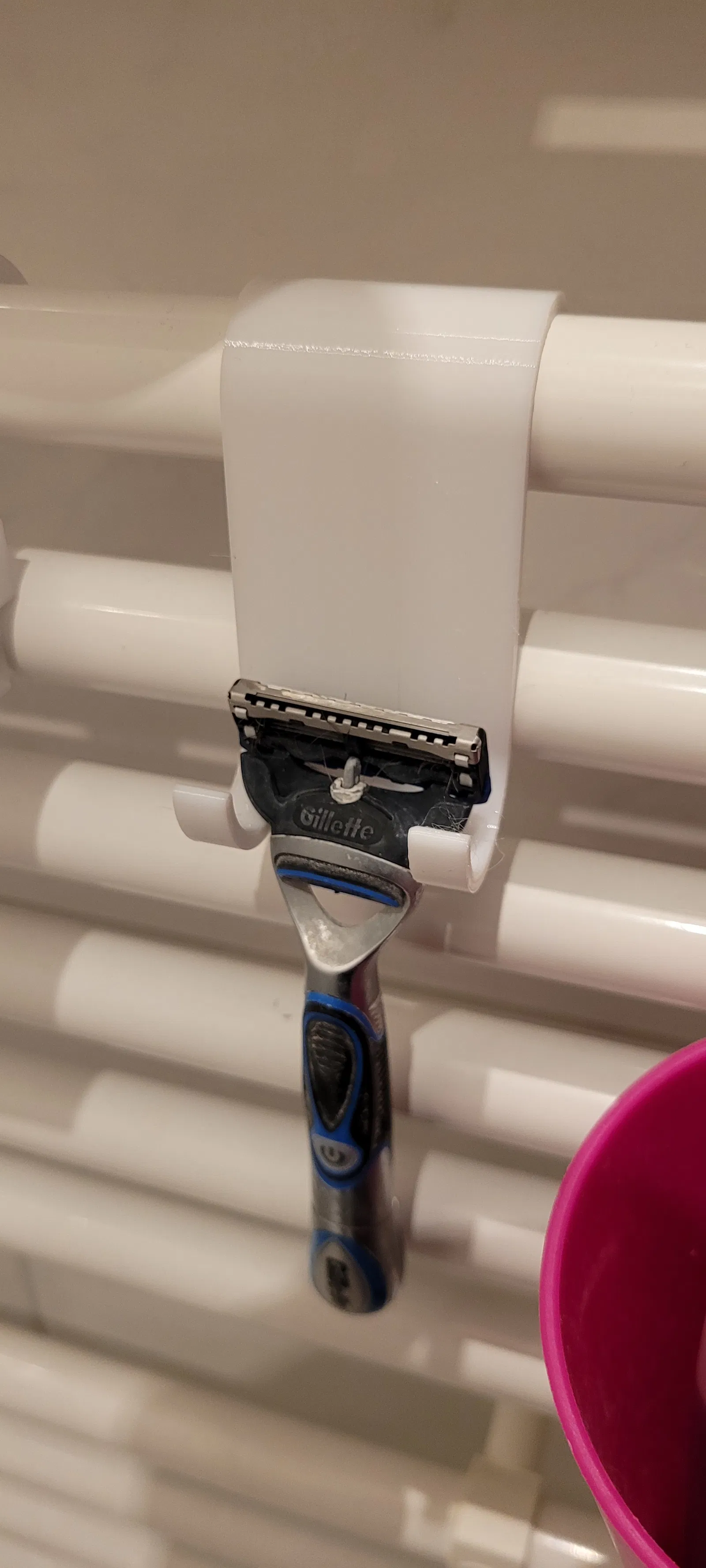 Giá treo dao cạo đơn giản để gắn lên thanh radiator trong phòng tắm, phù hợp thanh đường kính 24mm. Khuyến nghị in PETG vì PLA kém ổn định trong môi trường ẩm ướt.