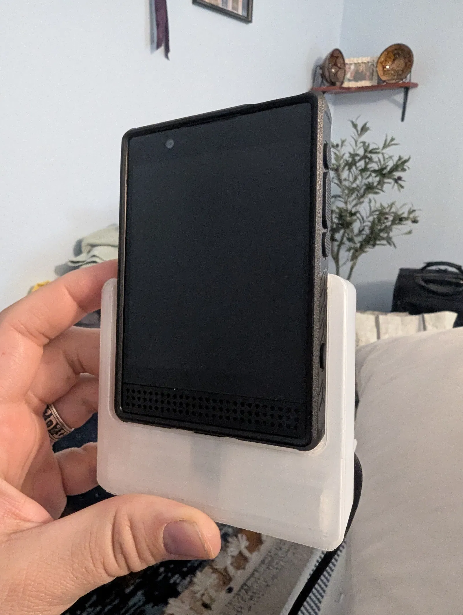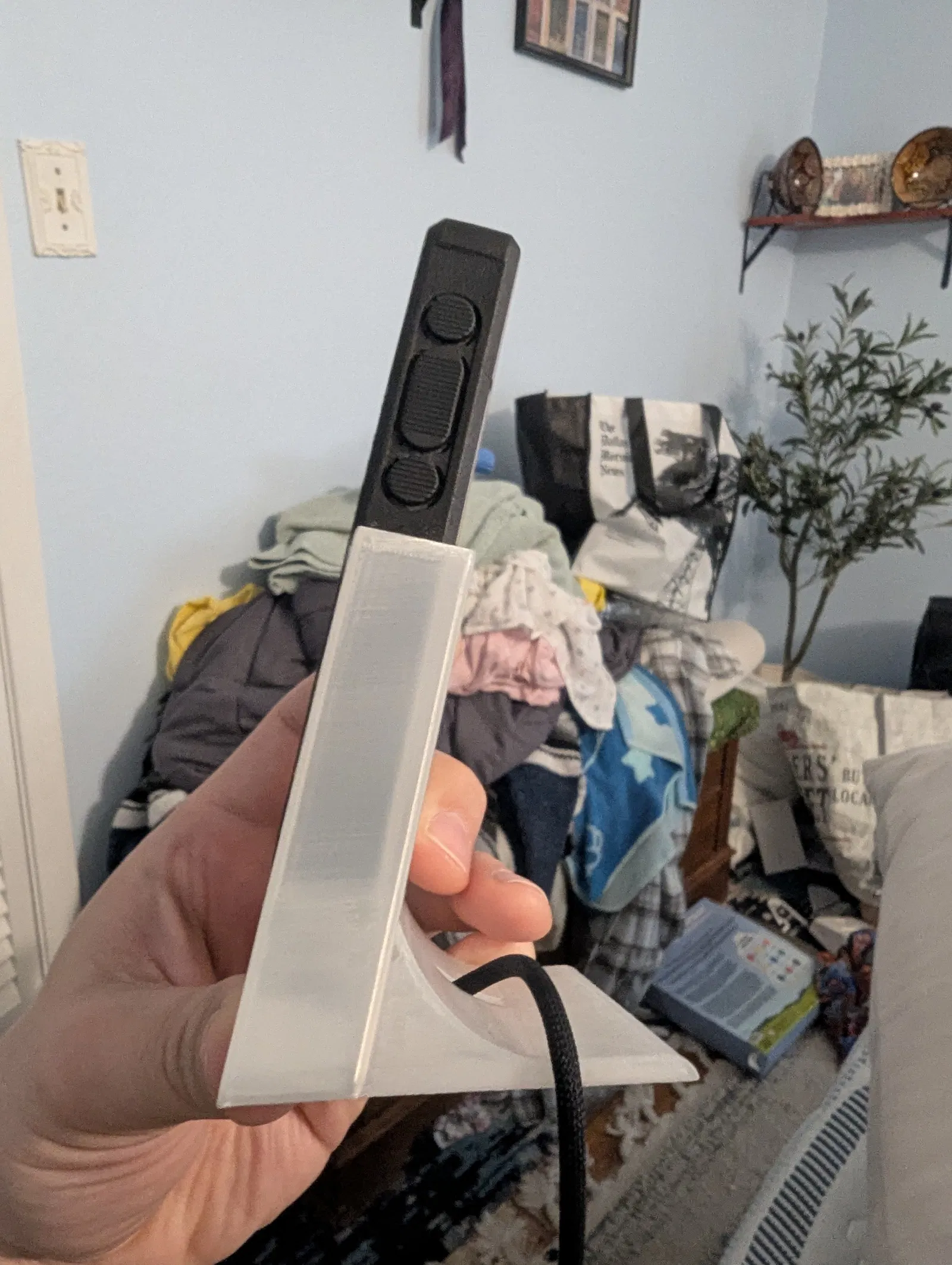 Mình đã thiết kế lại thành một khối liền lạc (one body piece) và nới rộng chỗ trống cho sợi cáp dễ luồn lách hơn. Mình cũng thêm một cái cạnh thứ hai để đỡ cái điện thoại chắc chắn hơn.