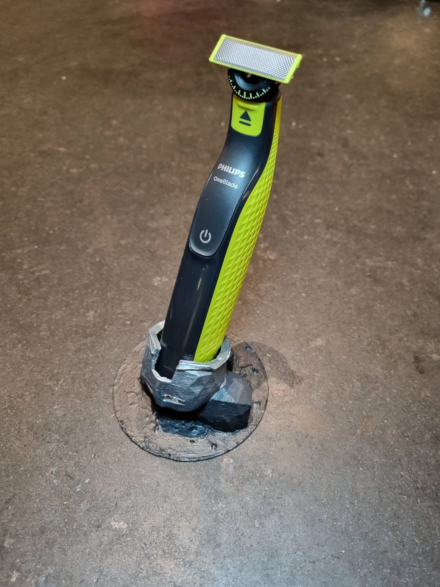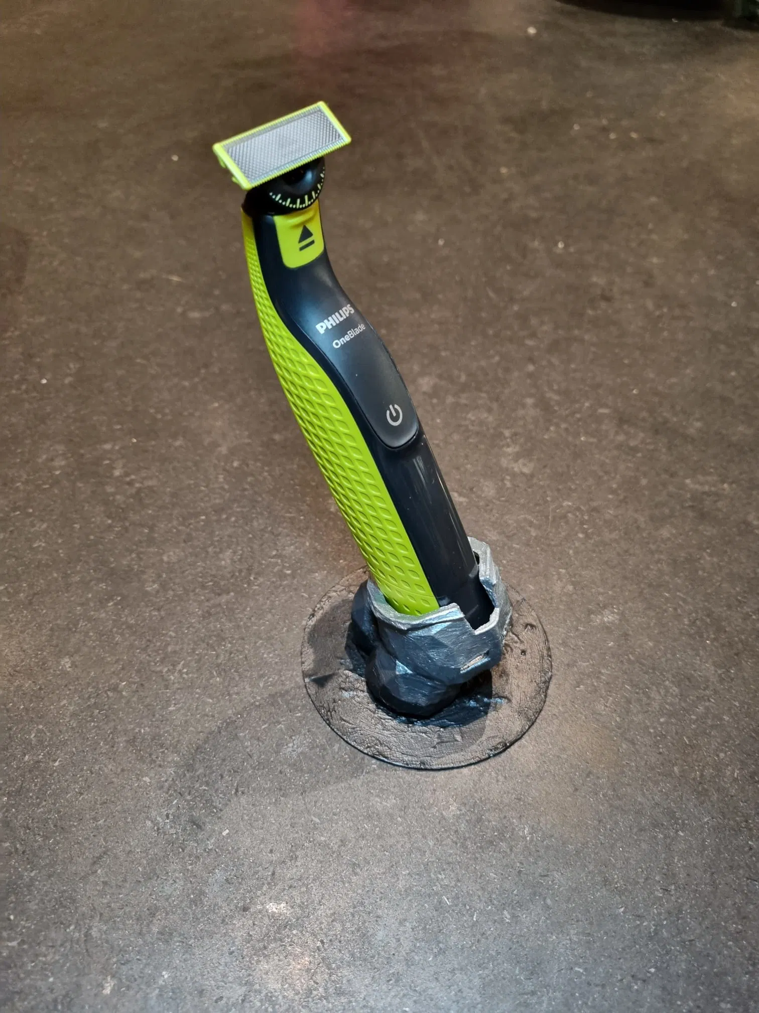 Stand/holder phong cách medieval cho Philips OneBlade (mũ giáp cắm trên tảng đá). Giữ máy vừa khít, dễ in và có thể in một màu rồi sơn acrylic; nên phủ clear coat để hạn chế bong tróc. Có thể scale tùy đời OneBlade.