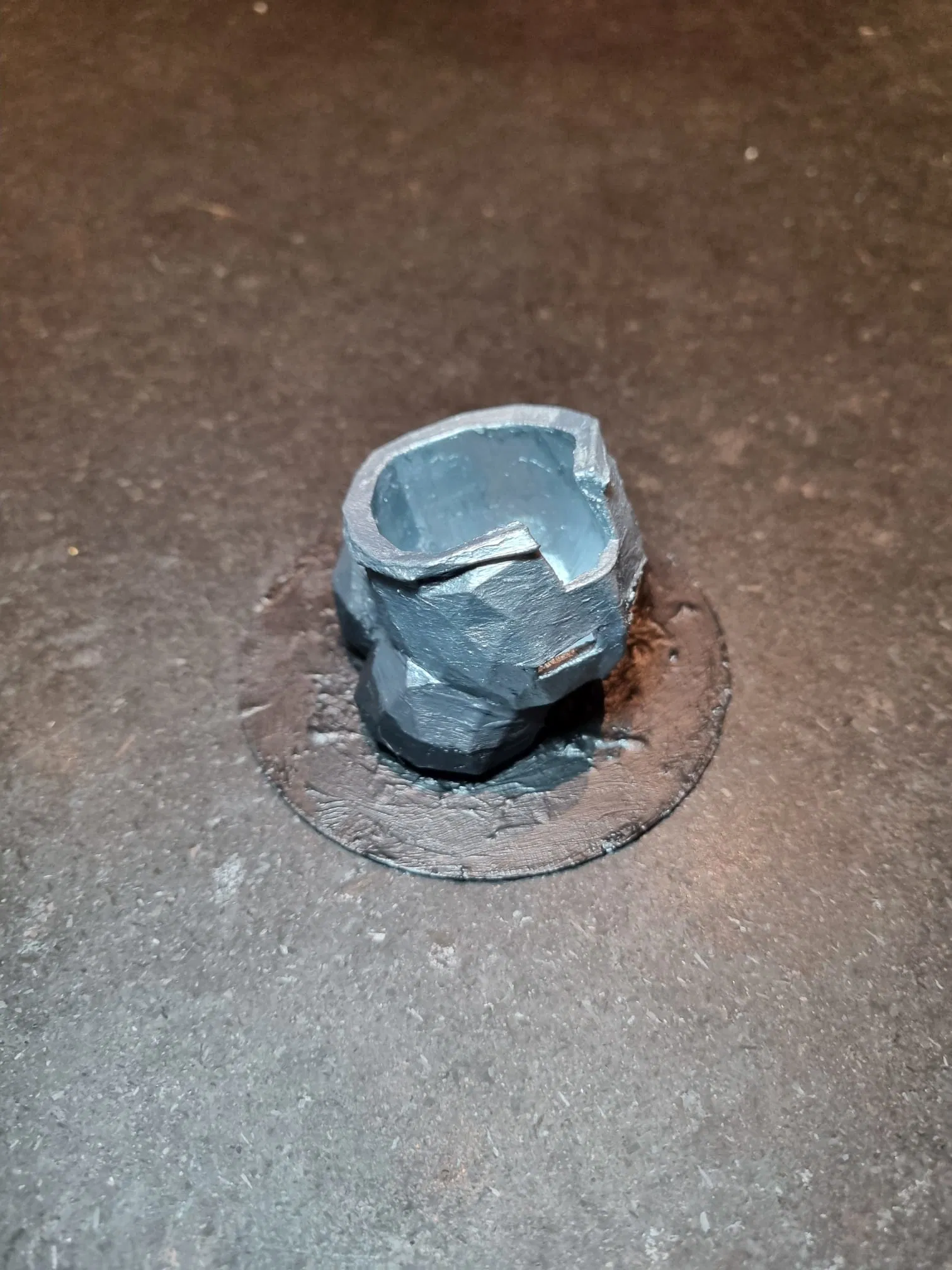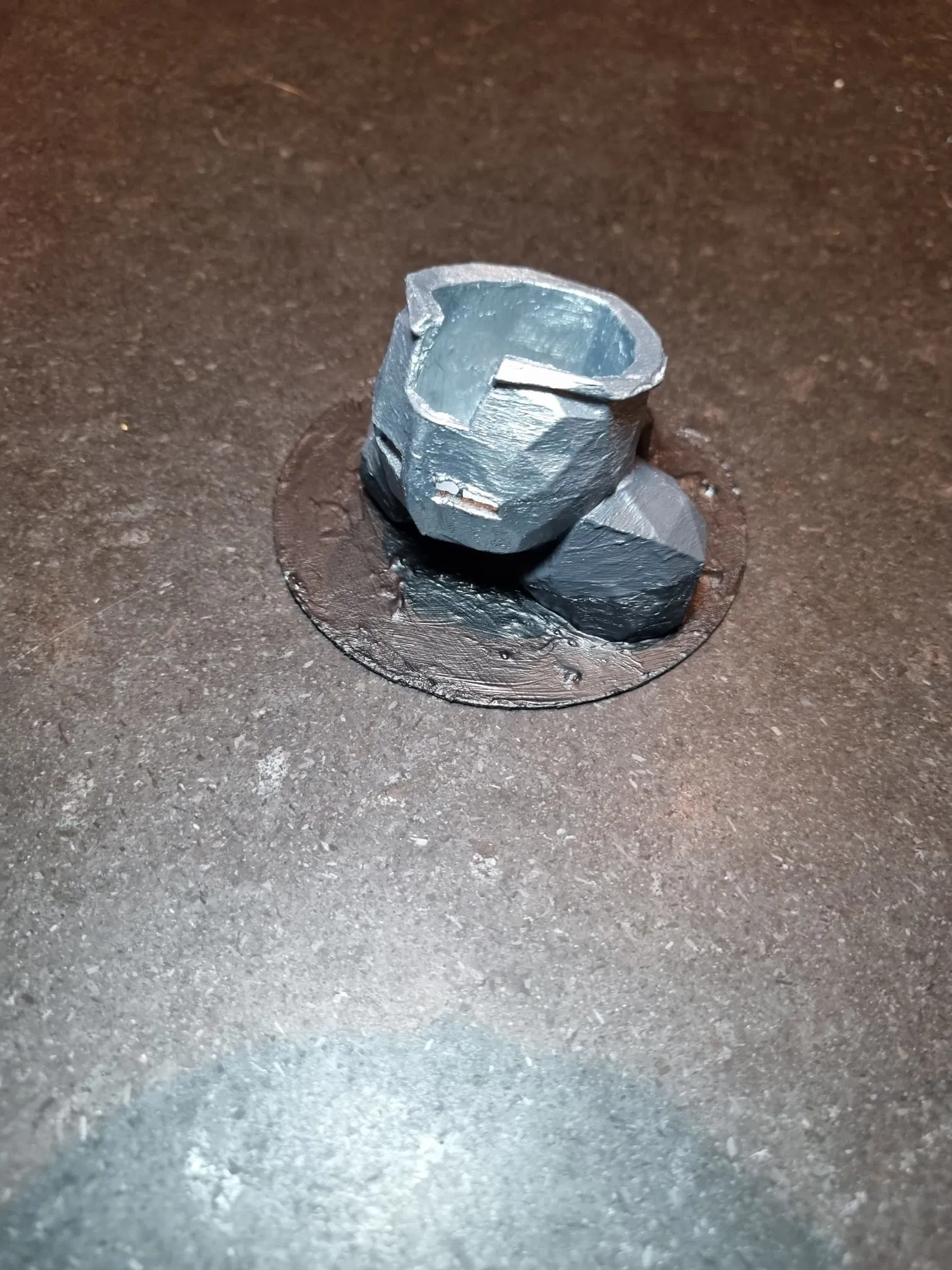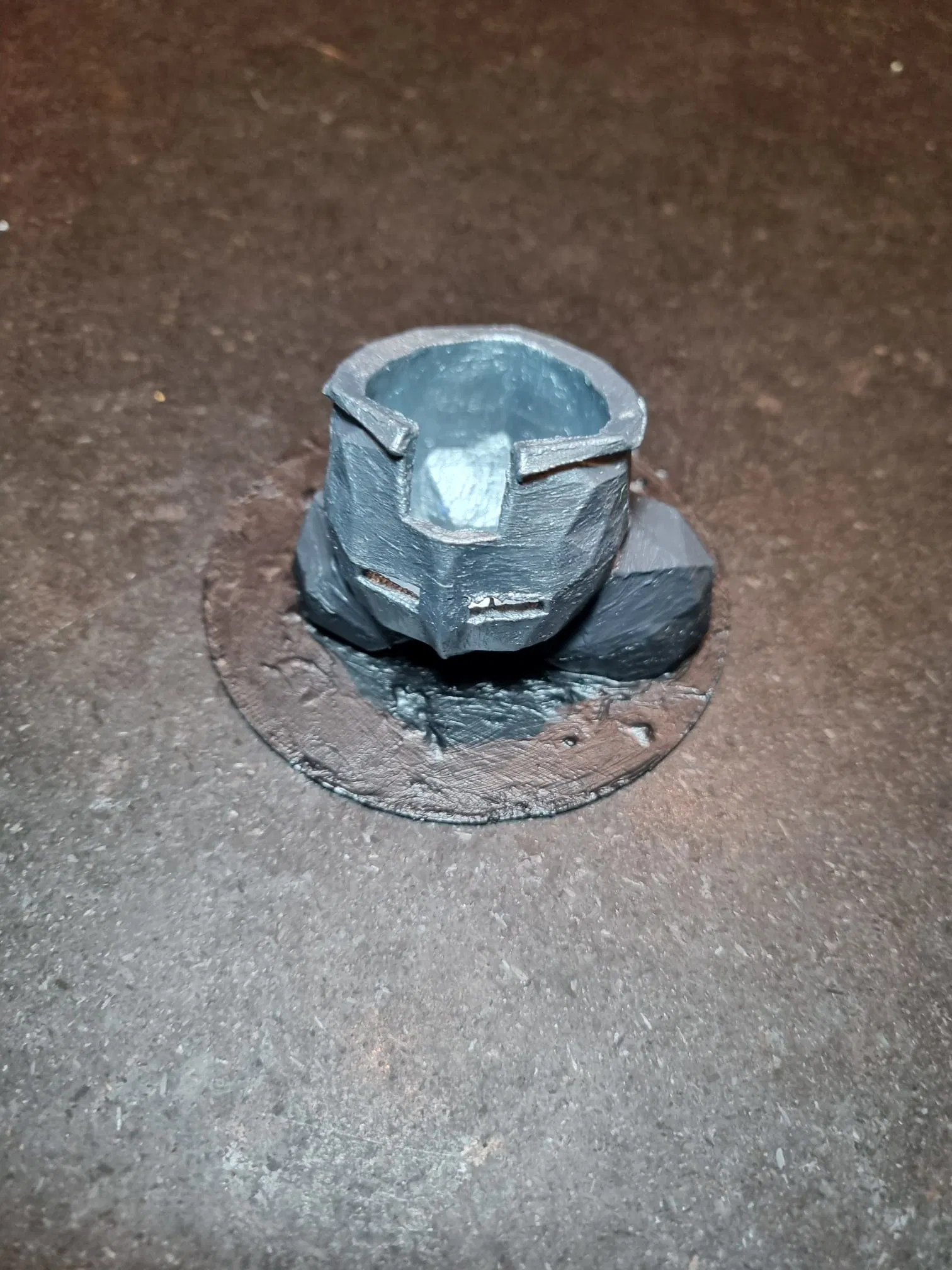 Nếu bạn muốn sơn theo đúng kiểu của mình: sơn toàn bộ cái mũ (helmet) màu bạc, phần đá màu xám đậm và dùng màu đậm hơn để tạo shade. Mình cũng sơn cái vòng tròn phía dưới màu đen, nhưng nếu bạn đặt trên mặt bàn/shelf màu trắng thì bạn có thể sơn phần đó màu trắng cho hợp. Sau khi sơn xong và để khô hoàn toàn thì kết quả sẽ trông như vầy: