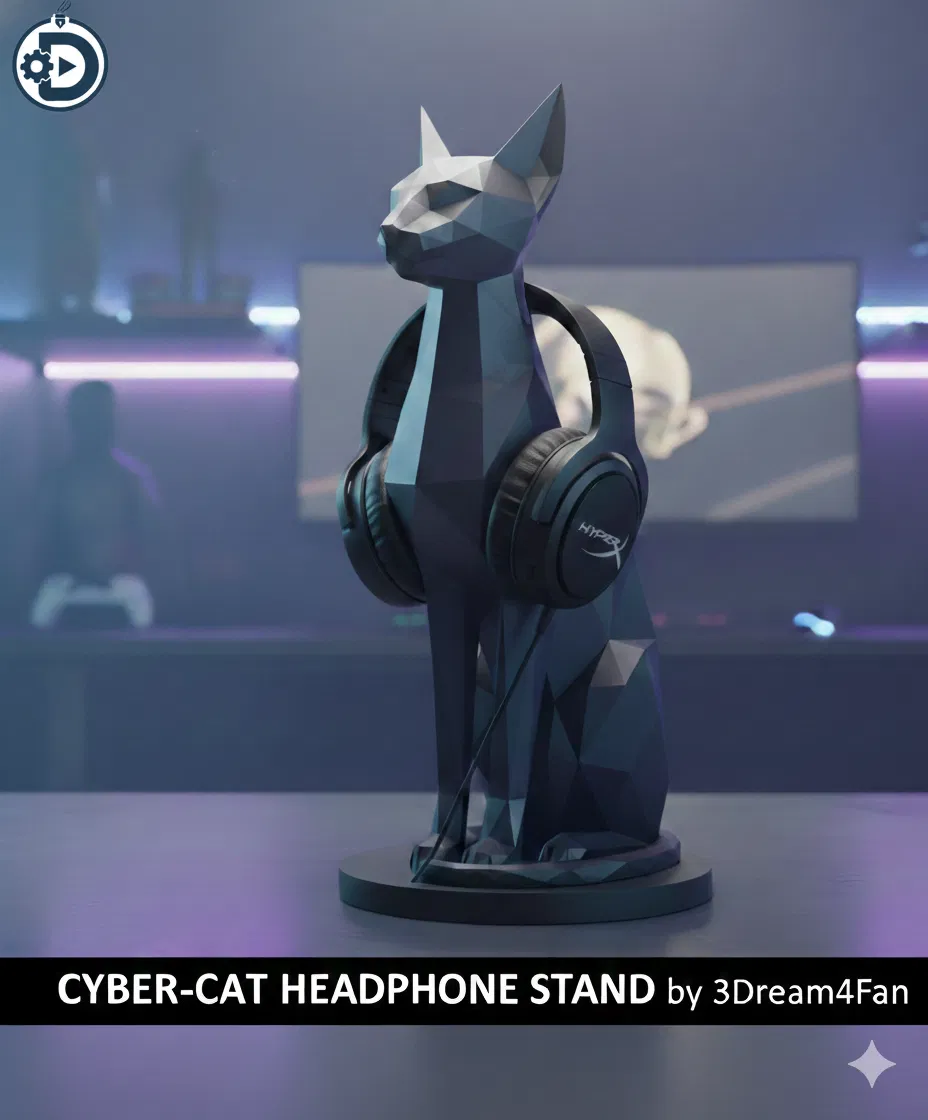 Cyber-Cat của 3Dream4Fan lấy cảm hứng Bastet Ai Cập, phối nét cổ điển với chất tương lai. Thiết kế low-poly vừa trang trí vừa dùng làm stand cho headset, kính, smartwatch; tối ưu in FDM và bệ vững chắc.