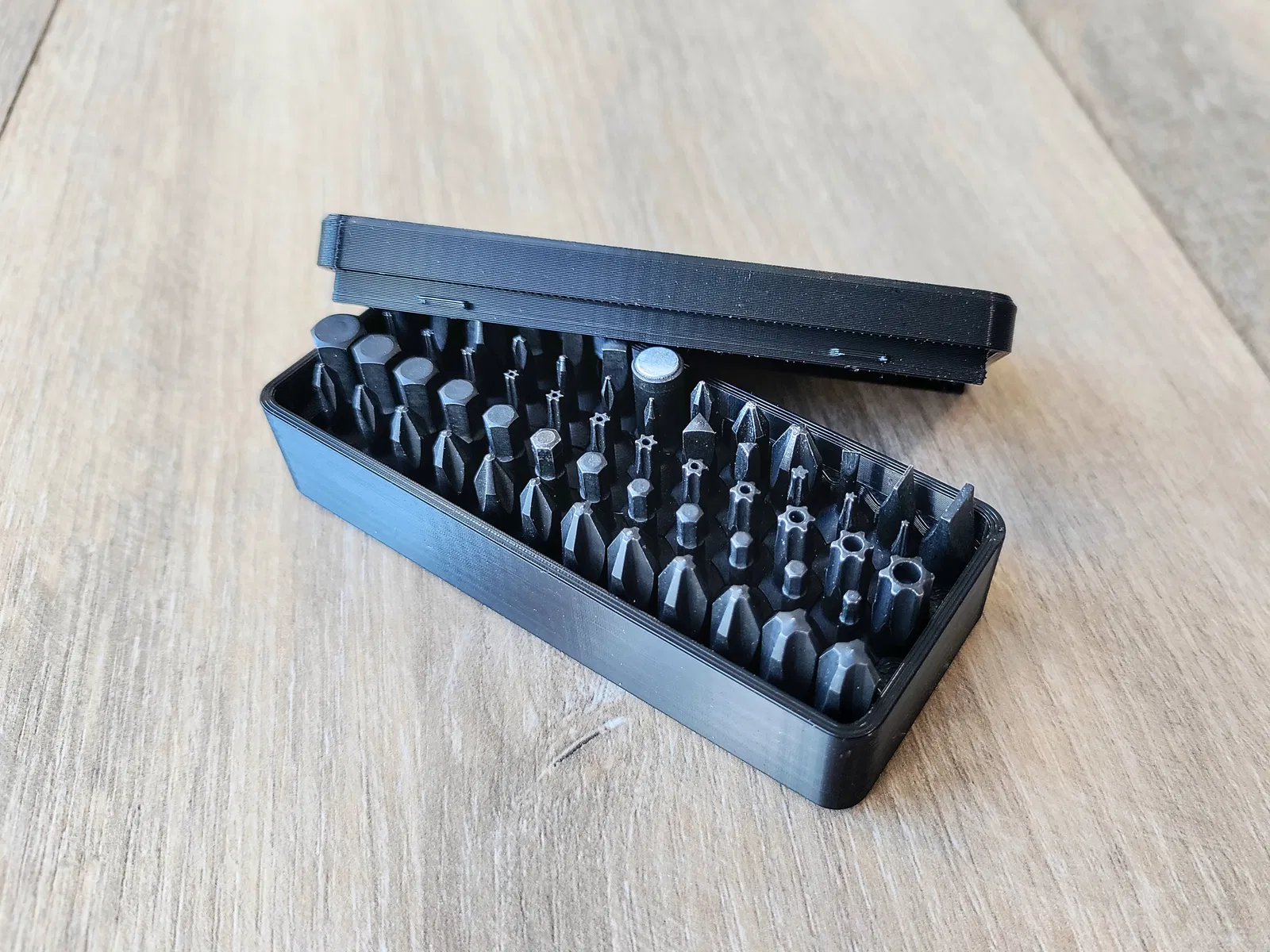 Hộp này được thiết kế để chứa 60 mũi bit ngắn của bộ tua vít LTT trong một form factor gọn nhẹ, ưu tiên tiết kiệm không gian hơn là dễ thao tác lấy bit. Do các bit đặt sát nhau nên không thể lấy đồng thời các bit liền kề, nhưng bạn vẫn có thể lấy cùng lúc nhiều bit không liền kề (xem hình).
