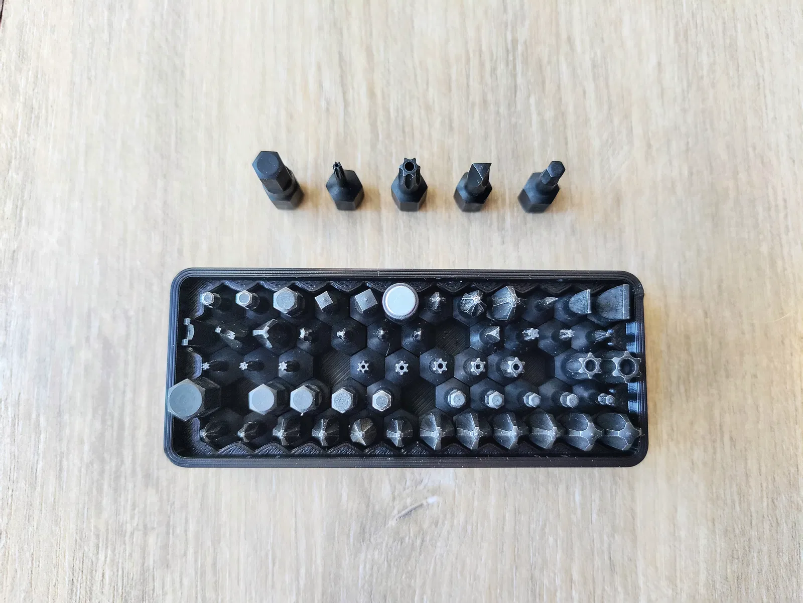 Để xài tiện hơn, mình khuyên bạn sắp xếp bit từ lớn tới nhỏ ở một hàng, rồi đảo ngược thứ tự ở hàng kế bên. Mẫu này mình in bằng Amazon Black PLA, nhưng bạn có thể dùng bất kỳ loại filament nào bạn thích.