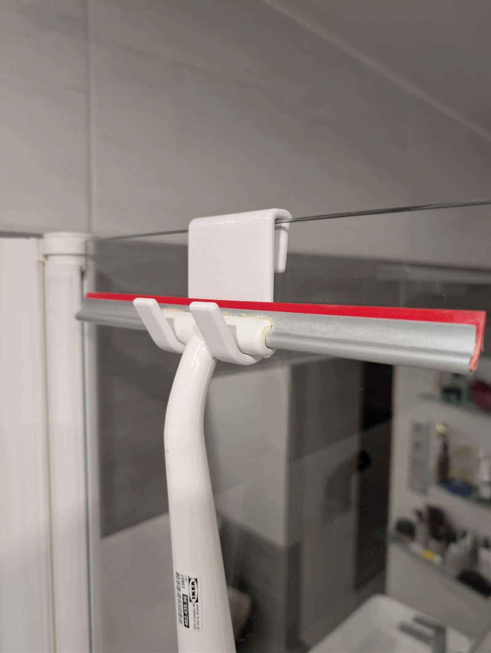 Một holder squeegee đơn giản và thực tế, có thể móc trực tiếp lên kính phòng tắm.