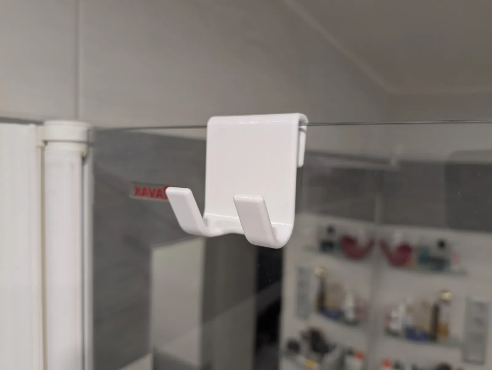 Đây là một cái holder stěrka (squeegee) đơn giản và tiện dụng, chỉ cần móc lên kính của vách tắm đứng.