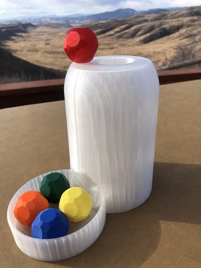 Đồ chơi cho em bé kiểu Montessori Object Permanence nhưng bản “over engineered”: bóng chạy theo đường xoắn ốc trước khi rơi ra, tạo tiếng và độ trễ lâu hơn. Có kèm file nguồn OpenSCAD; in cần manual supports ở lỗ ra (xem 3MF).