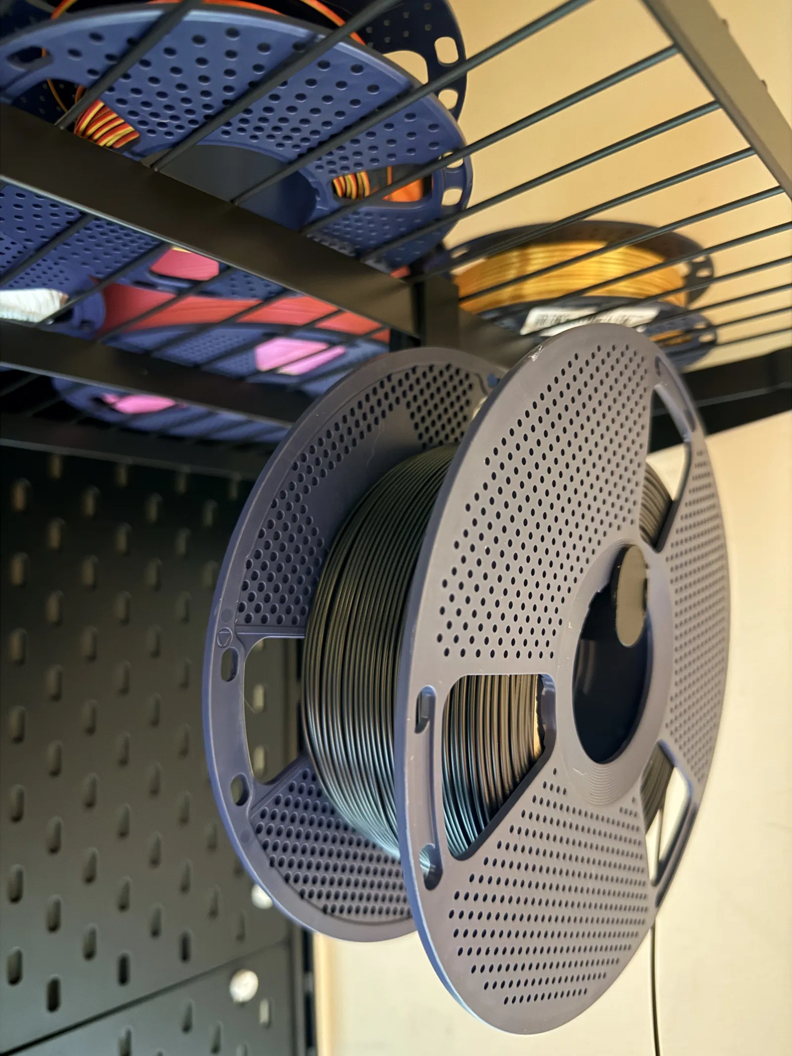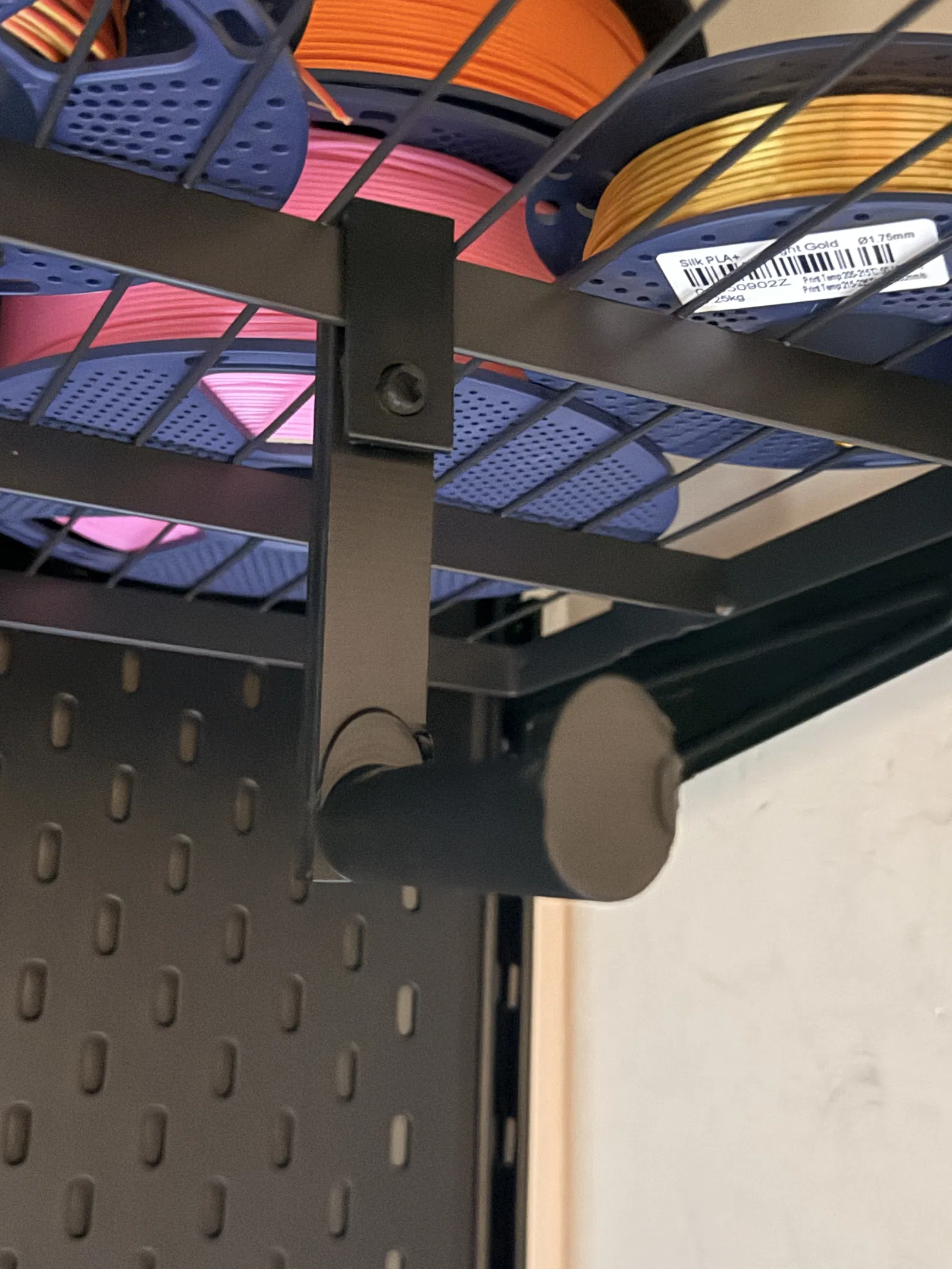 Treo cuộn filament lên thanh ngang của kệ lưới (wire shelf). Mình dùng trên kệ Ikea Boaxel.
